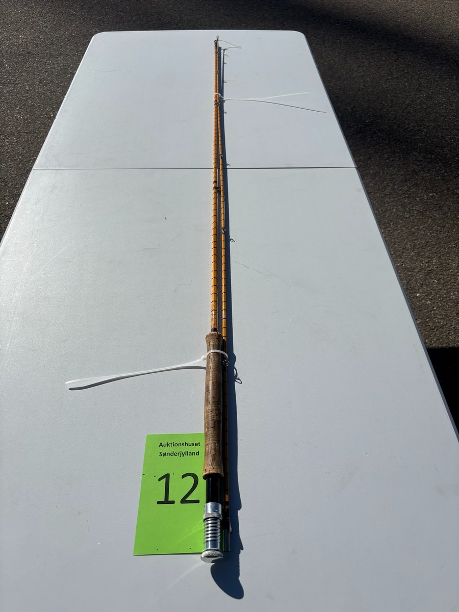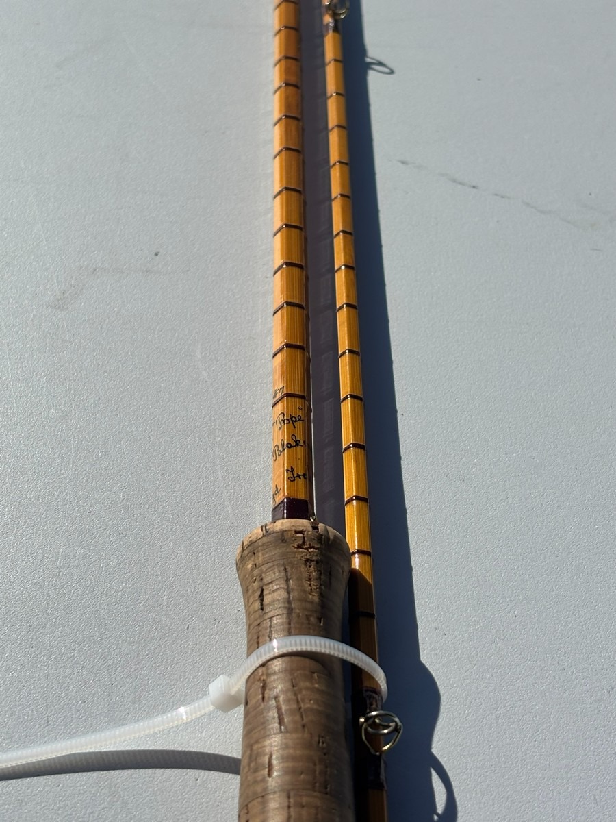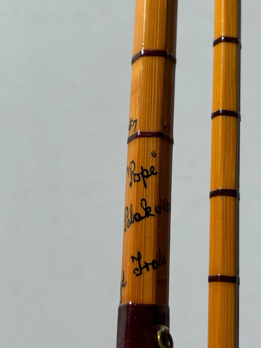 Ældre klassisk fiskestang i splitcane (bambus), håndskrevet mærket “The Pope” samt yderligere model-/værkstedsangivelse, Ca 8–9 fod.. Fremstår i pæn stand. Fra dødsbo