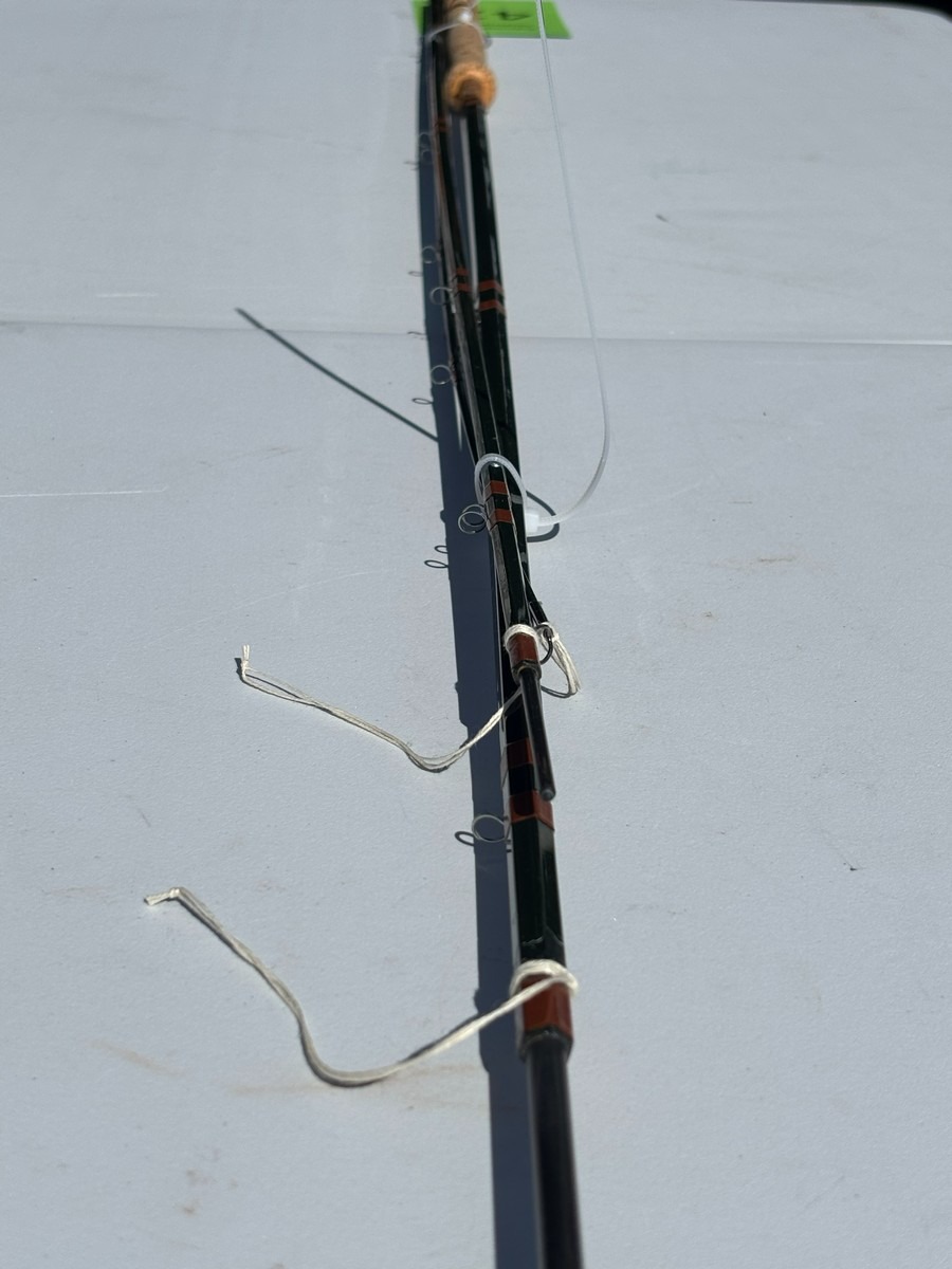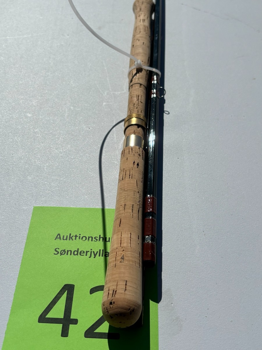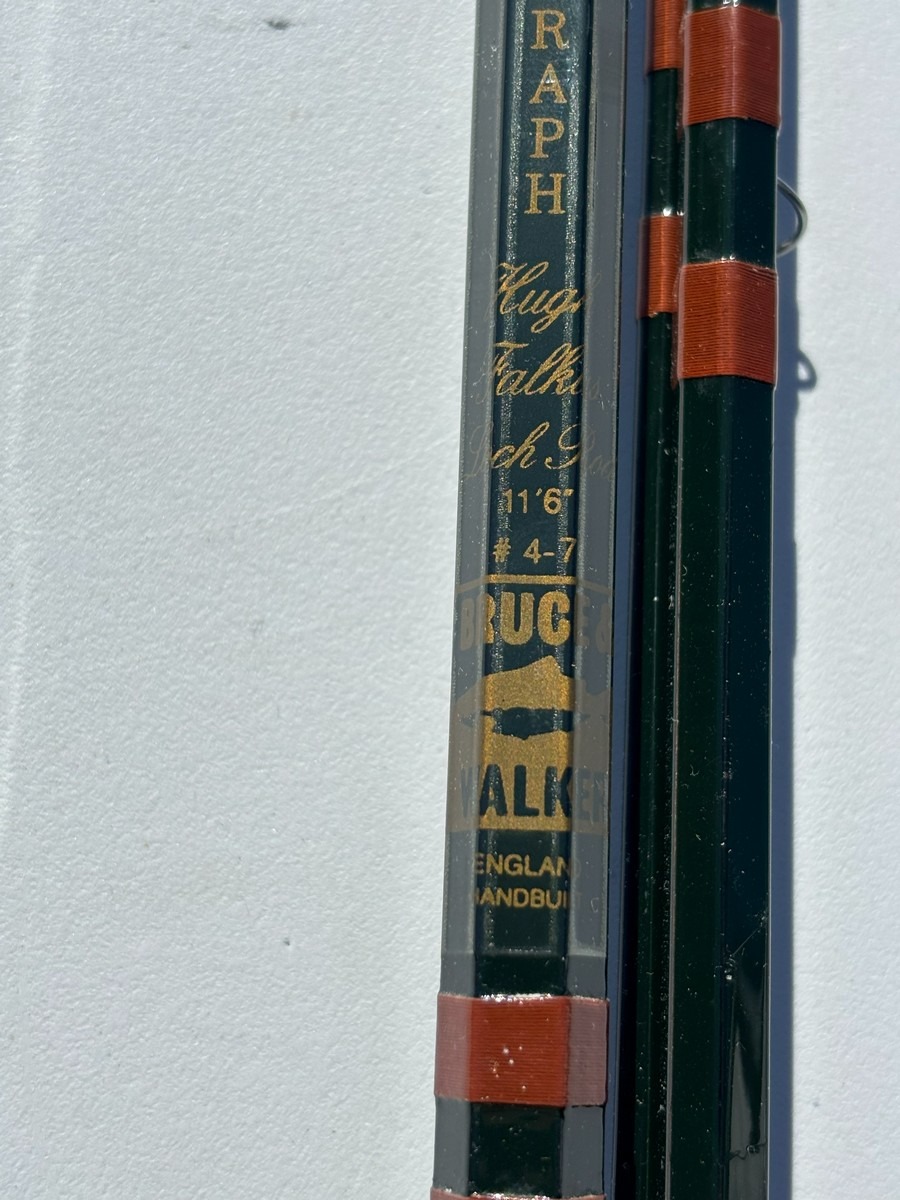 Stangen fremstår i mørk finish med karakteristiske rødbrune beviklinger, klassiske øjer samt korkhåndtag med tydelig, men pæn brugspatina. Original mærkning “Bruce & Walker – England – Handbuilt” er bevaret.