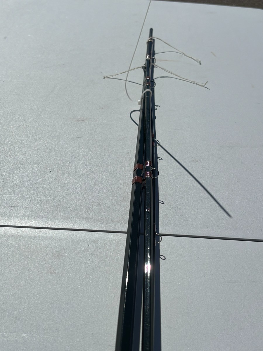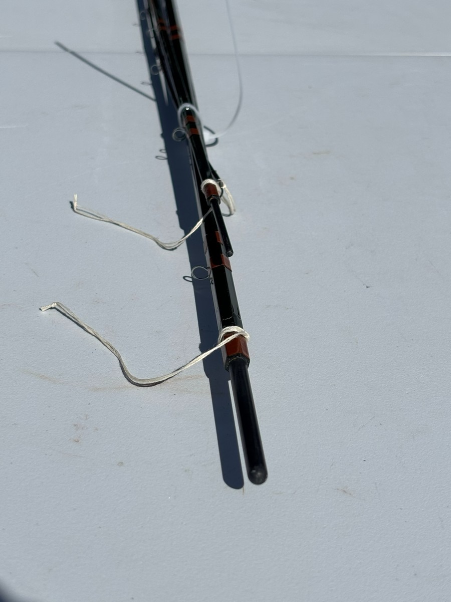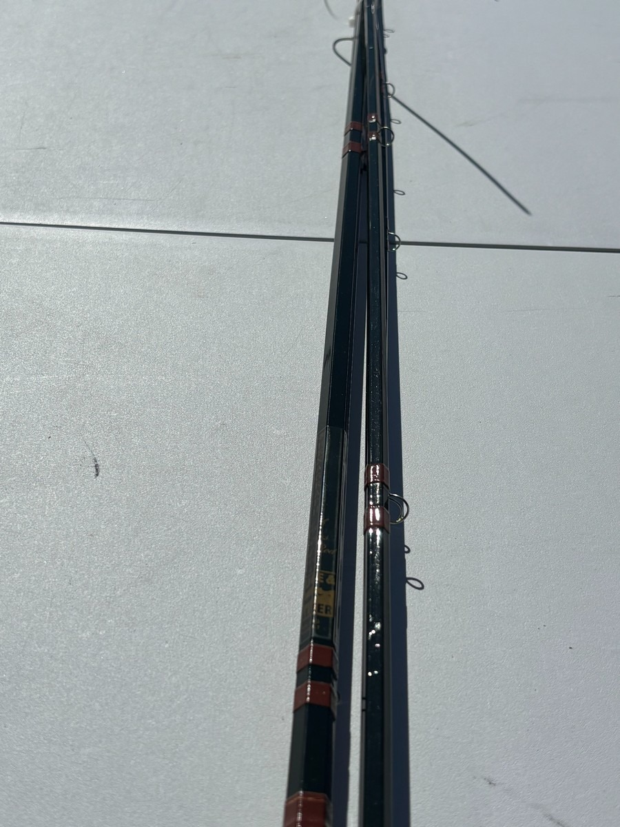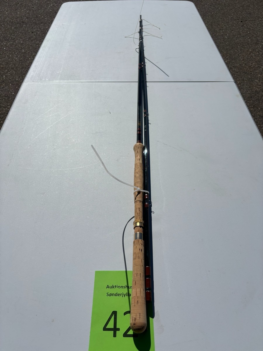 Stangen fremstår i mørk finish med karakteristiske rødbrune beviklinger, klassiske øjer samt korkhåndtag med tydelig, men pæn brugspatina. Original mærkning “Bruce & Walker – England – Handbuilt” er bevaret.