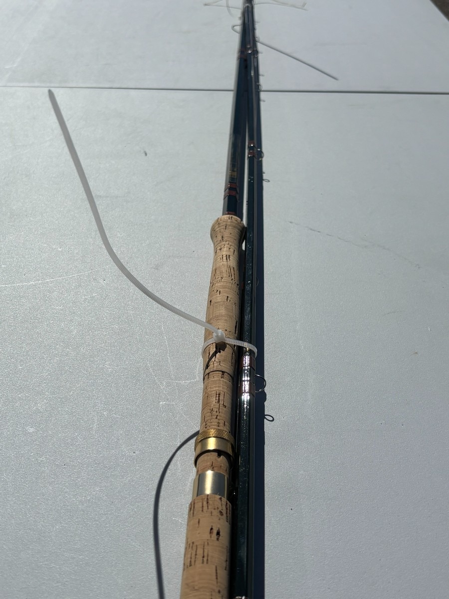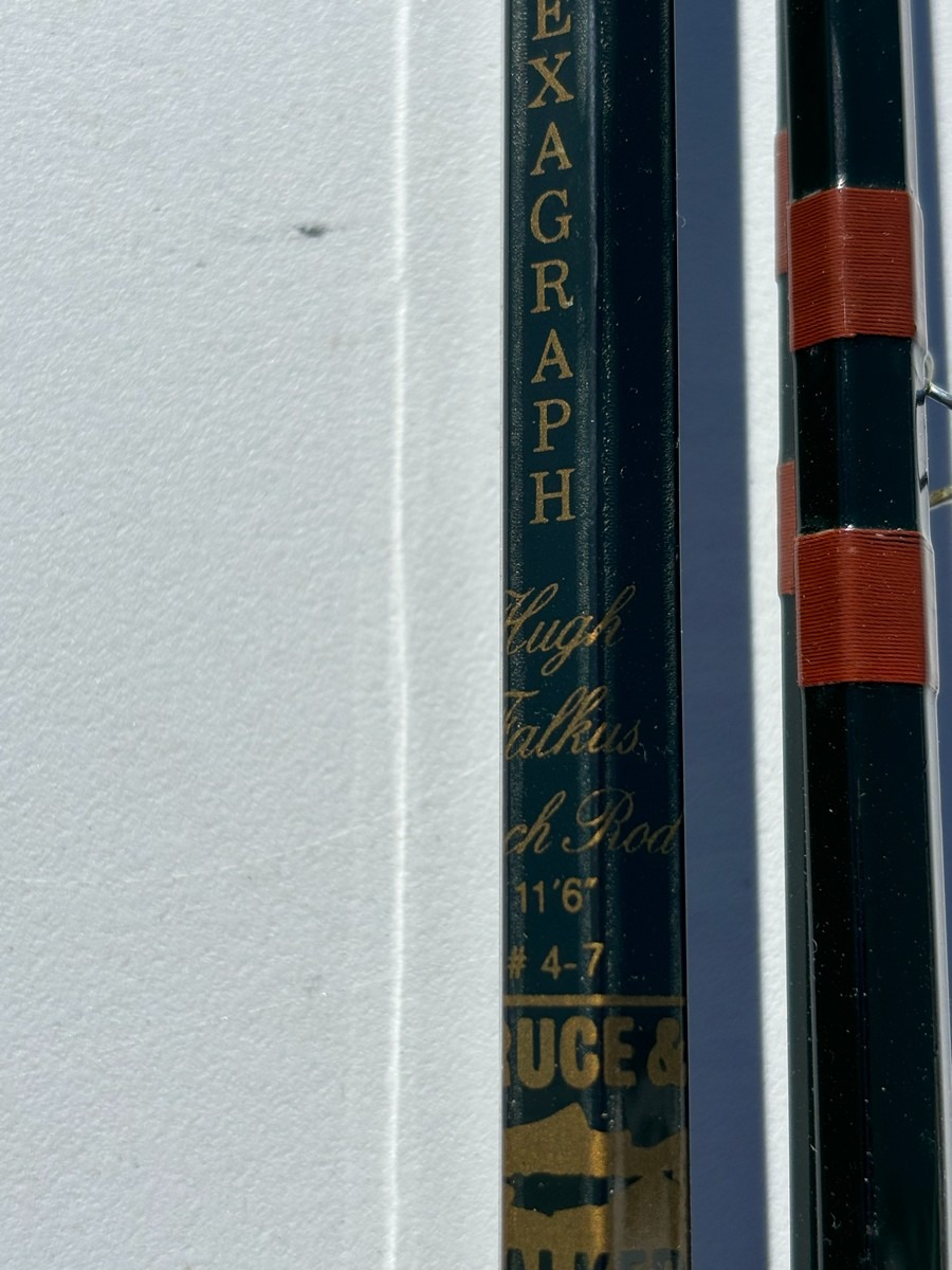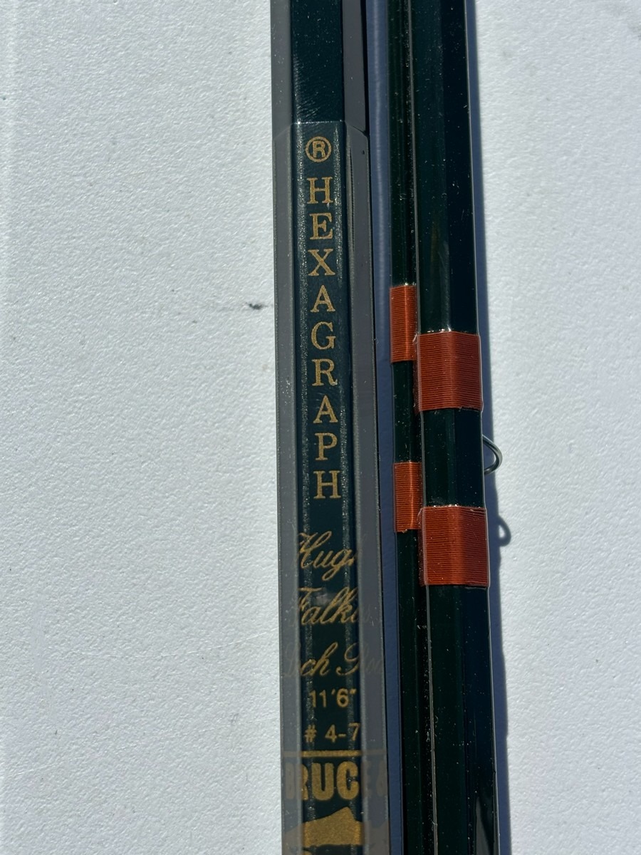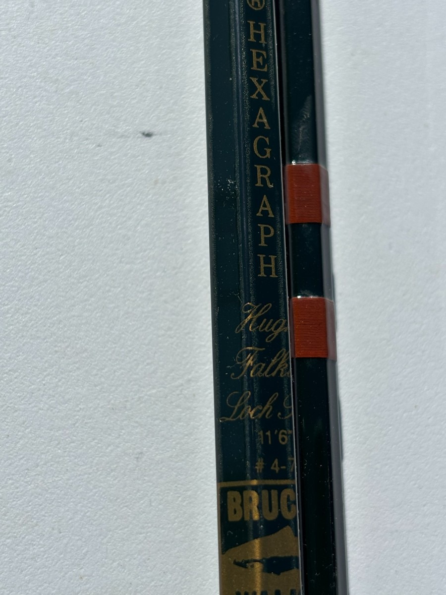 På klingen ses original påskrift: “Hexagraph – Hugh Falkus Loch Rod – 11’6’’ – #4–7”, hvilket indikerer en alsidig stang udviklet i samarbejde med den kendte fisker Hugh Falkus, velegnet til både sø- og lettere laksefiskeri.