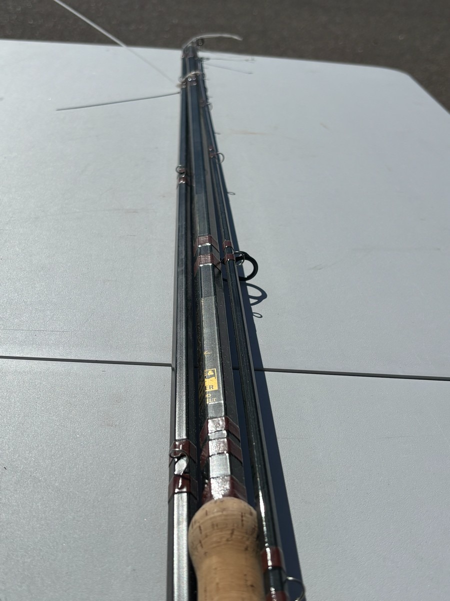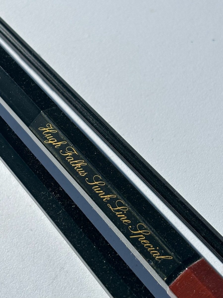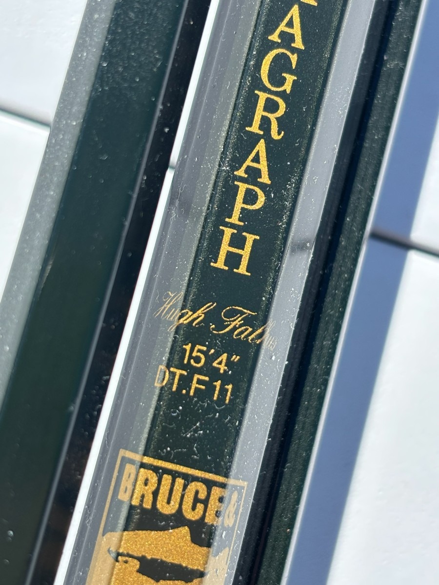 Kraftig og klassisk tohånds fluestang fra engelske Bruce & Walker, model Hexagraph – Hugh Falkus. Stangen er mærket 15’4” og klasse DTF #11, hvilket gør den velegnet til tungt laksefiskeri i større elve.