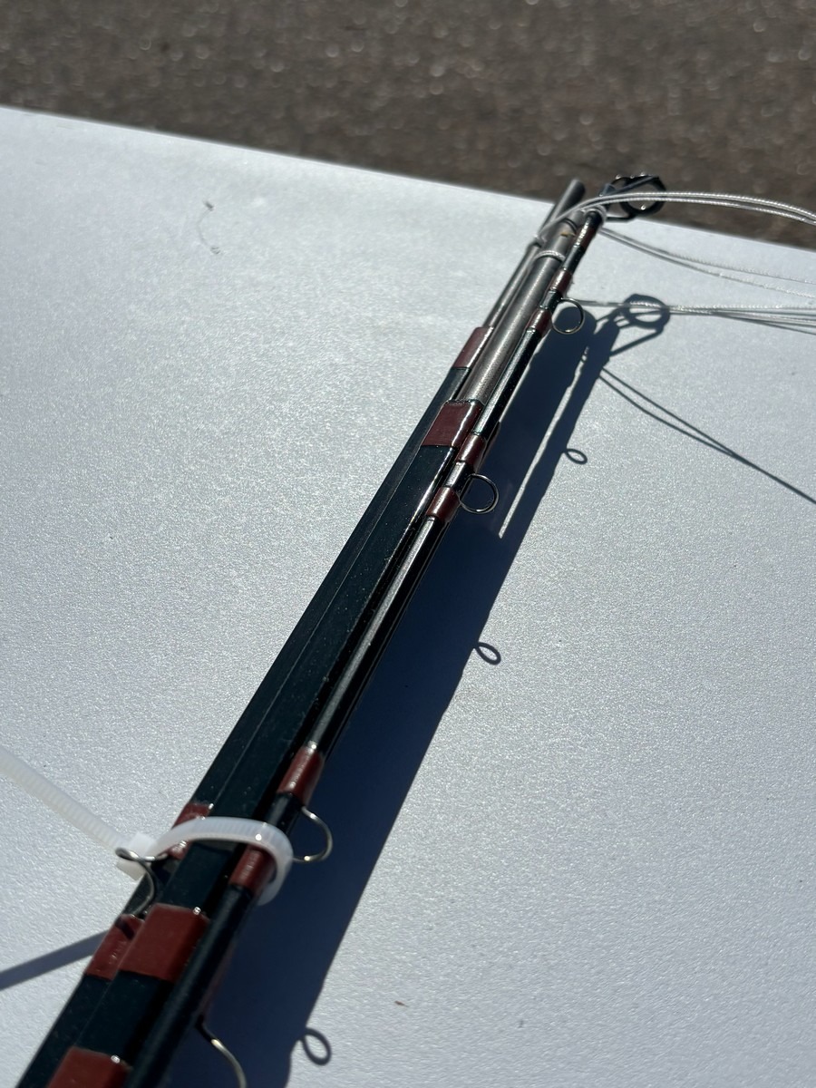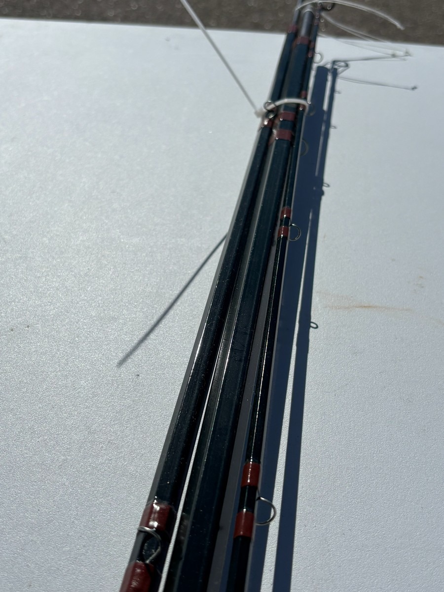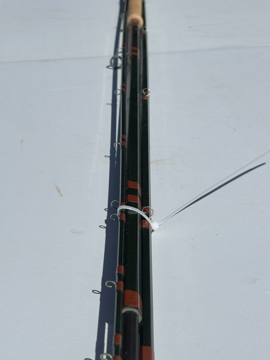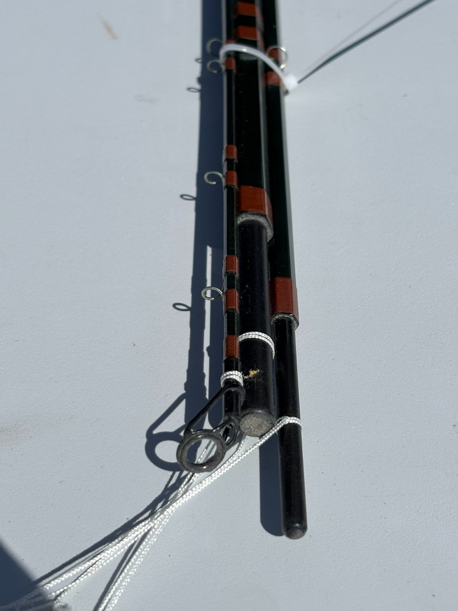 Kraftig og klassisk tohånds fluestang fra engelske Bruce & Walker, model Hexagraph – Hugh Falkus. Stangen er mærket 15’4” og klasse DTF #11, hvilket gør den velegnet til tungt laksefiskeri i større elve.
