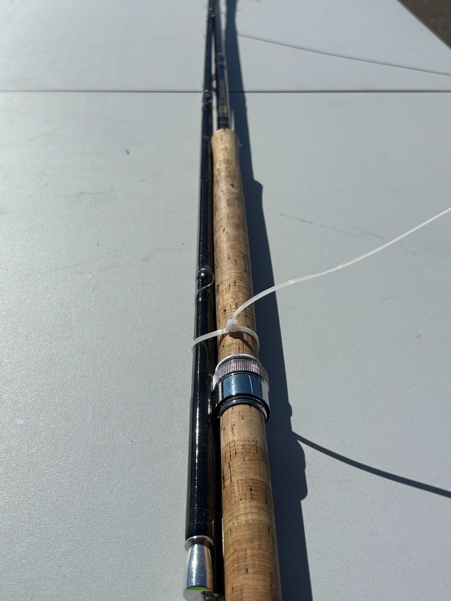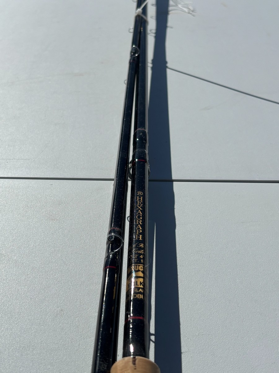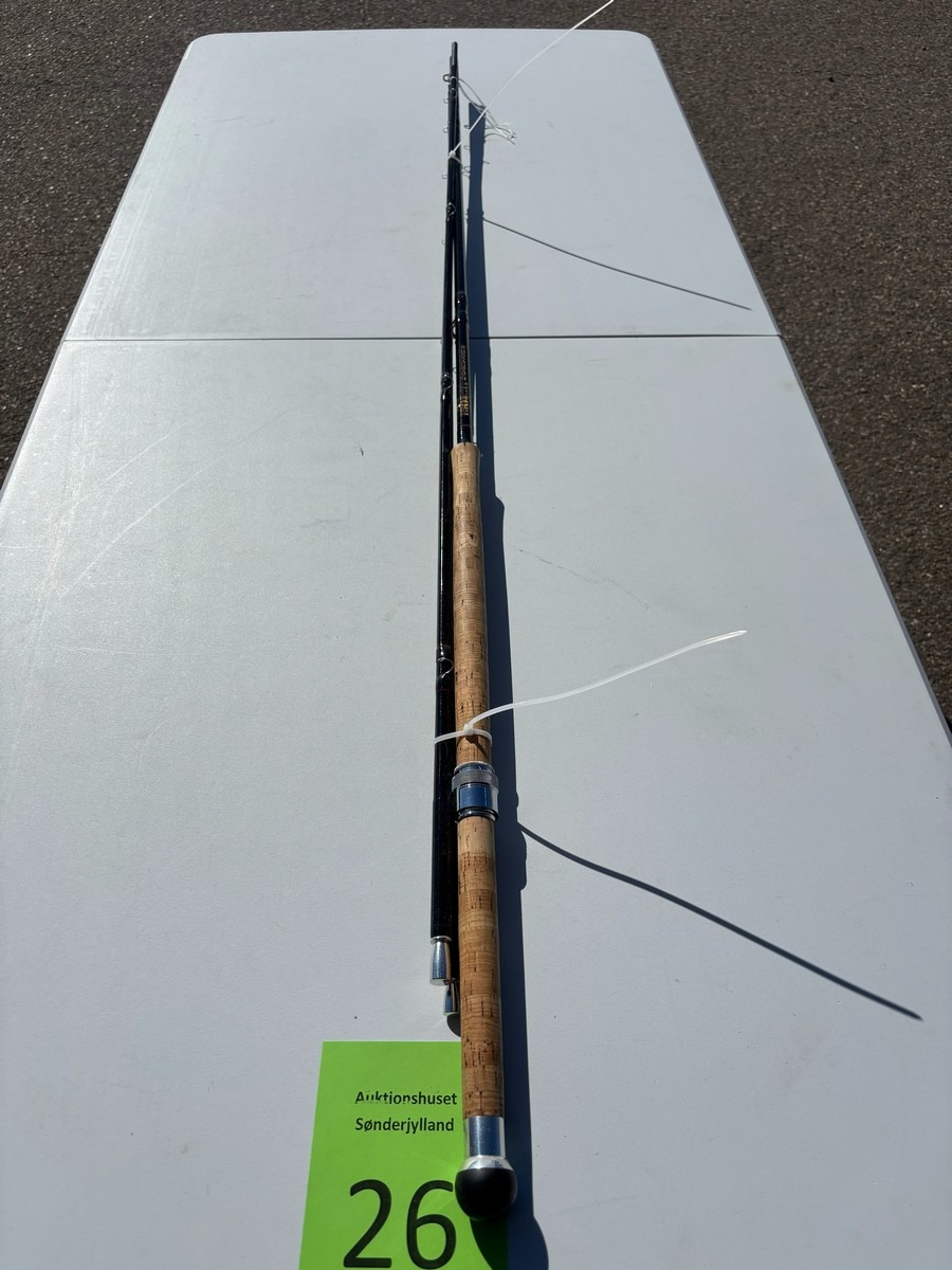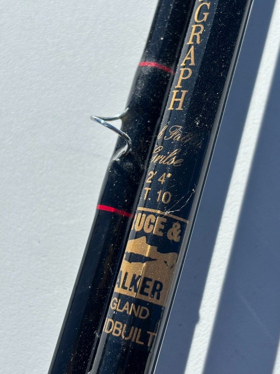Kraftig og klassisk fluestang fra engelske Bruce & Walker, model “Hexagraph Salmon Fly”. Stangen er mærket 12’4” (ca. 376 cm) og lineklasse #10, hvilket gør den velegnet til laksefiskeri og andet tungt fluefiskeri.