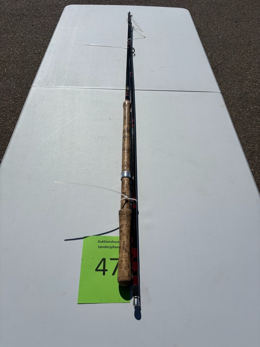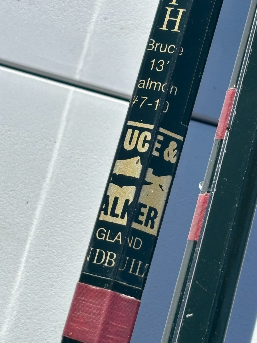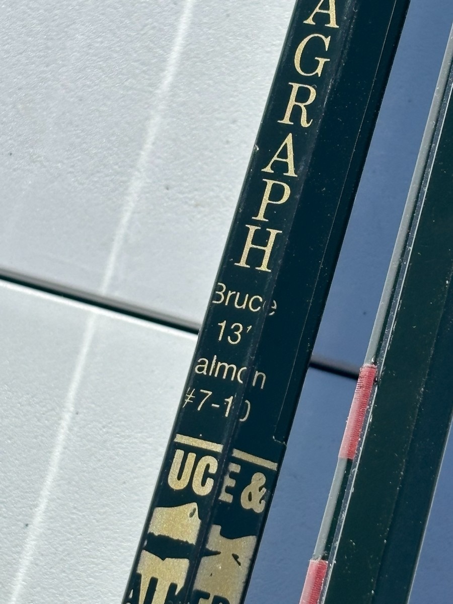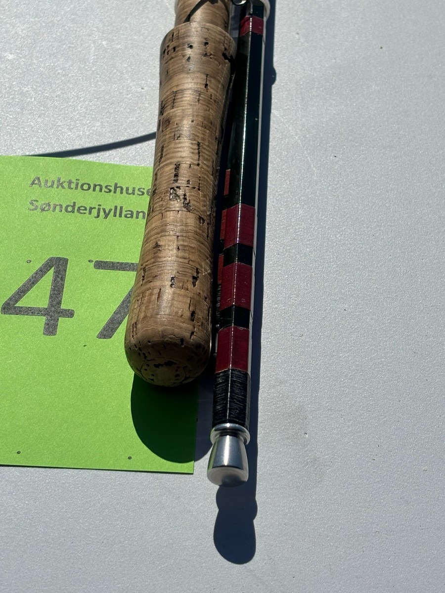 Fluestang fra House of Hardy / Bruce & Walker, England, model “Hexagraph Salmon”. Længde 13’ og lineklasse #7–10, som angivet på stangen. Udført i mørk grafit med røde beviklinger, klassiske øjer samt korkhåndtag og metalhjulholder. Mærket “Handbuilt”. Fremstår i brugt stand med almindelige brugsspor, herunder mindre ridser og slitage i lak og tryk, men uden umiddelbart synlige større skader. En solid tohåndsstang velegnet til laksefiskeri