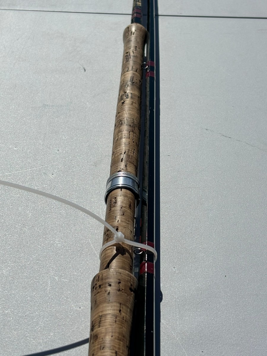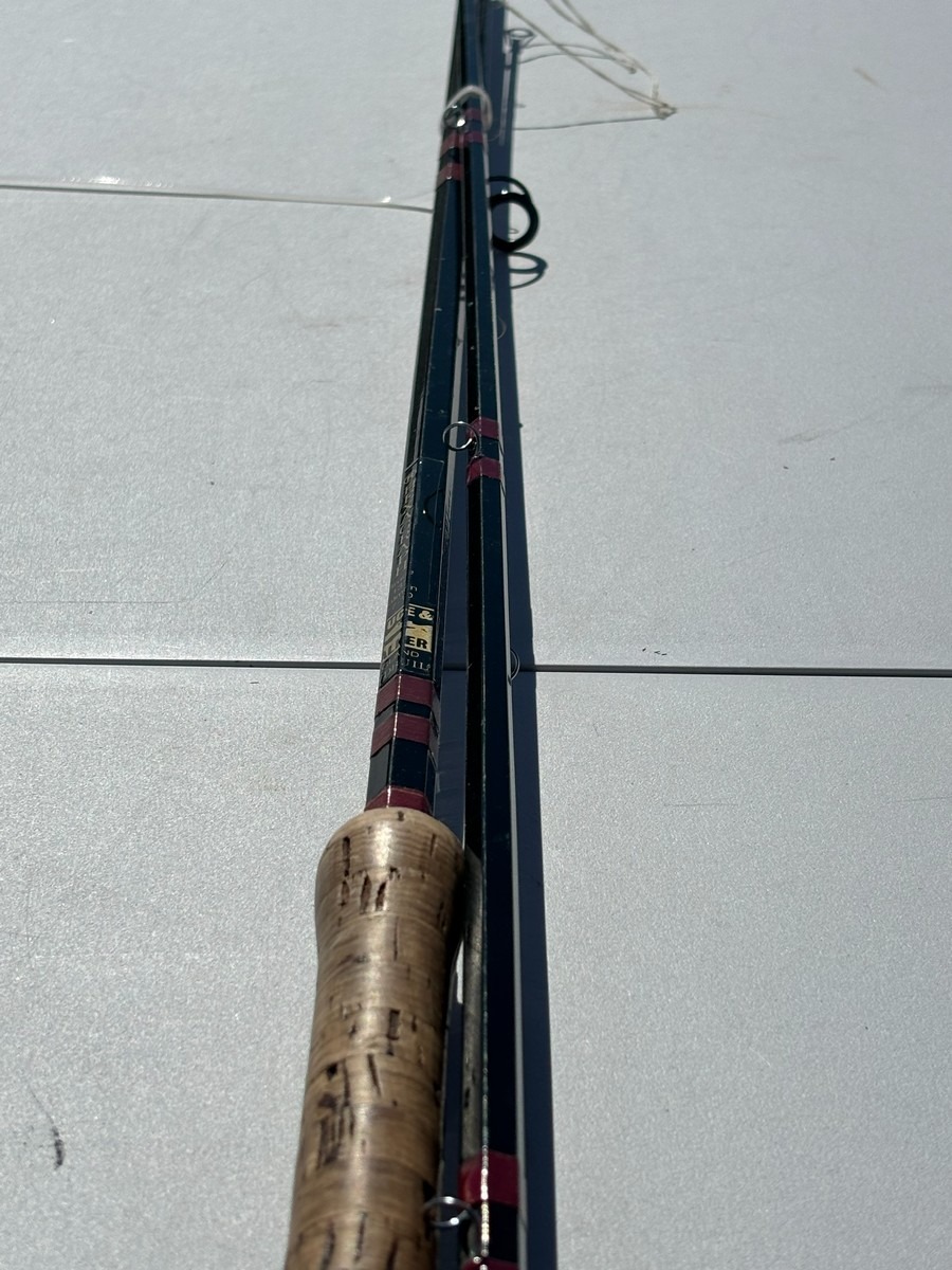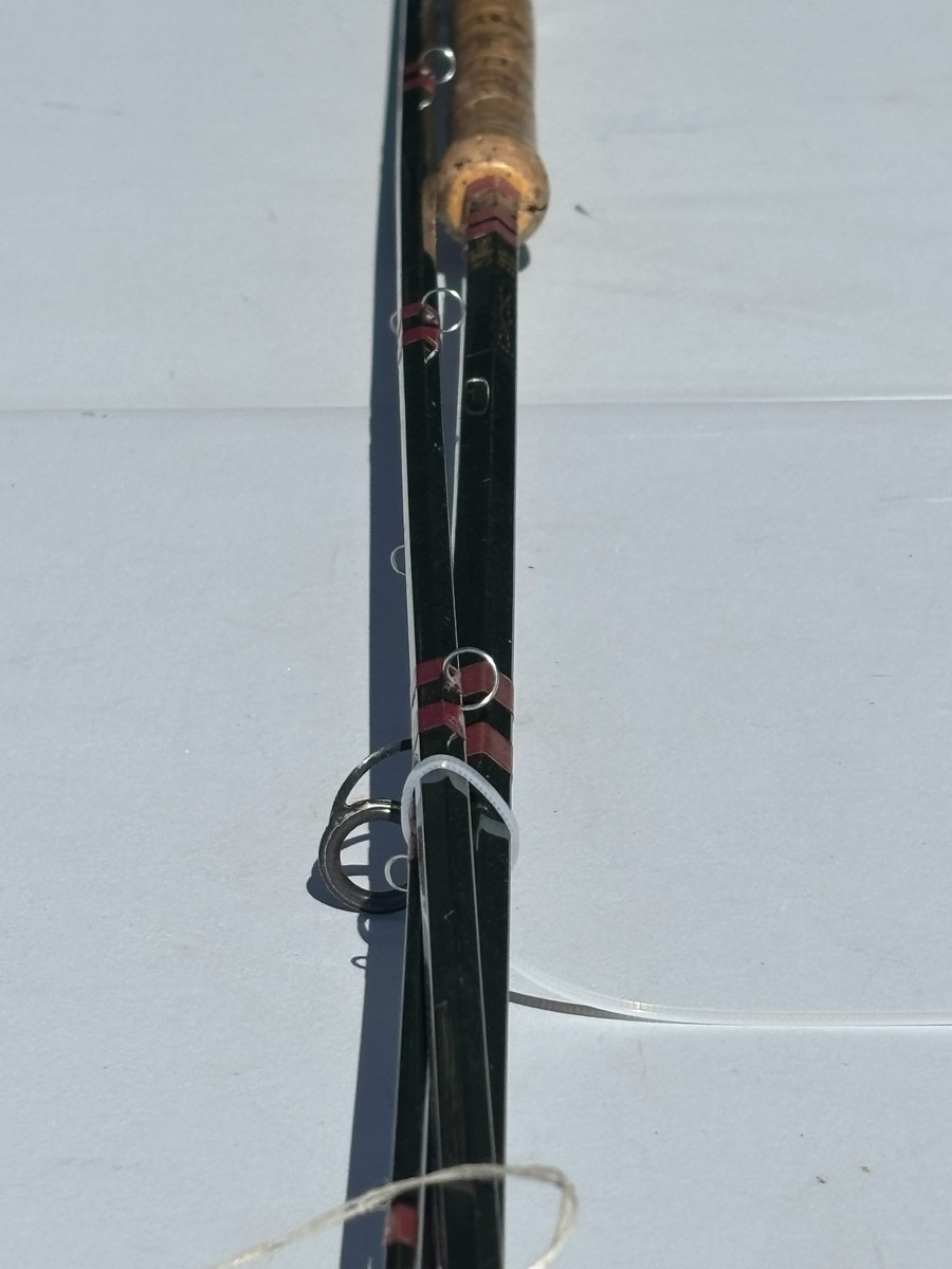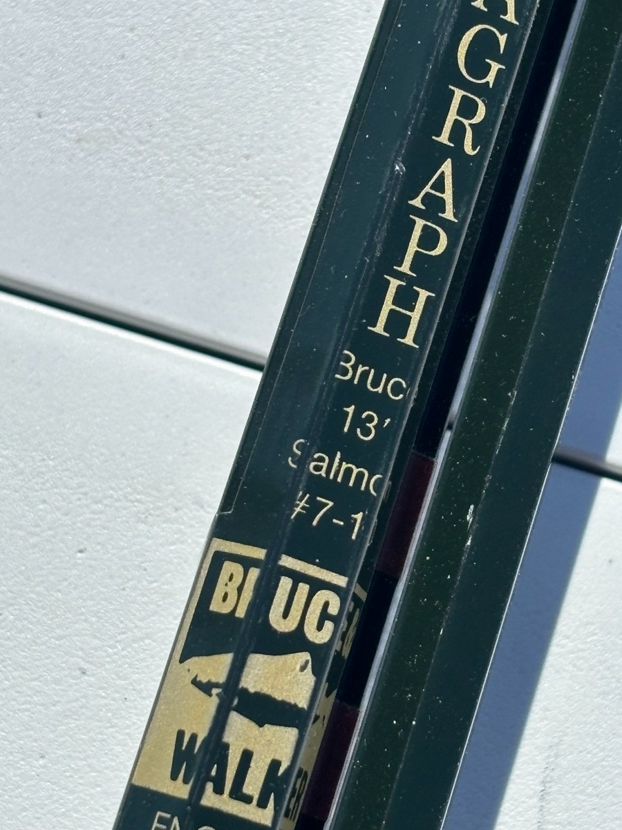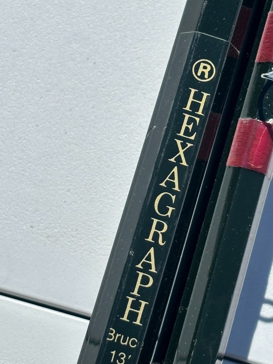Fluestang fra House of Hardy / Bruce & Walker, England, model “Hexagraph Salmon”. Længde 13’ og lineklasse #7–10, som angivet på stangen. Udført i mørk grafit med røde beviklinger, klassiske øjer samt korkhåndtag og metalhjulholder. Mærket “Handbuilt”. Fremstår i brugt stand med almindelige brugsspor, herunder mindre ridser og slitage i lak og tryk, men uden umiddelbart synlige større skader. En solid tohåndsstang velegnet til laksefiskeri