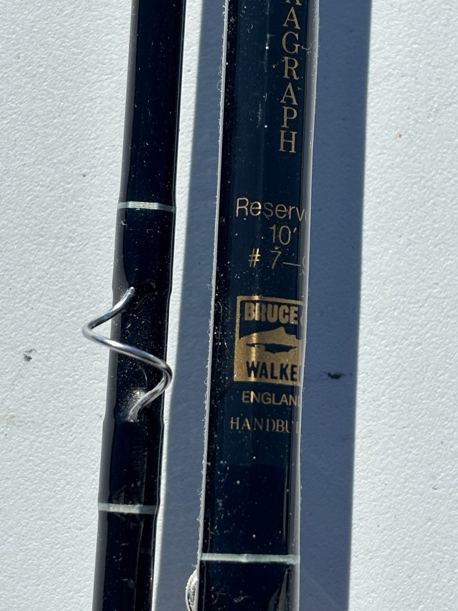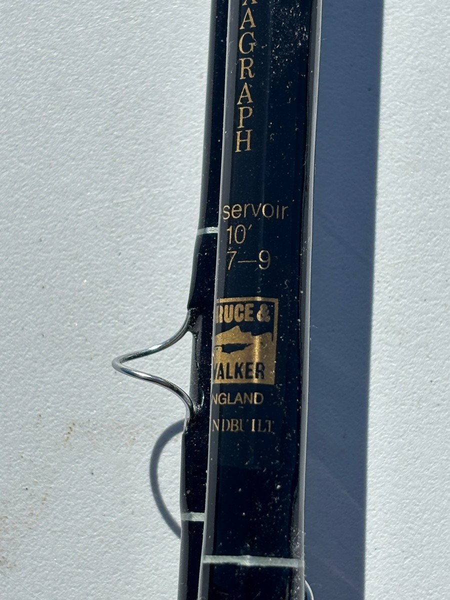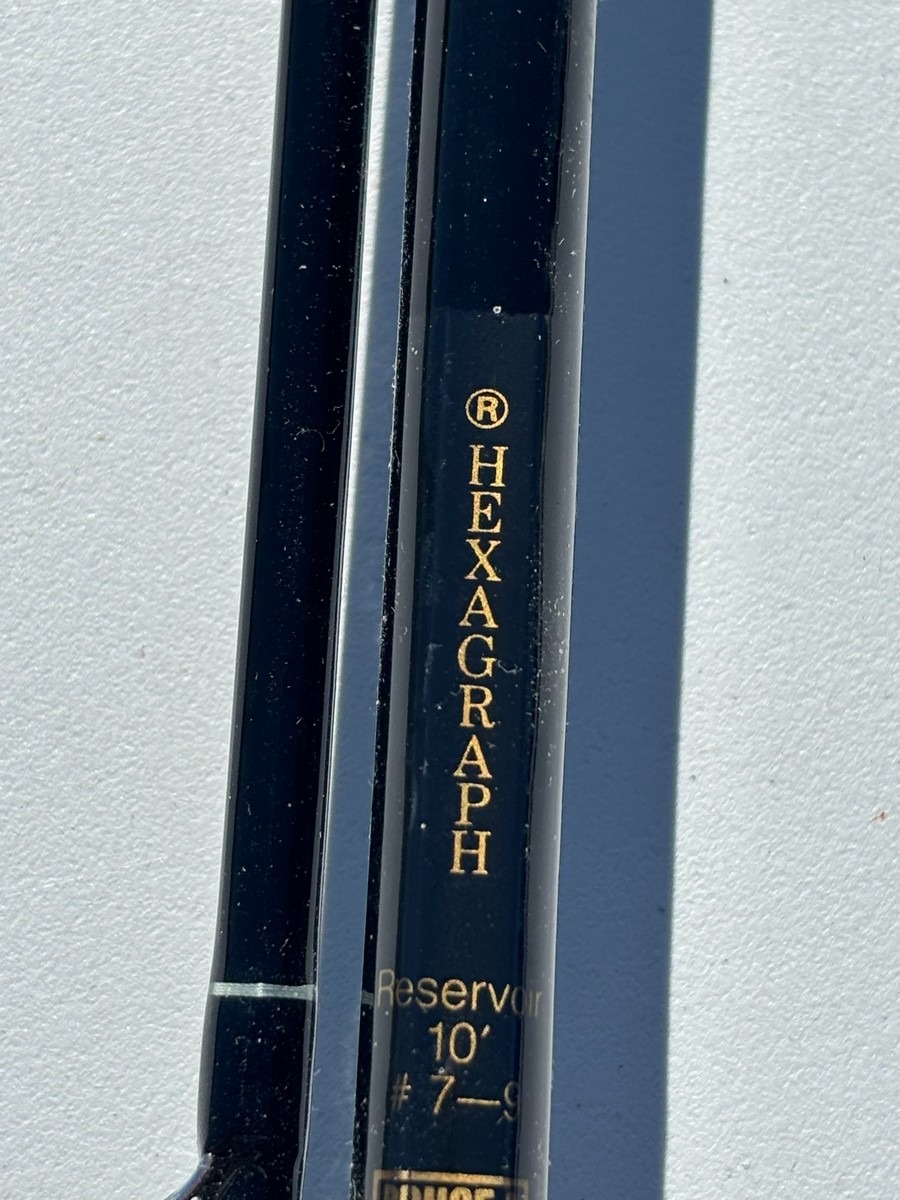 Fluestang fra House of Hardy, England, model “Hexagraph Reservoir”. Længde 10’ og lineklasse #7–9, som angivet på stangen. Udført i mørk grafit med lyse beviklinger, klassiske øjer samt original Hardy hjulholder i metal. Stangen er mærket “Bruce & Walker, England, Handbuilt”. Korkhåndtaget fremstår med almindelig brugspatina. Generelt i brugt stand med kosmetiske spor, herunder mindre ridser og slitage i lak og tryk, men uden umiddelbart synlige større skader. En solid og anvendelig Hardy-stang med både brugs- og samlerinteresse