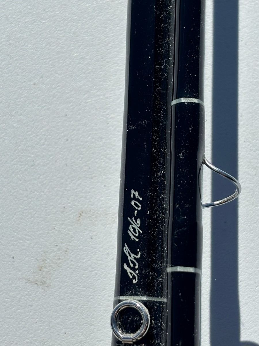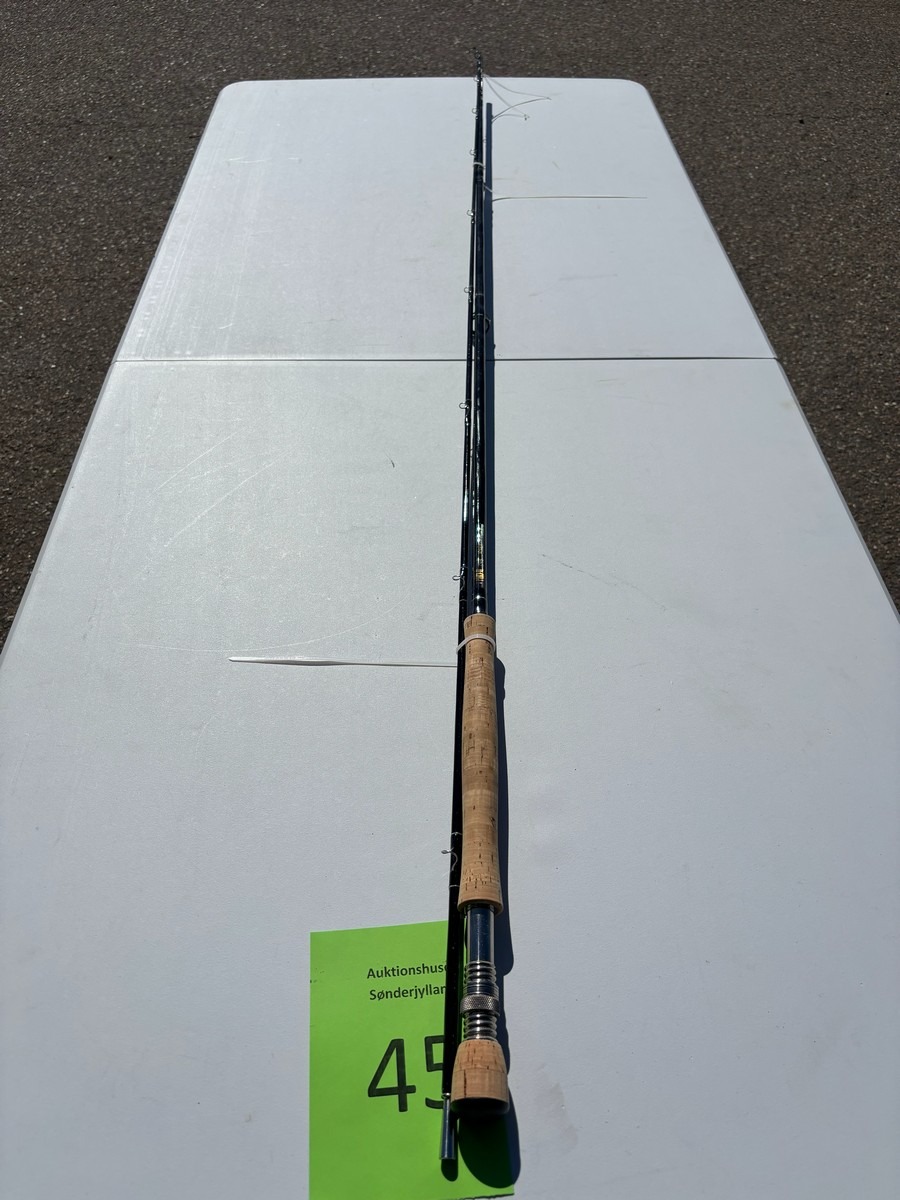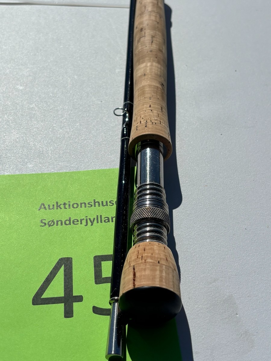 Fluestang fra House of Hardy, England, model “Hexagraph Reservoir”. Længde 10’ og lineklasse #7–9, som angivet på stangen. Udført i mørk grafit med lyse beviklinger, klassiske øjer samt original Hardy hjulholder i metal. Stangen er mærket “Bruce & Walker, England, Handbuilt”. Korkhåndtaget fremstår med almindelig brugspatina. Generelt i brugt stand med kosmetiske spor, herunder mindre ridser og slitage i lak og tryk, men uden umiddelbart synlige større skader. En solid og anvendelig Hardy-stang med både brugs- og samlerinteresse