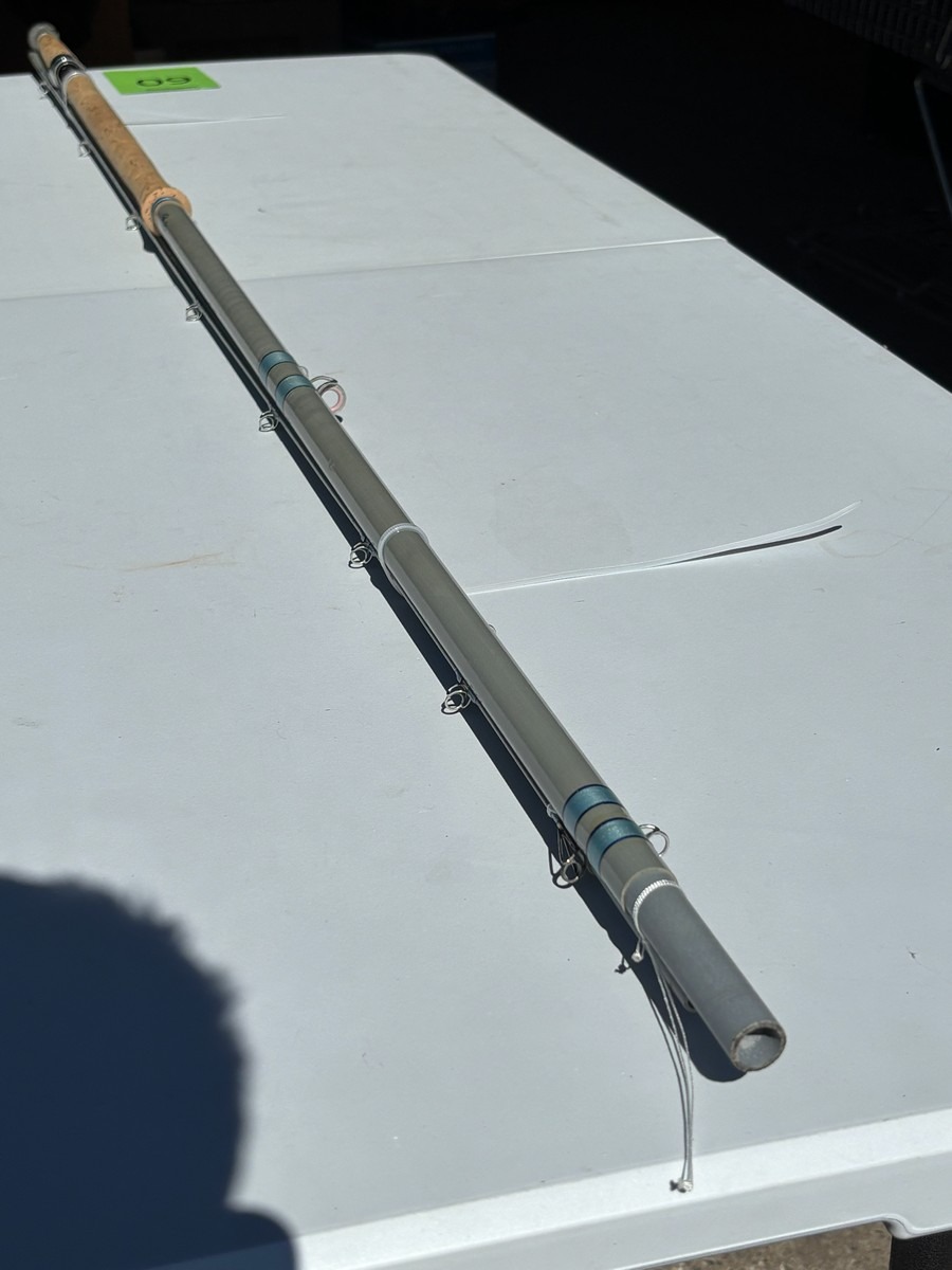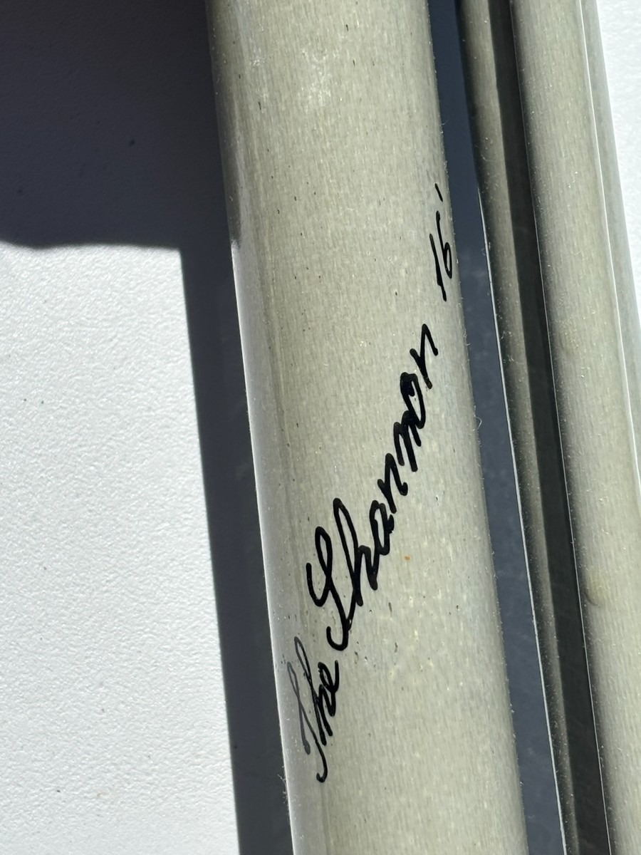 Fluestang mærket “Alf Shamon” #10. Klassisk 2-delt model med grå klinge og korkhåndtag. Udstyret med hjulholder i metal og traditionelle stangøjer.