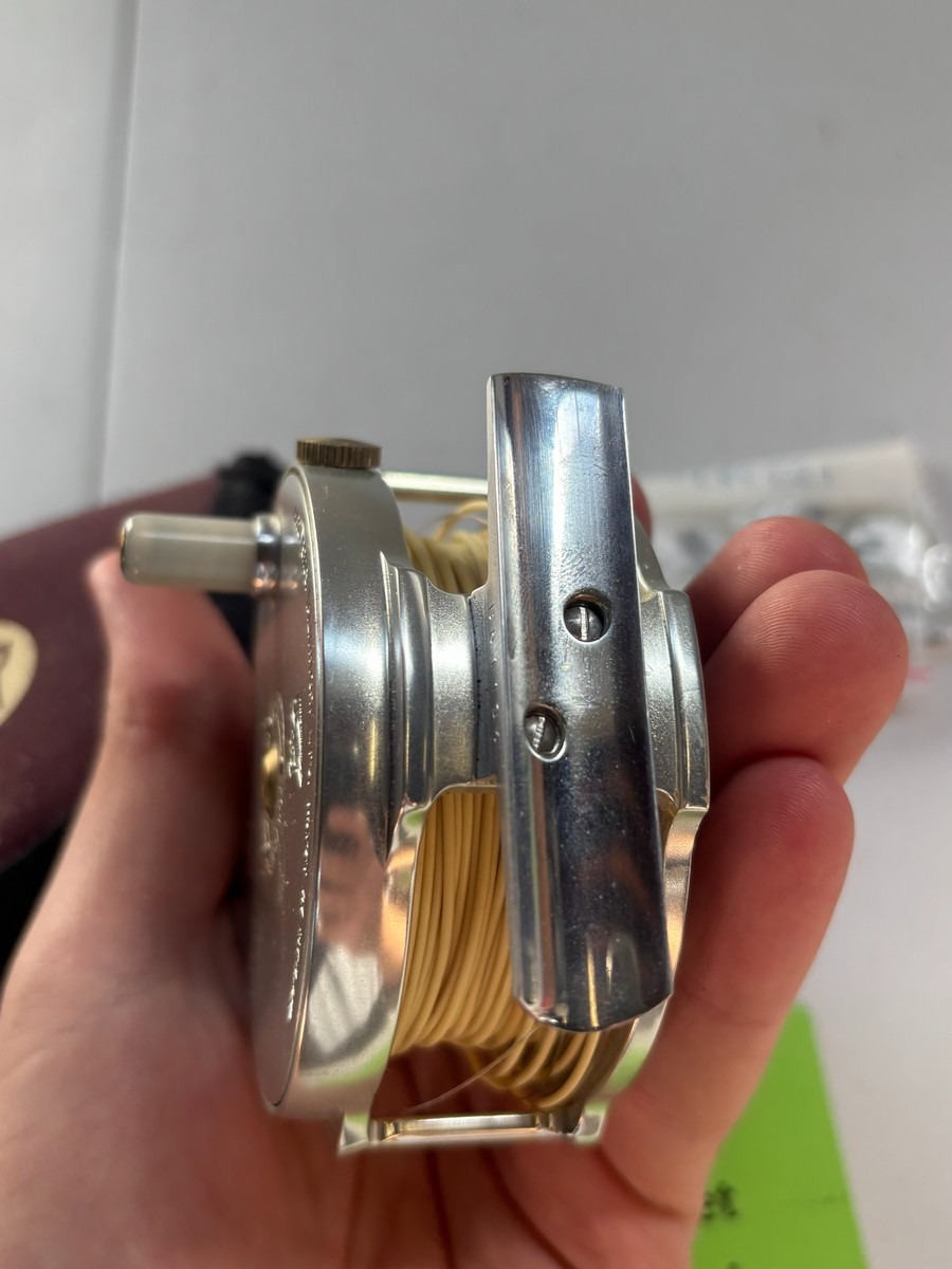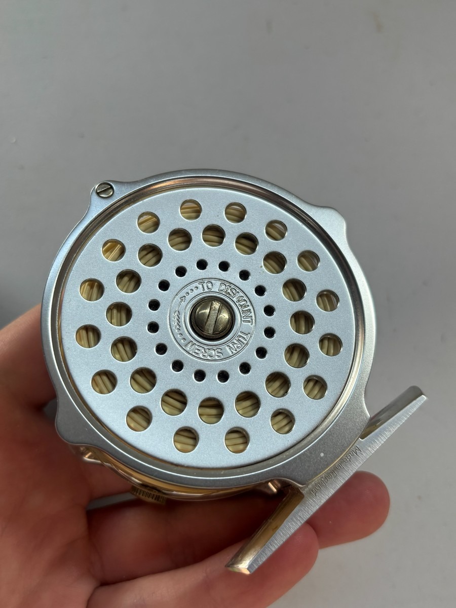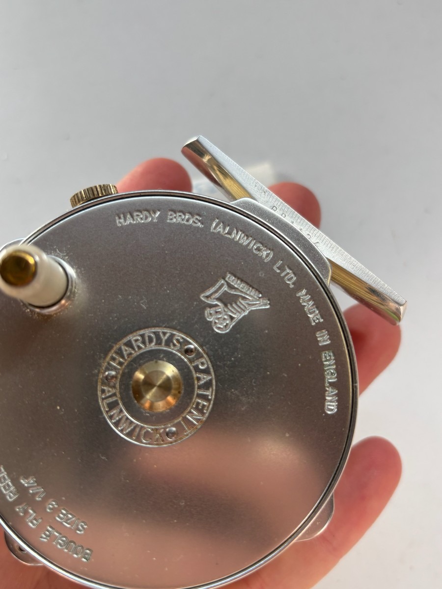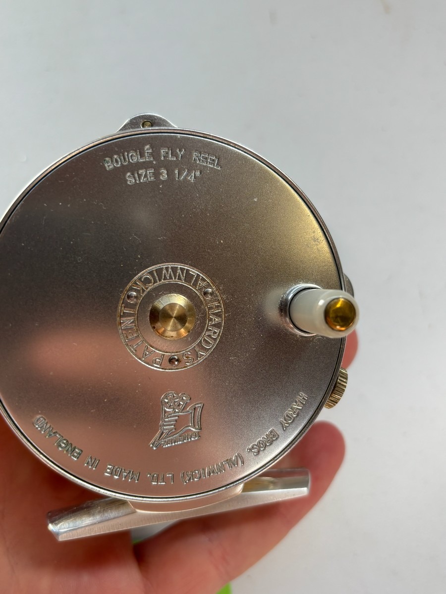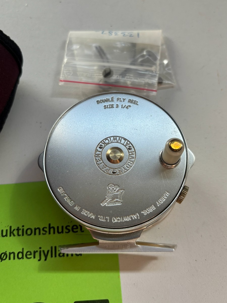 Klassisk Hardy Bouglé fluehjul fra Hardy Bros., Alnwick, England. Mærket “Bouglé Fly Reel – Size 3 1/4” og “Made in England”. Leveres med Hardy etui samt pose med ekstra dele/reservedele