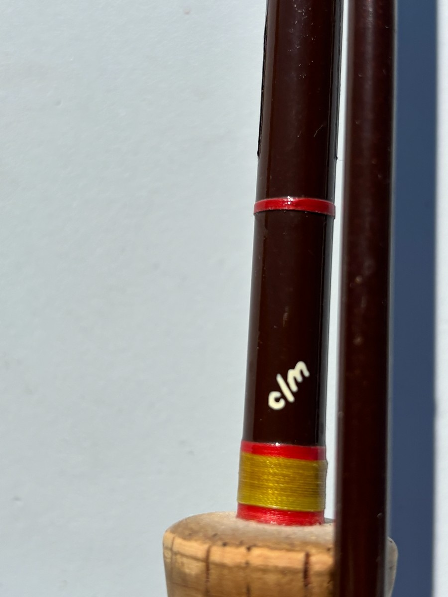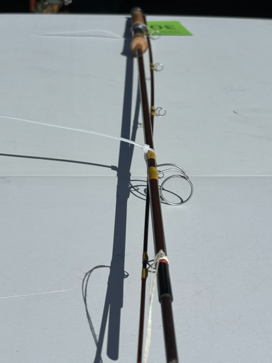 Udført i brun grafit med klassiske røde beviklinger og originale øjer. Stangen har korkhåndtag og Hardy-hjulholder i metal. Original Hardy-dekal samt modelbetegnelse er synlig på klingen.