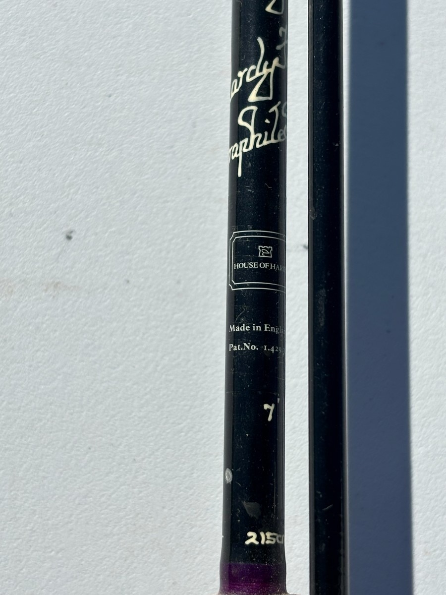 Klassisk fluestang fra Hardy, mærket “Hardy Graphite” samt “House of Hardy – Made in England”. Stangen er opmålt/markeret til ca. 215 cm (ca. 7’), hvilket gør den velegnet til lettere fiskeri i mindre åer og vandløb.