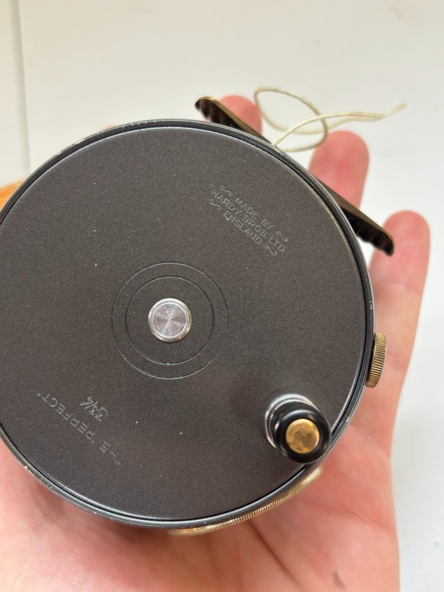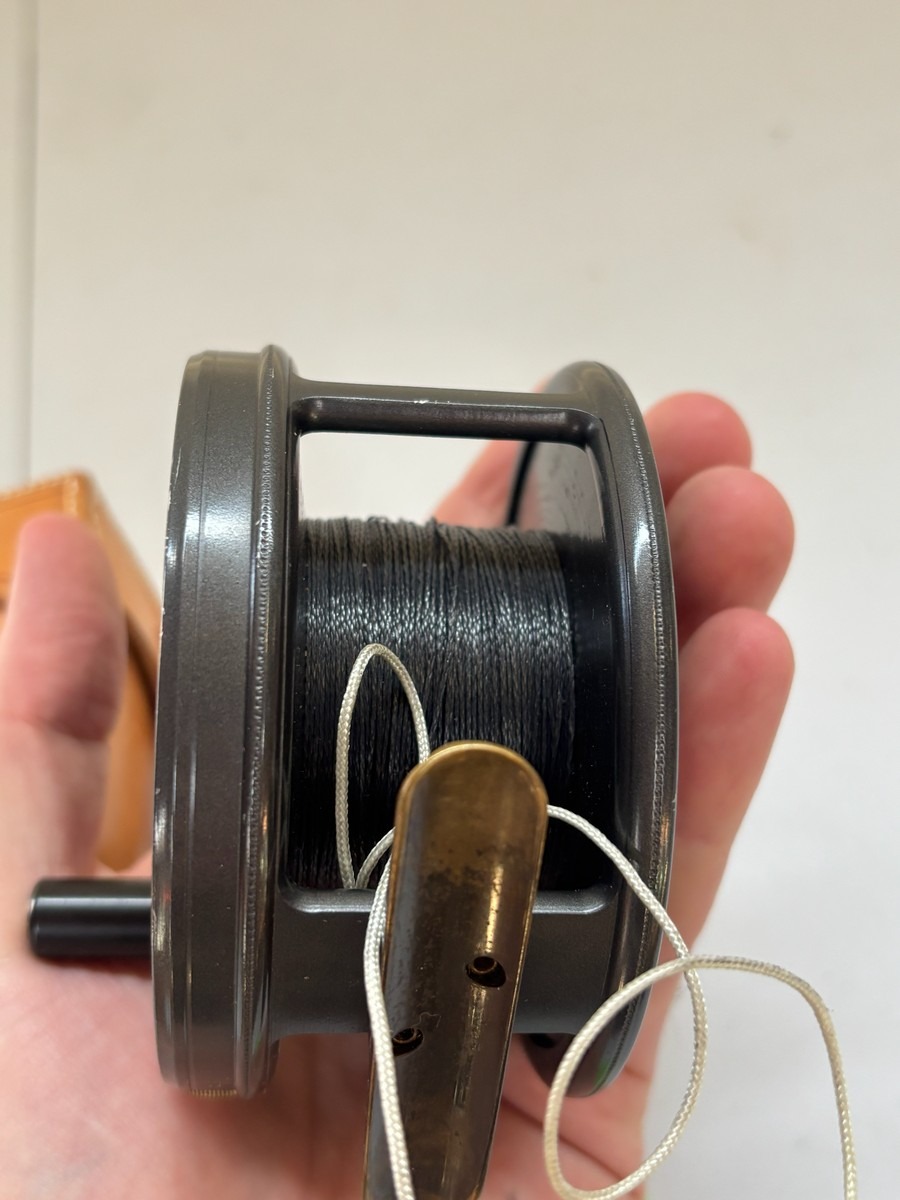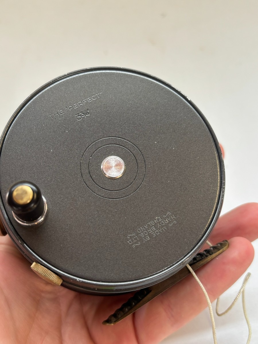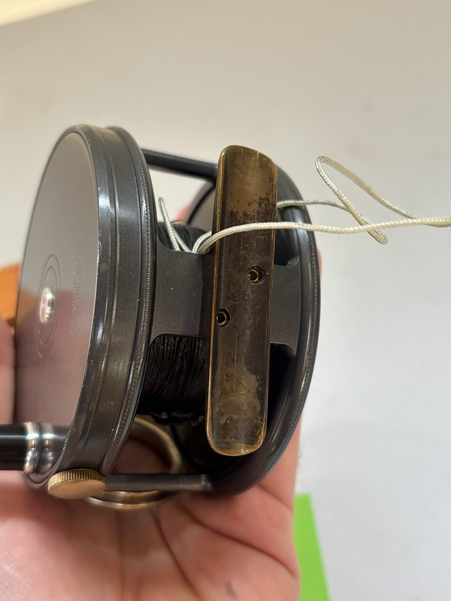 Klassisk kvalitetsfluehjul fra Hardy Bros., med traditionel klikbremse og let perforeret spole. Monteret med line.