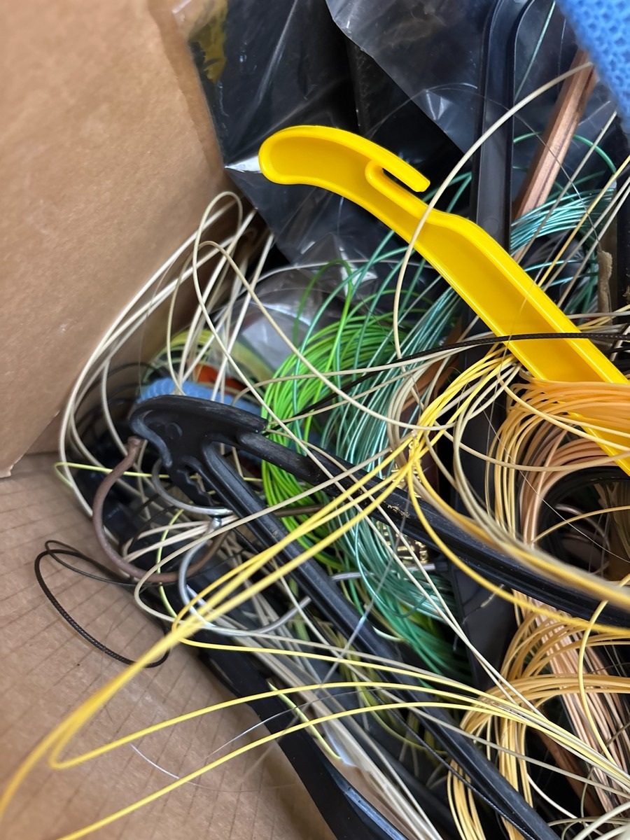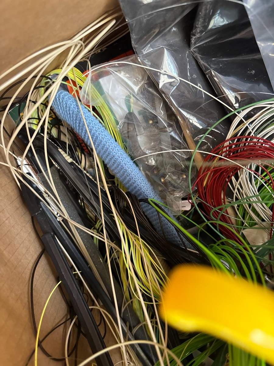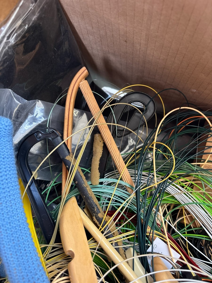 Kasse med diverse liner / snører og tilbehør. Fra dødsbo
