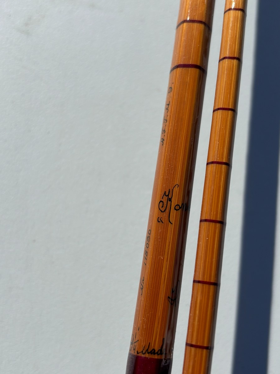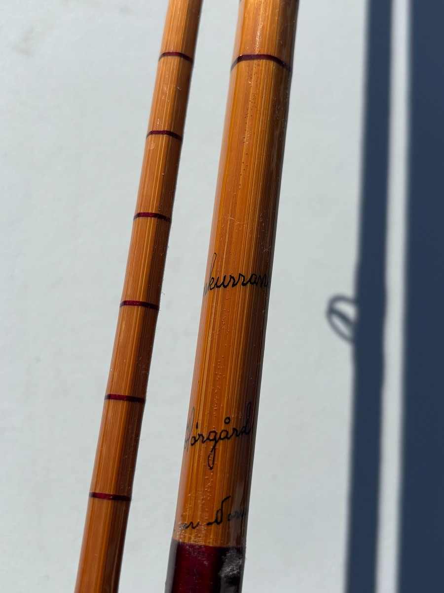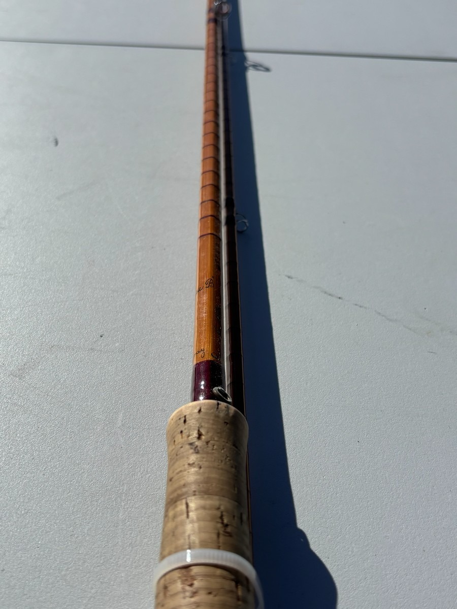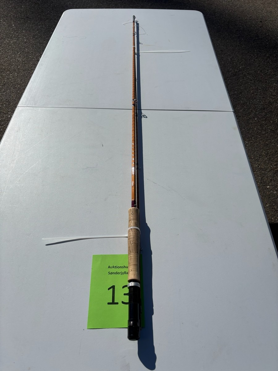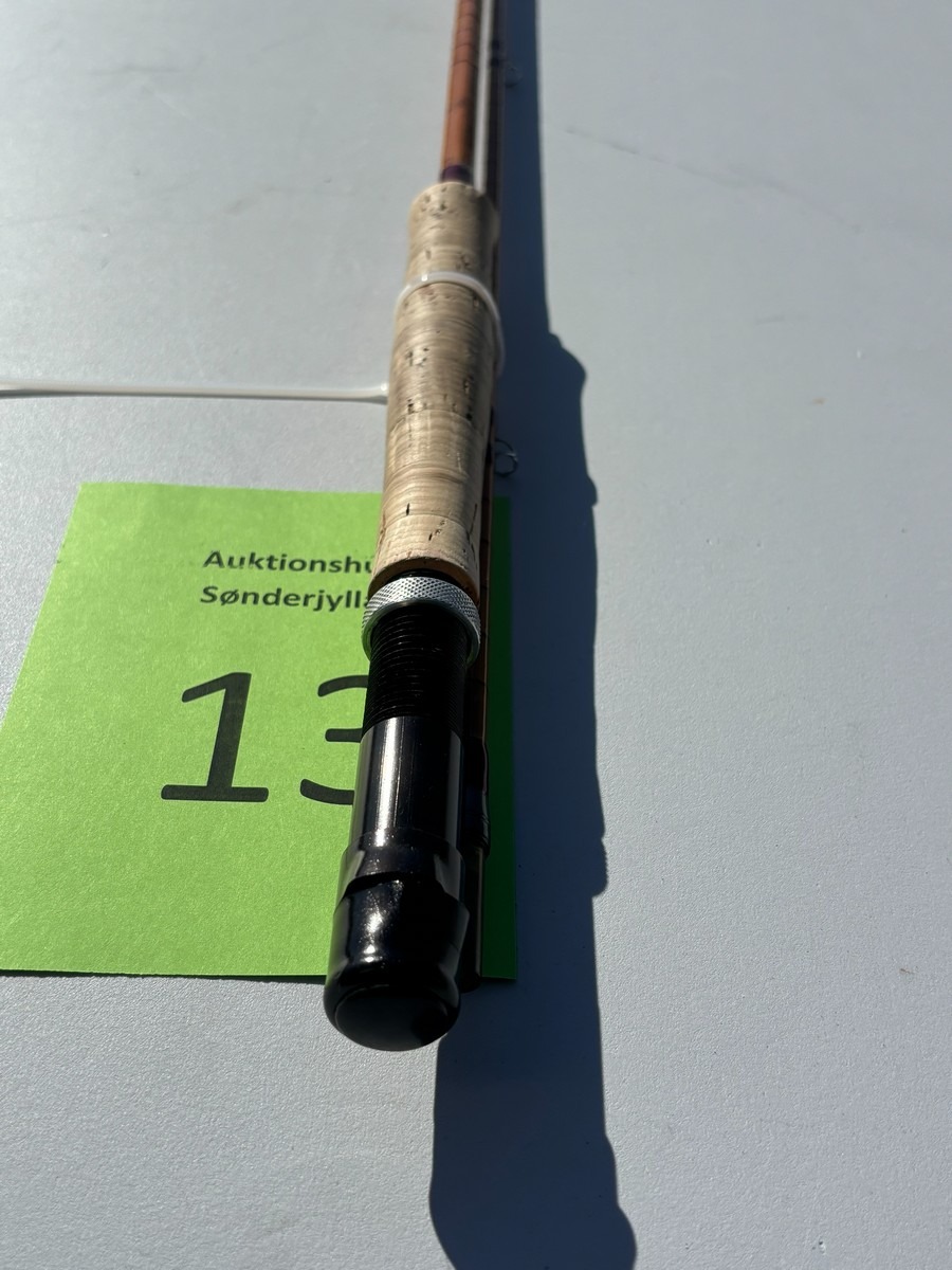 Klassisk ældre fiskestang i splitcane (bambus) med håndskrevne angivelser, bl.a. længde ca. 8½ ft. Fremstår i pæn stand. Fra dødsbo