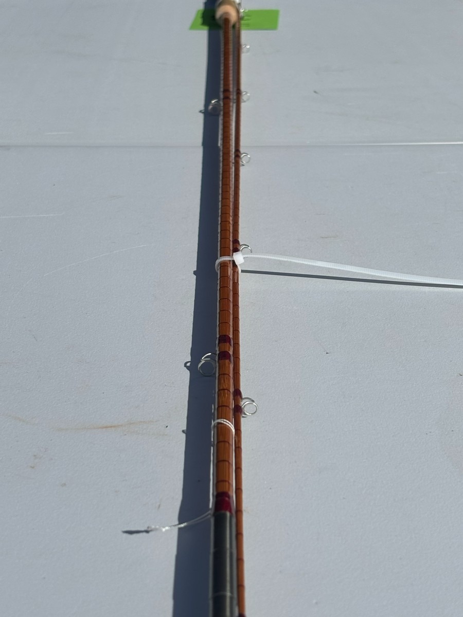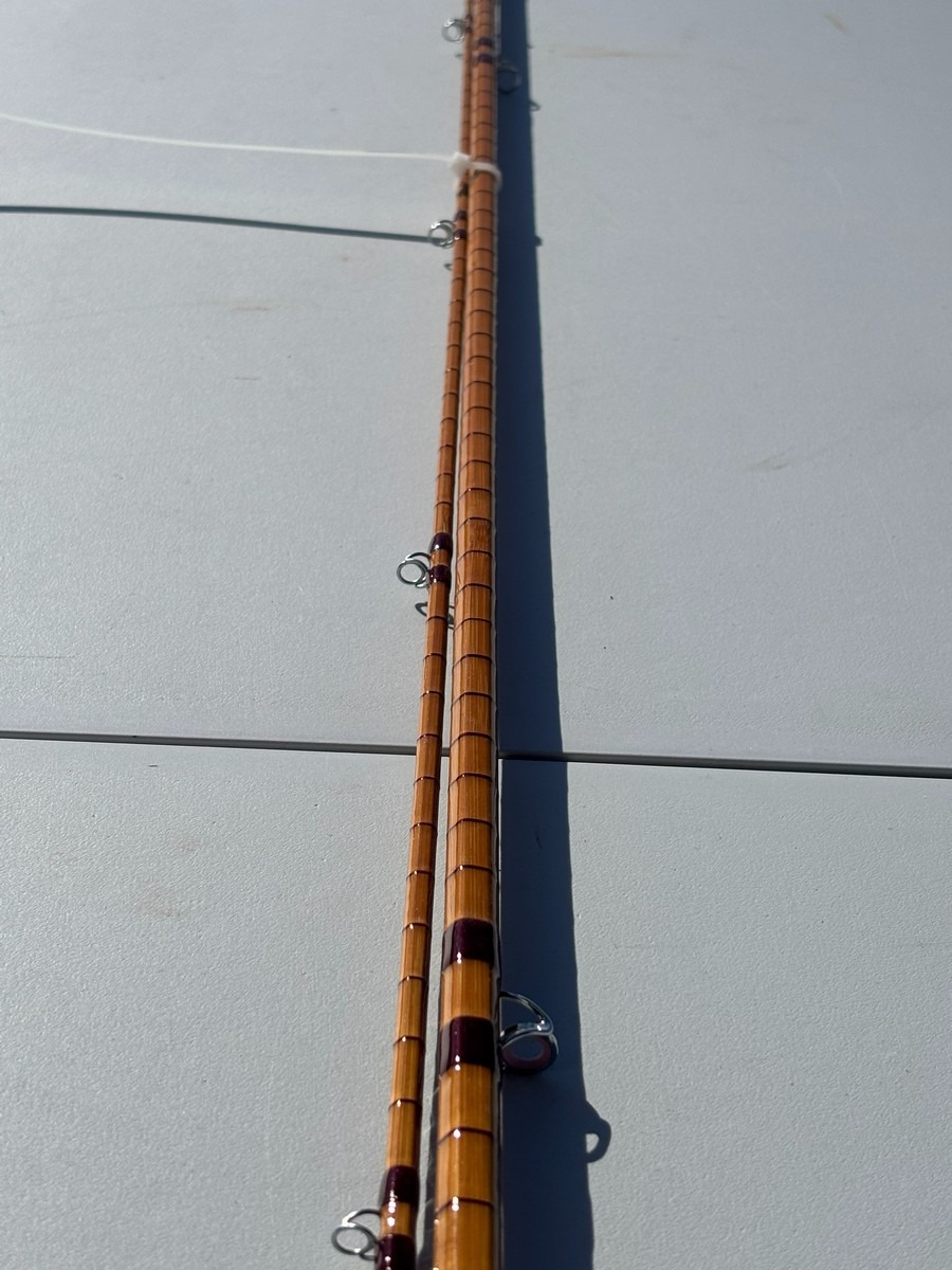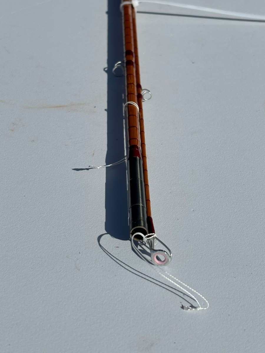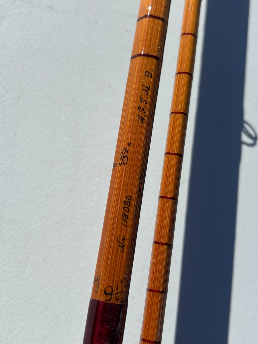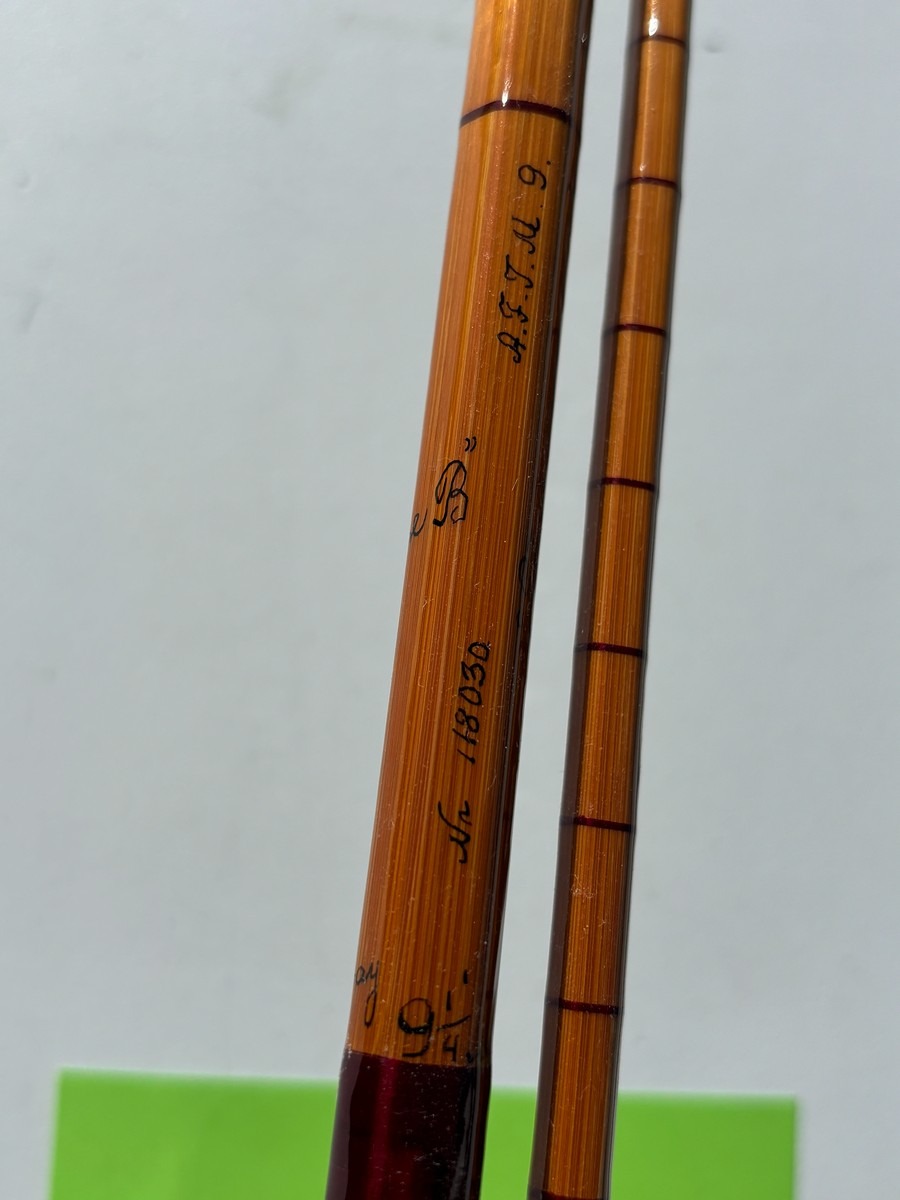 Klassisk ældre fiskestang i splitcane (bambus) med håndskrevne angivelser, bl.a. længde ca. 8½ ft. Fremstår i pæn stand. Fra dødsbo