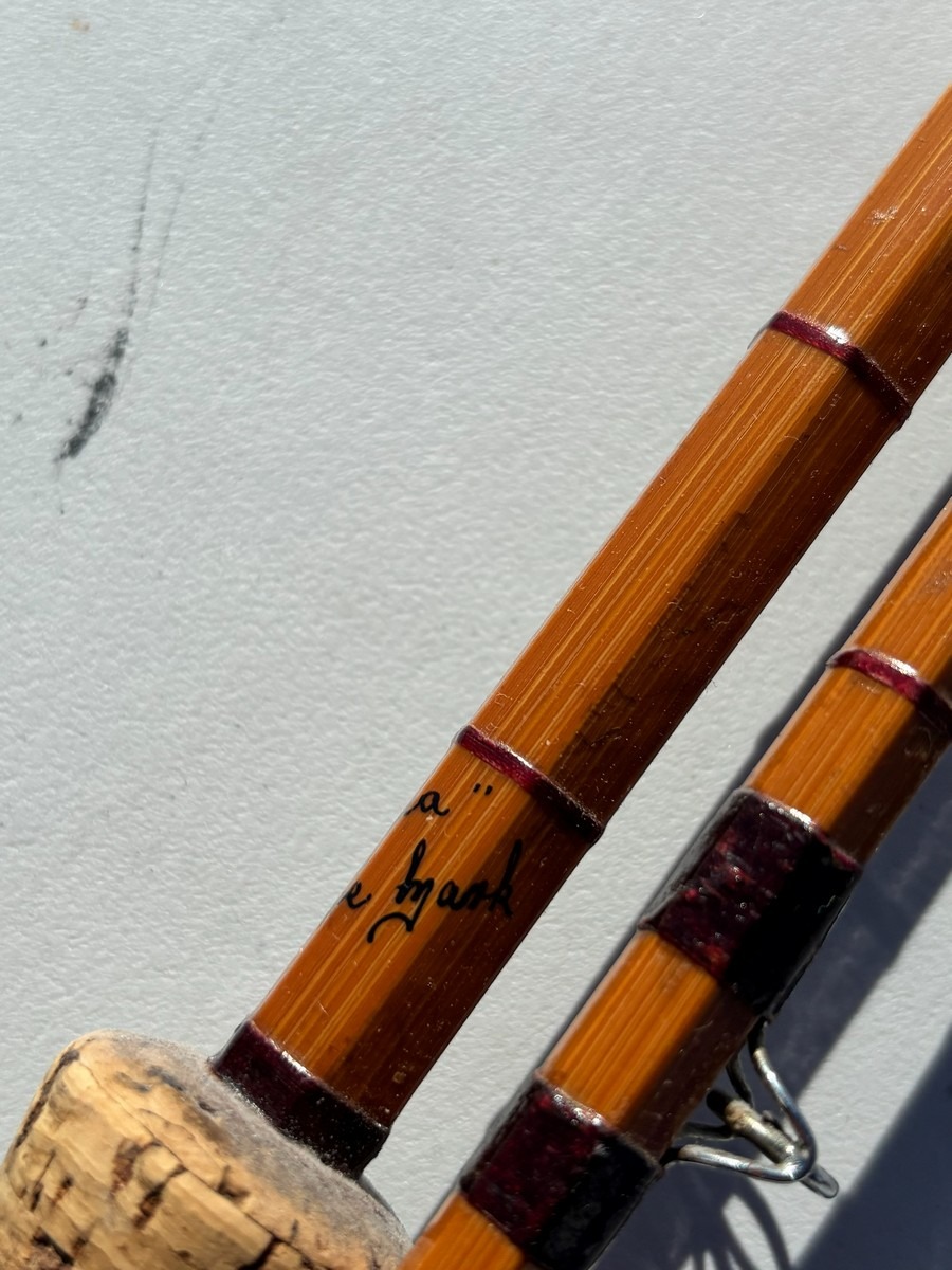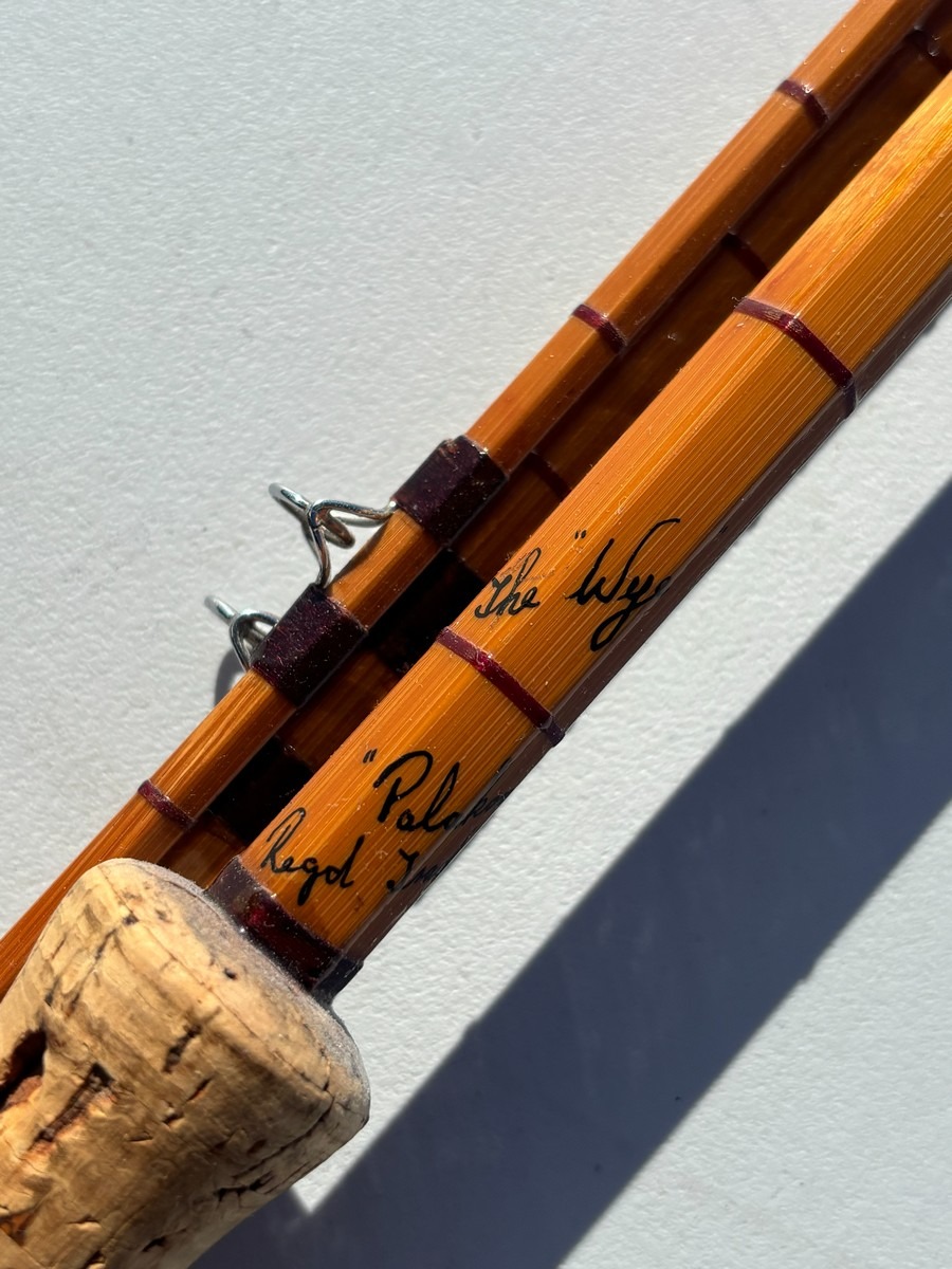Klassisk fluestang i splitcane (bambus) med håndskrevet påskrift “The Wye” samt “Palakona”