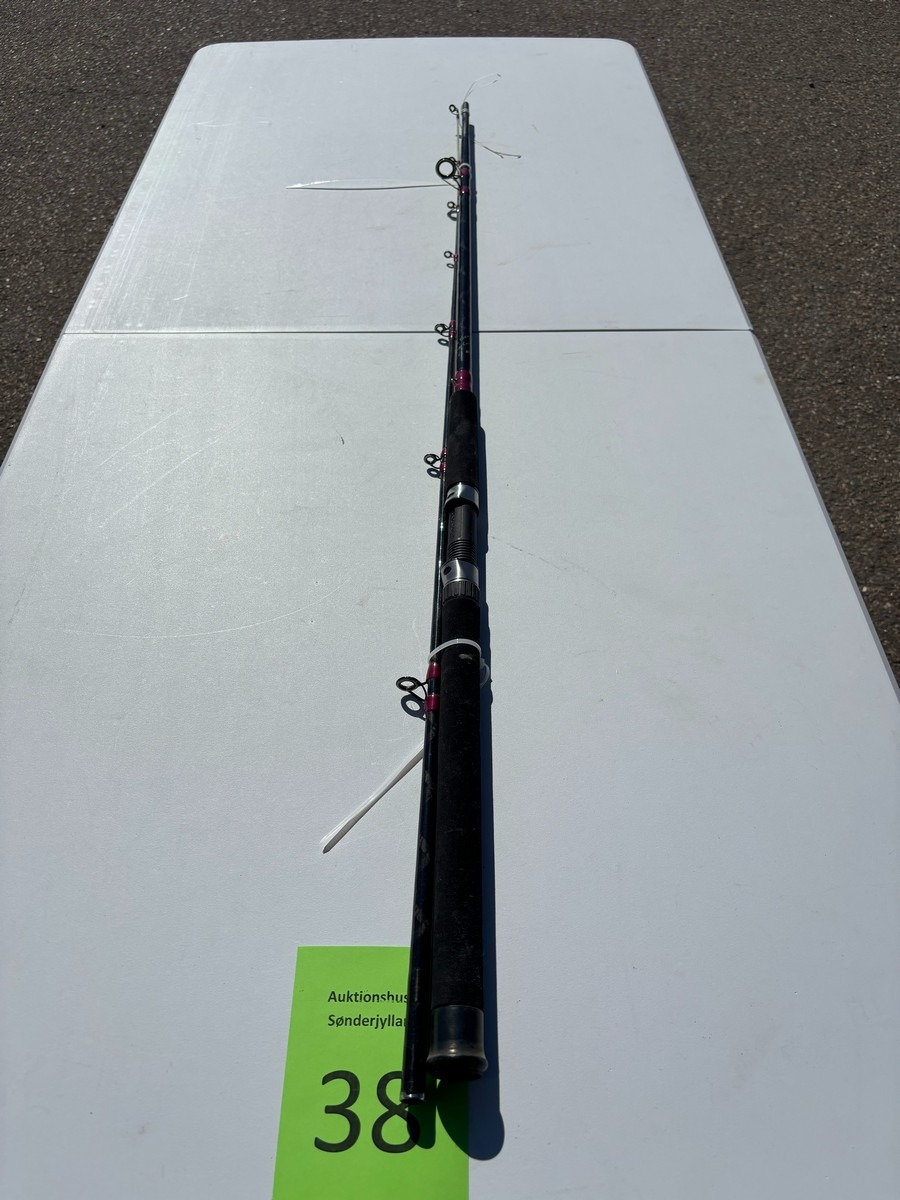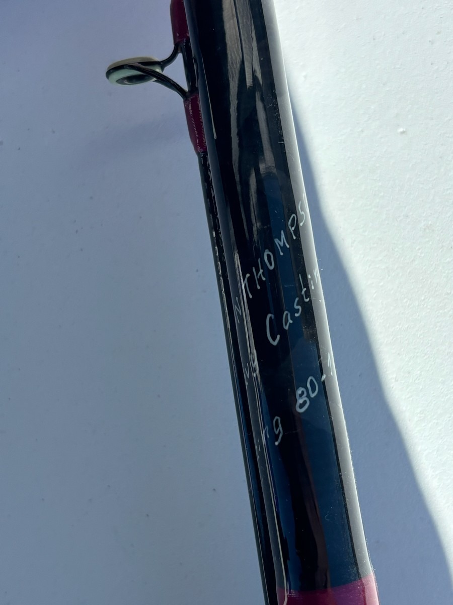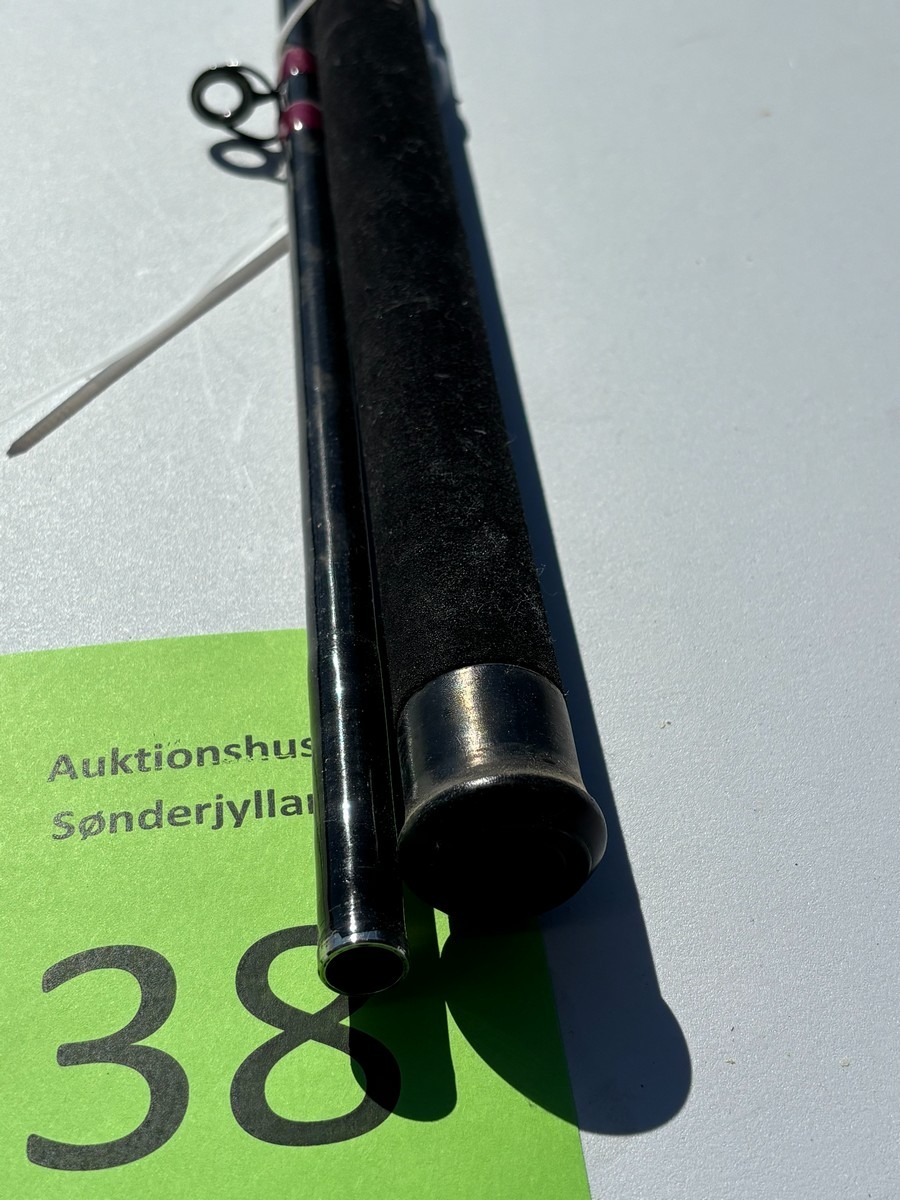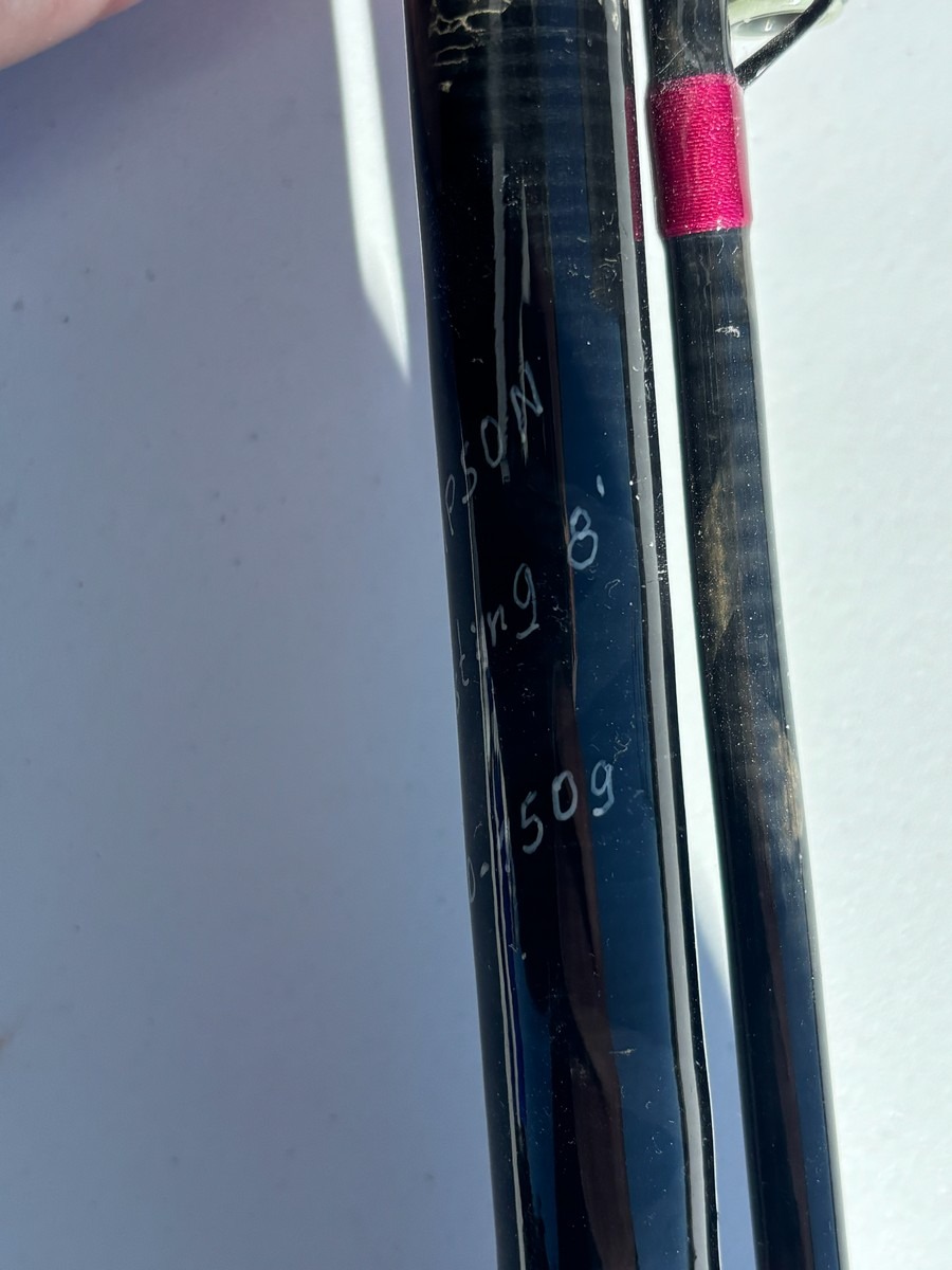 På klingen ses angivet 9’ / klasse 8 / ca. 150 g, hvilket peger på en kraftigere allround fluestang, velegnet til både kyst- og lettere laksefiskeri.