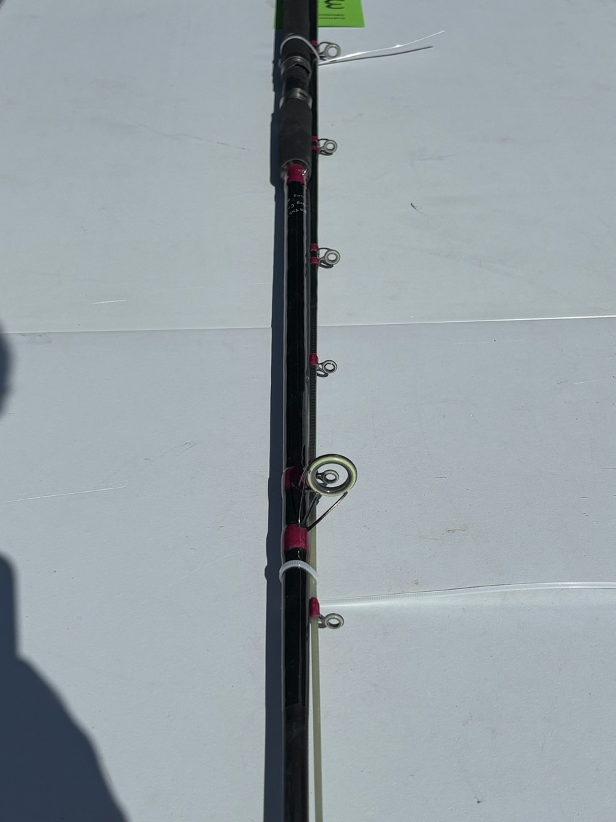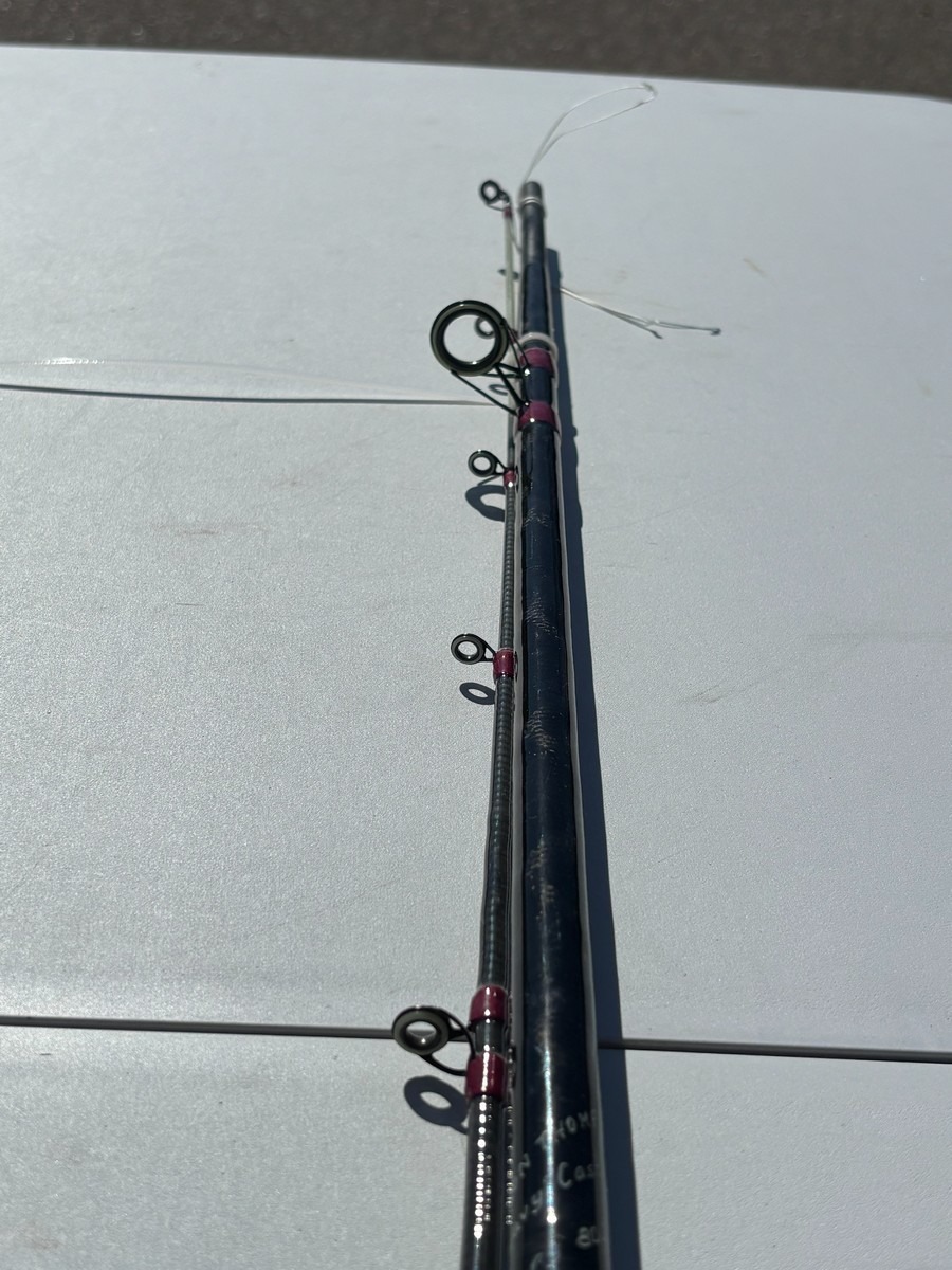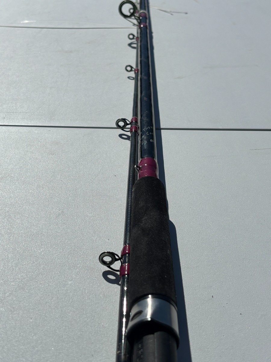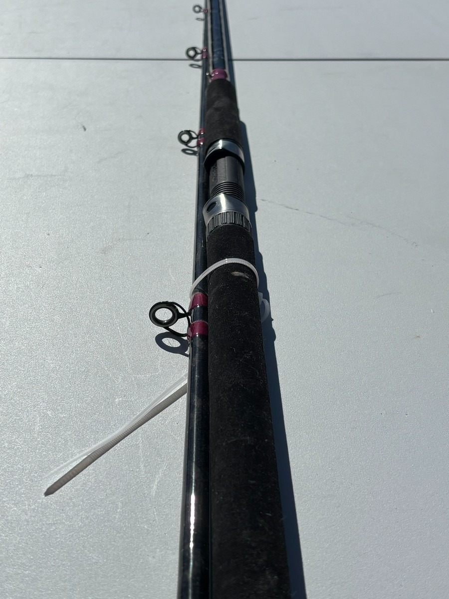 På klingen ses angivet 9’ / klasse 8 / ca. 150 g, hvilket peger på en kraftigere allround fluestang, velegnet til både kyst- og lettere laksefiskeri.