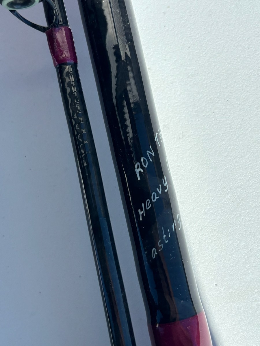 Klassisk fluestang fra Ron Thompson, model HPS-20, udført i kulfiber med mørk klinge og håndskrevne specifikationer.