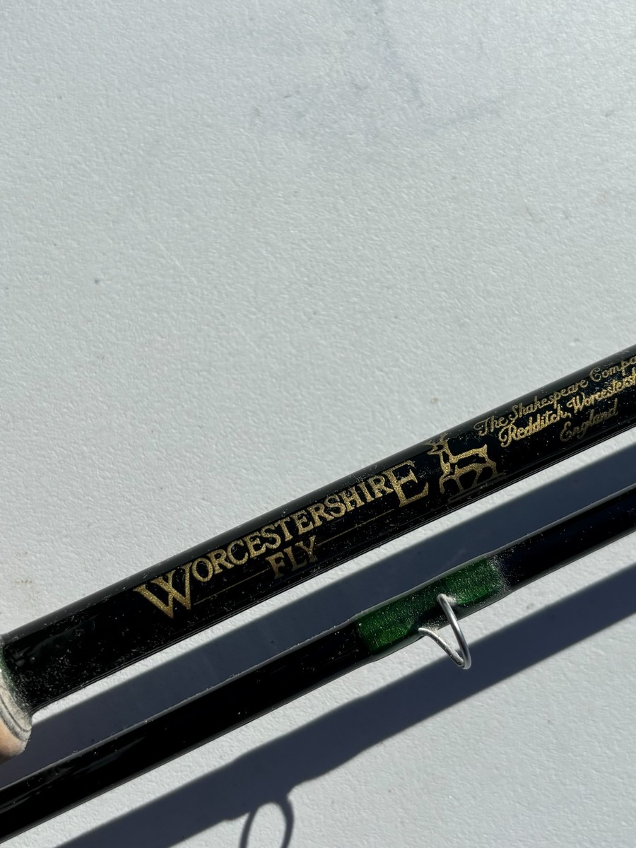 Ældre kvalitets fluestang fra The Shakespeare Company, mærket “Worcestershire Fly”. Fremstillet i England og udført i boron/graphite konstruktion. Stangen er 10 fod (ca. 305 cm) og fremstår som en klassisk 2-delt fluestang med korkhåndtag og traditionelle øjer.