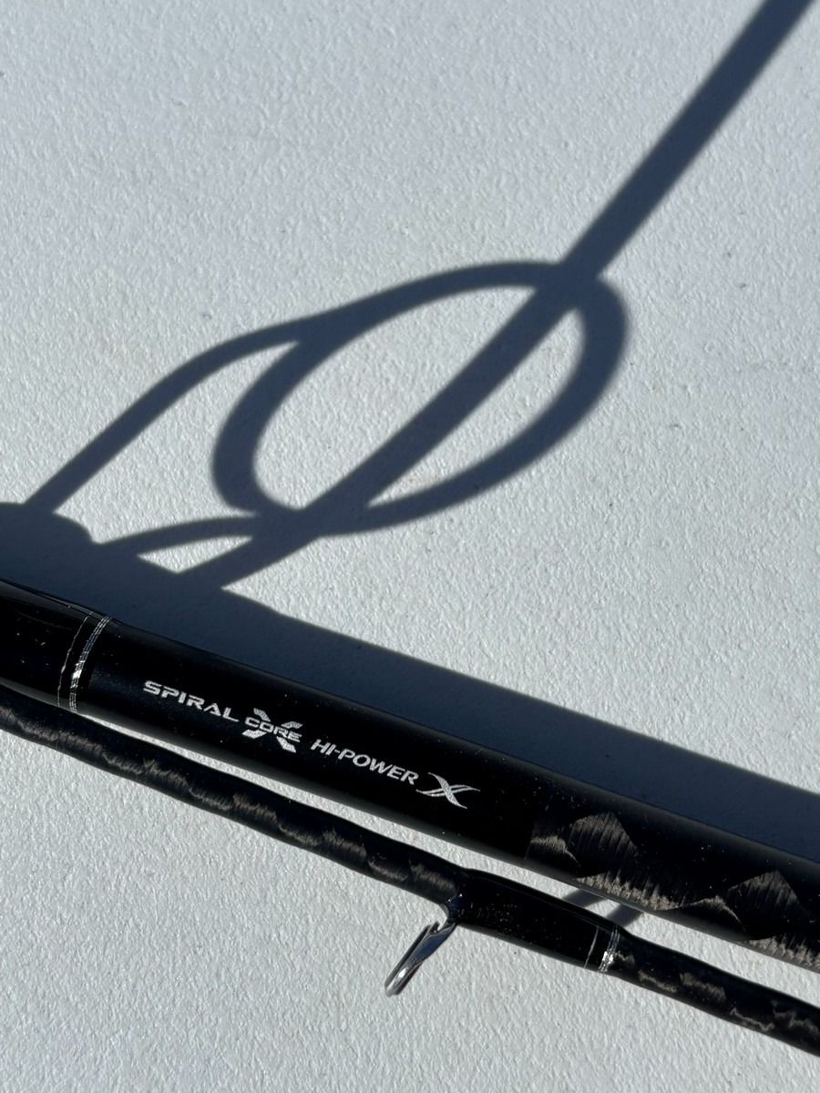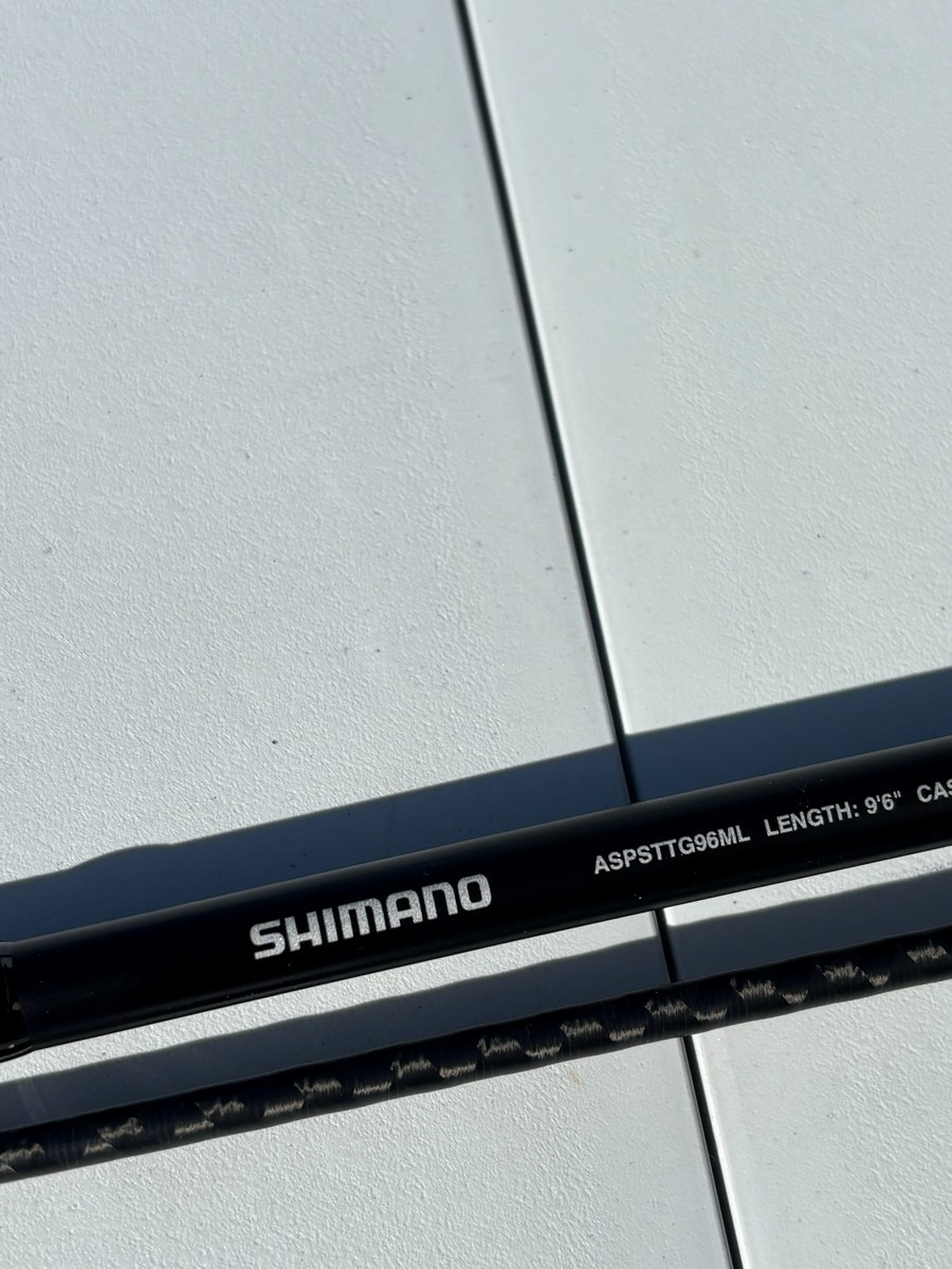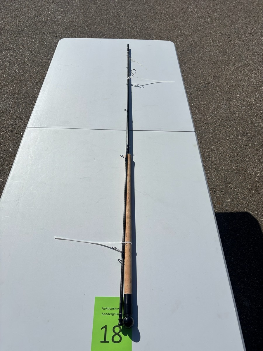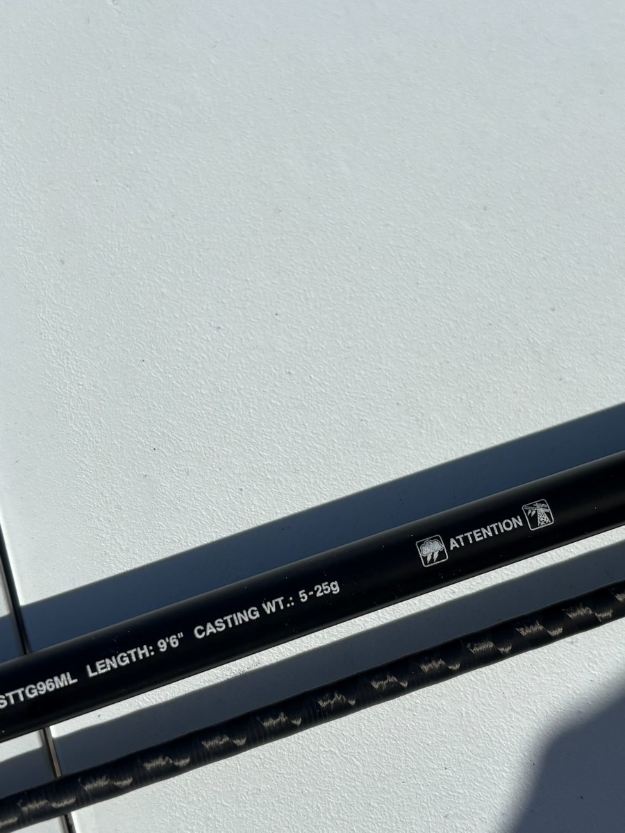 Shimano spinnestang – 9’6” – 5–25 g. Shimano spinnestang model ASPSTTG96ML i moderne kulfiberkonstruktion med Shimano Spiral X og Hi-Power X teknologi, som giver en let og stærk klinge. Stangen har en længde på 9’6” (ca. 290 cm) og en kastevægt på 5–25 g med medium light aktion, hvilket gør den velegnet til kystfiskeri, å og let predatorfiskeri. Udstyret med korkhåndtag med let patina samt intakte øjer og klinge. Fremstår i pæn brugt stand med almindelige brugsspor. Fra dødsbo