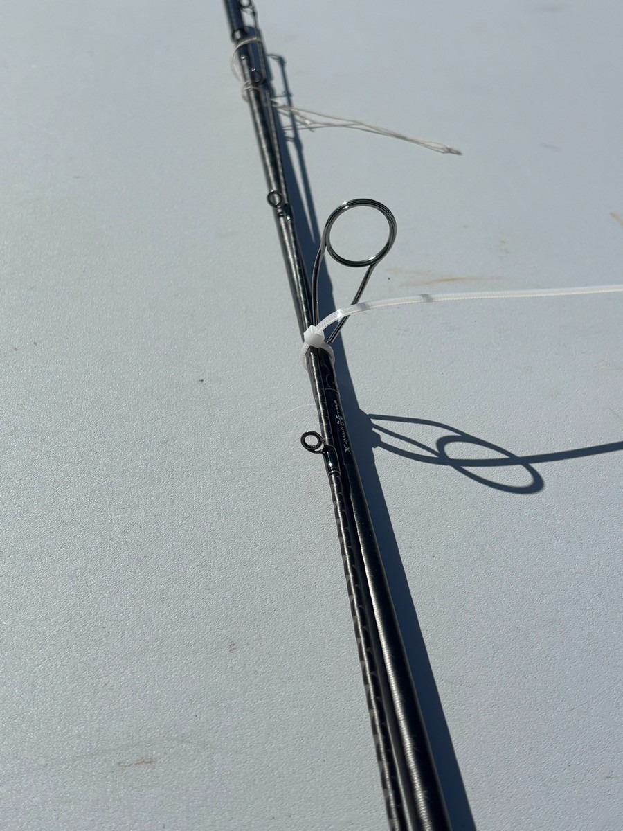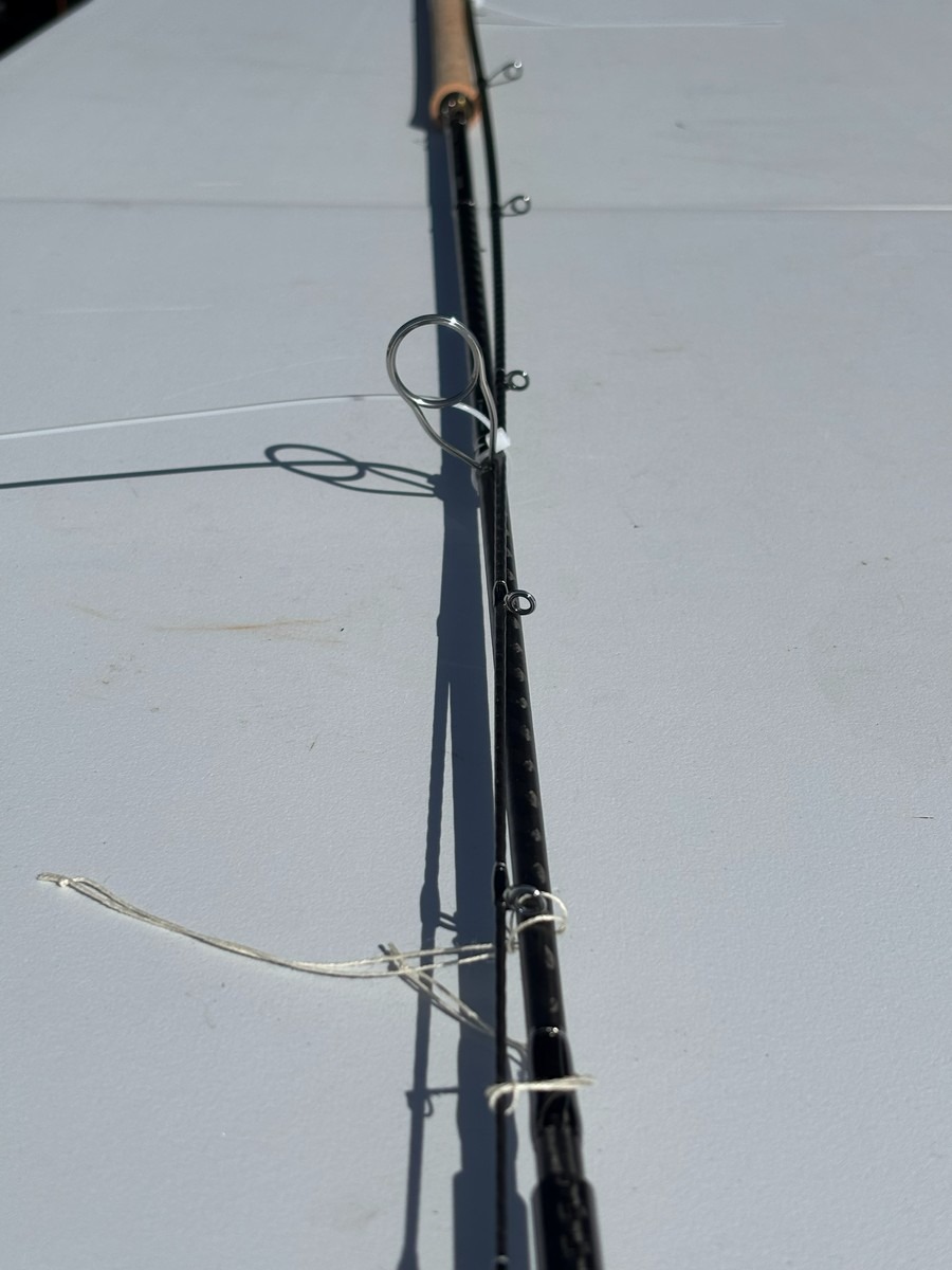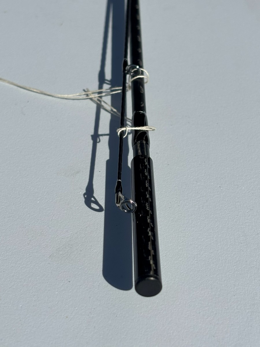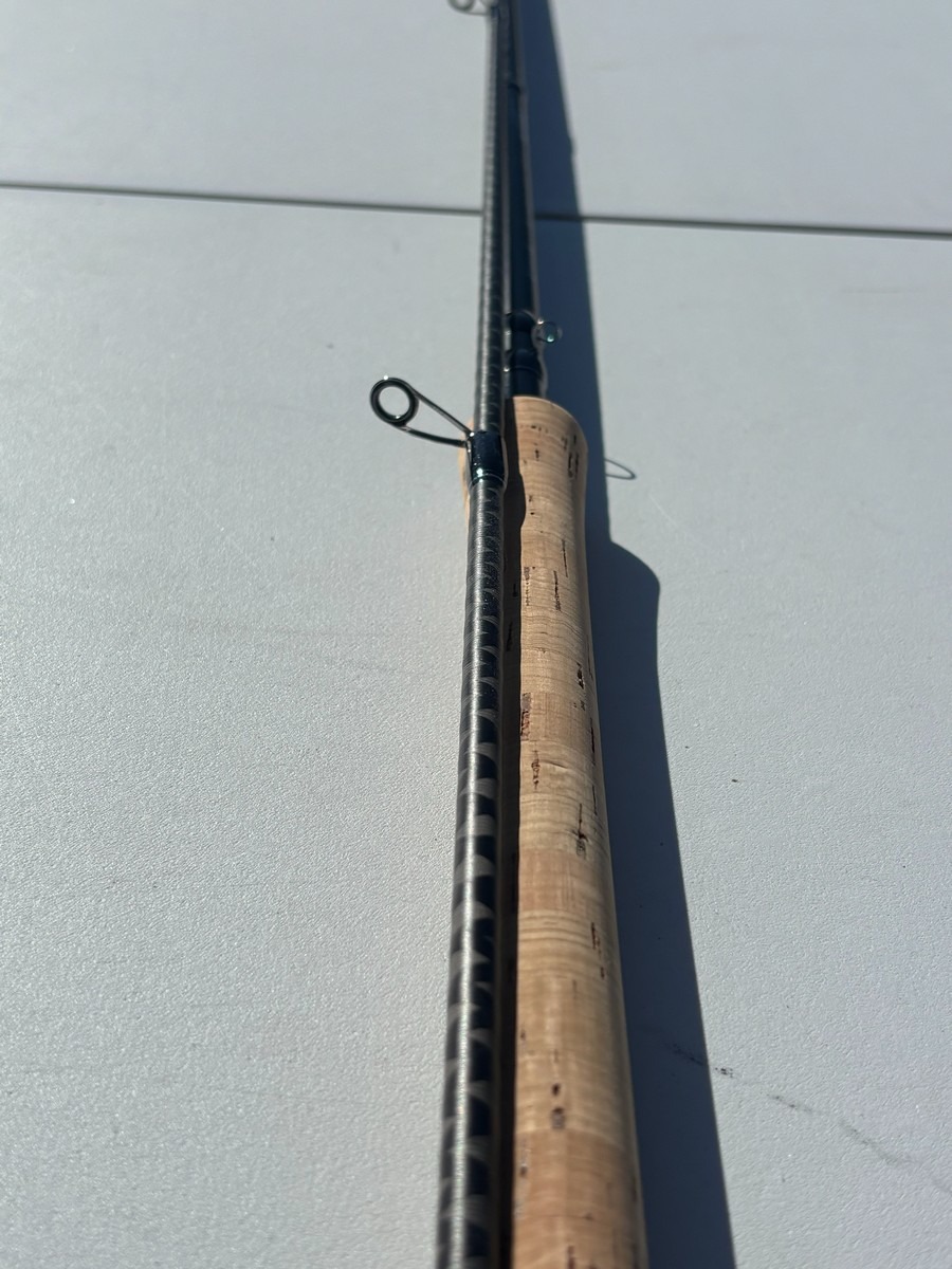 Shimano spinnestang – 9’6” – 5–25 g. Shimano spinnestang model ASPSTTG96ML i moderne kulfiberkonstruktion med Shimano Spiral X og Hi-Power X teknologi, som giver en let og stærk klinge. Stangen har en længde på 9’6” (ca. 290 cm) og en kastevægt på 5–25 g med medium light aktion, hvilket gør den velegnet til kystfiskeri, å og let predatorfiskeri. Udstyret med korkhåndtag med let patina samt intakte øjer og klinge. Fremstår i pæn brugt stand med almindelige brugsspor. Fra dødsbo