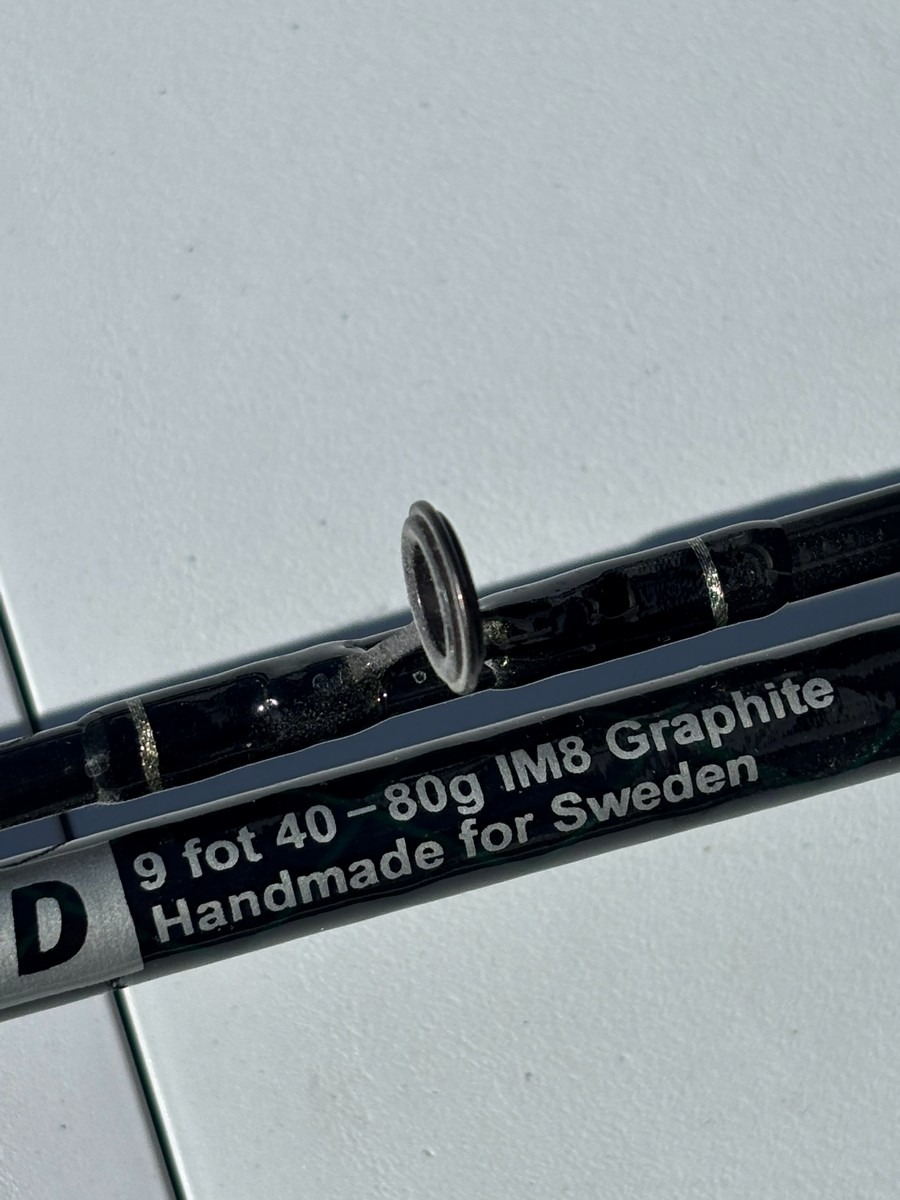 Spinnestang fra BSF Tecneed, fremstillet i IM8 grafit. Længde 9 fod (ca. 270 cm) med kastevægt 40–80 g. “Handmade for Sweden” fremgår af stangen. Udstyret med korkhåndtag, skruehjulholder og klassiske stangøjer. Fremstår i brugt stand med almindelige brugsspor, herunder mindre ridser og slitage på lak samt lette mærker ved samling og hjulholder, men uden umiddelbart synlige større skader. Velegnet til almindeligt spinnefiskeri