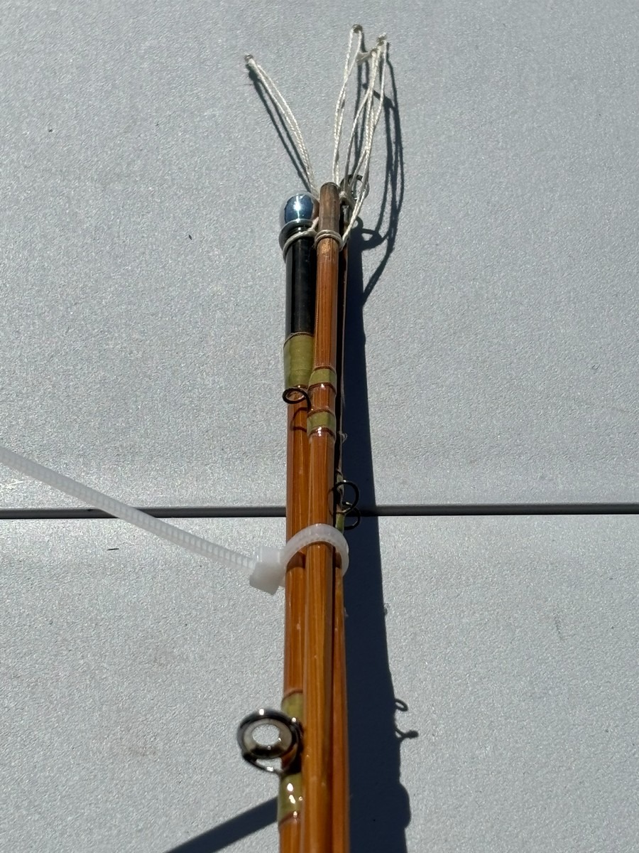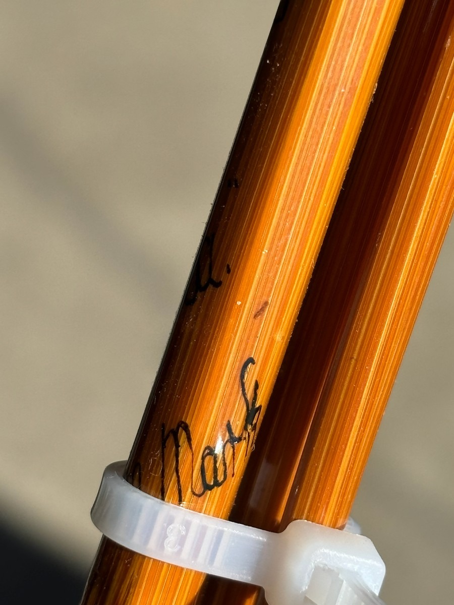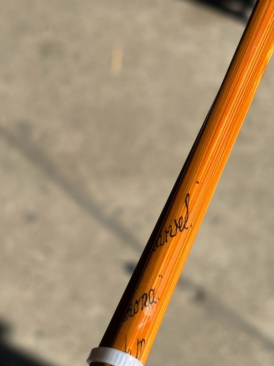 På klingen ses håndskrevne markeringer samt nummerering (#1), hvilket indikerer original sektionstilhørighed. Stangen fremstår i smuk, gylden splitcane med fine, ensartede årringe og klassisk opbygning.
