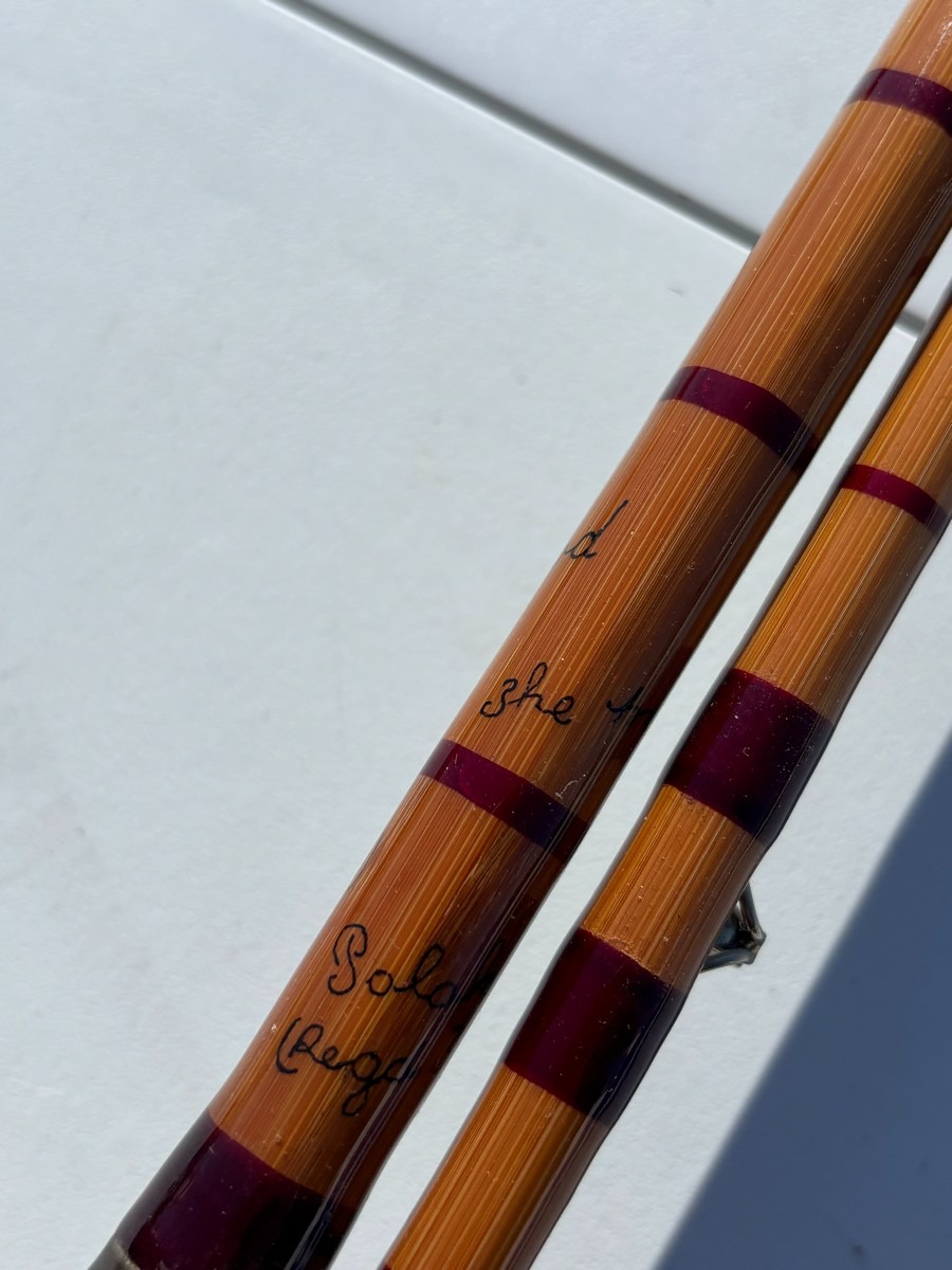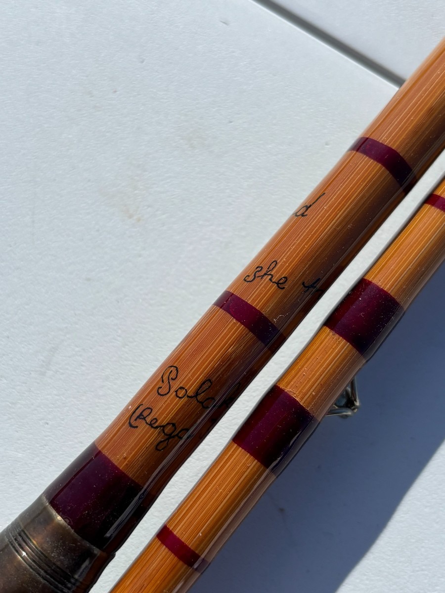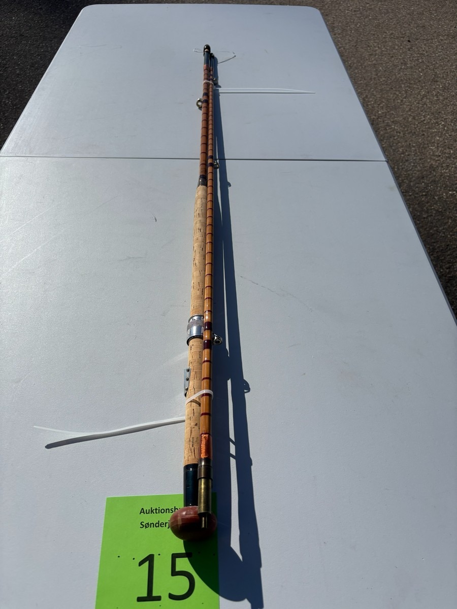 Splitcane fluestang “The Split Cane Rod” – 2-delt. ca. 7–8 ft. Klassisk splitcane (bambus) fluestang med håndskrevet tekst, herunder bl.a. “The Split Cane Rod” samt yderligere angivelser. Fremstår i pæn stand. Fra dødsbo