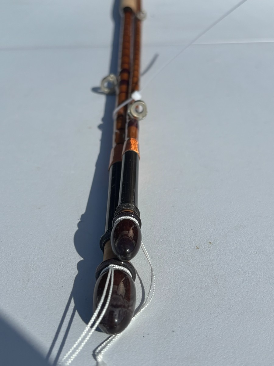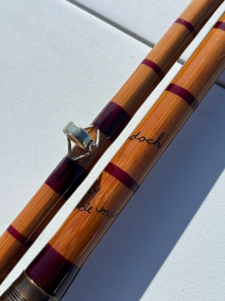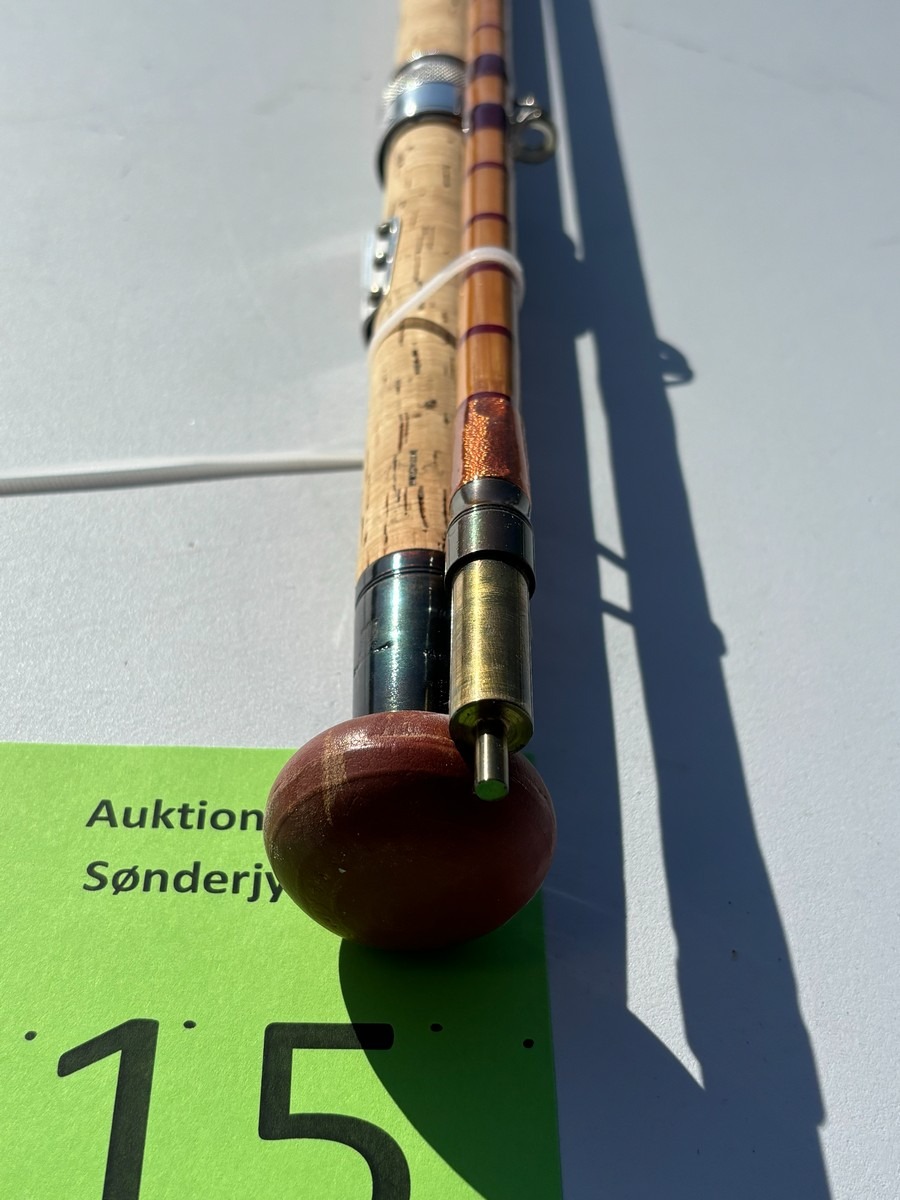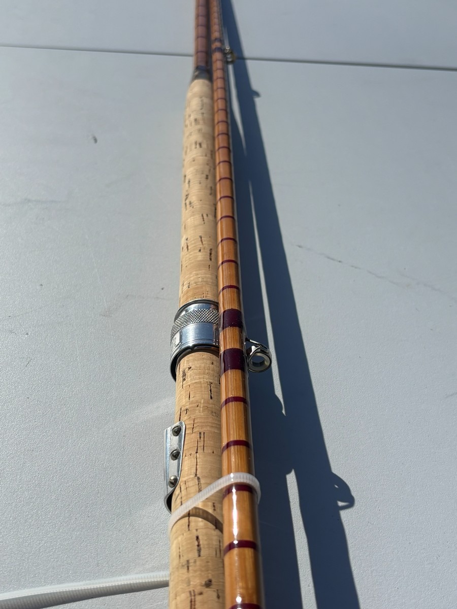Splitcane fluestang “The Split Cane Rod” – 2-delt. ca. 7–8 ft. Klassisk splitcane (bambus) fluestang med håndskrevet tekst, herunder bl.a. “The Split Cane Rod” samt yderligere angivelser. Fremstår i pæn stand. Fra dødsbo