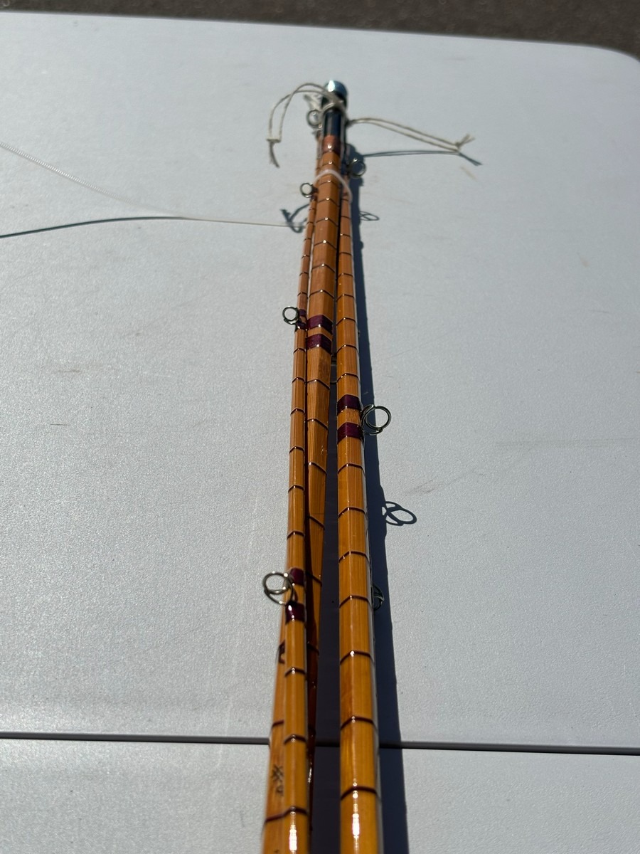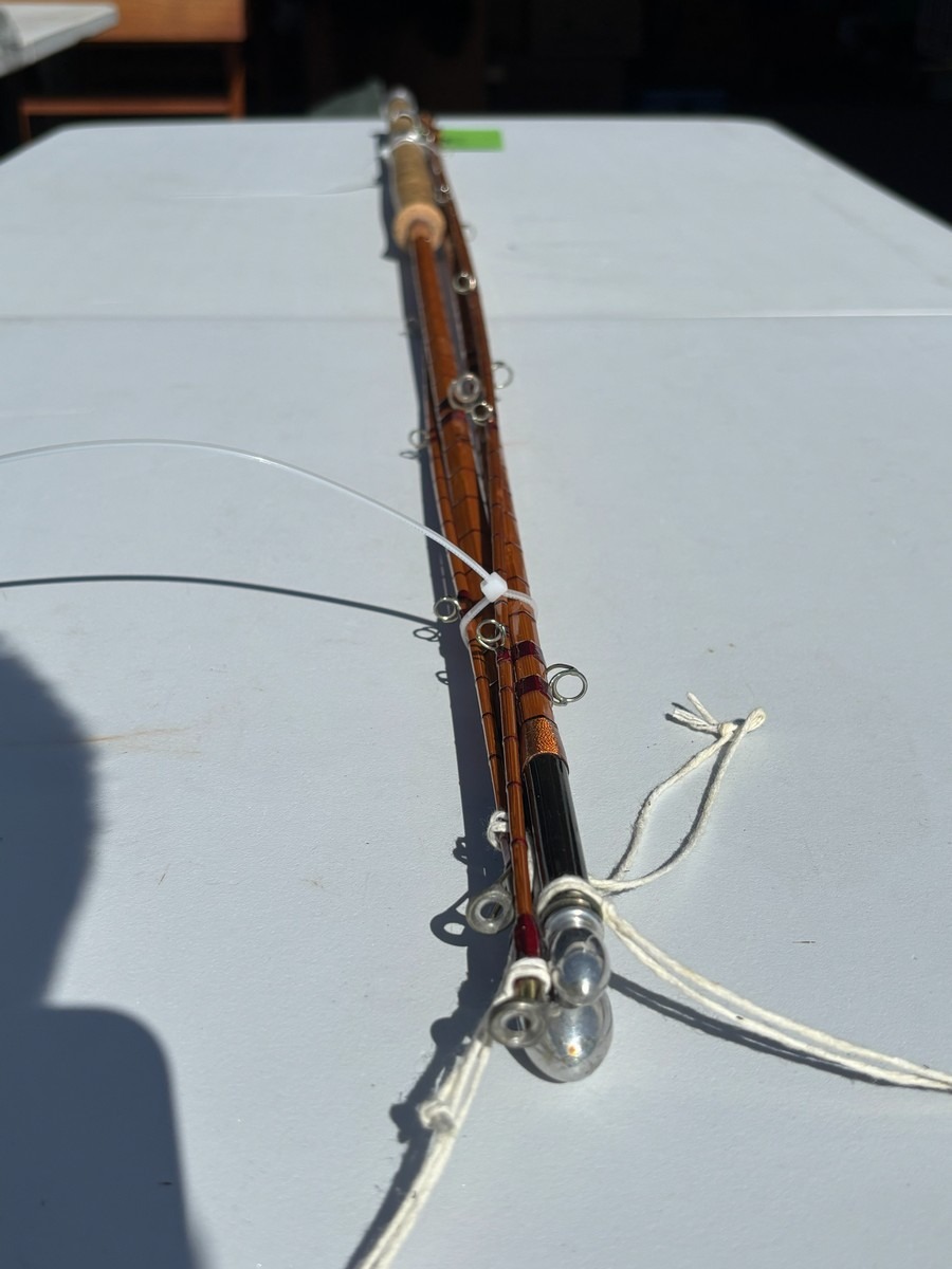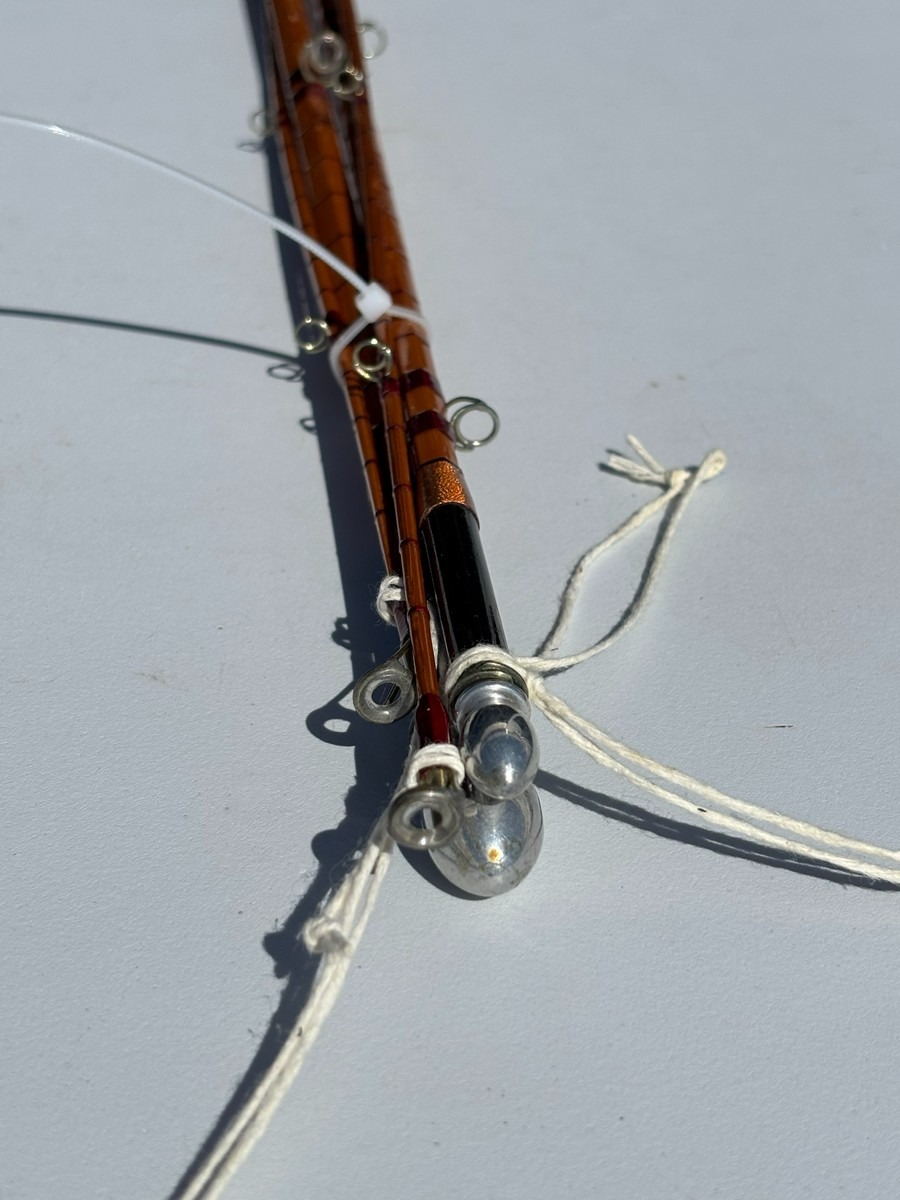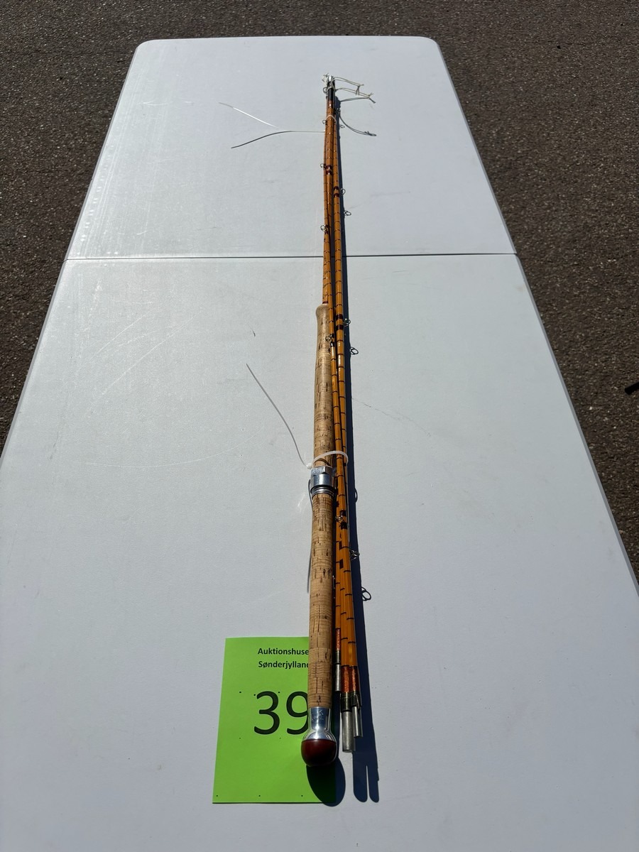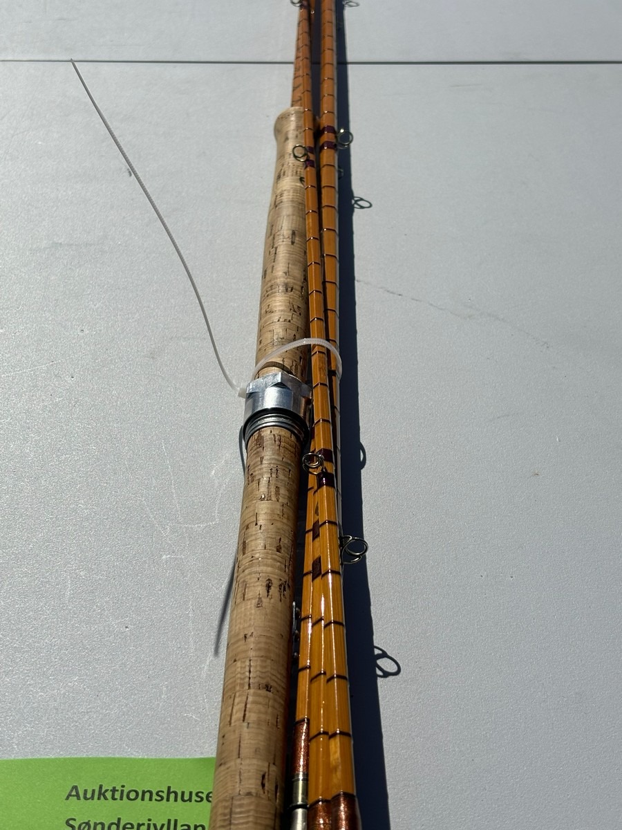 Stangen har klassiske røde beviklinger, traditionelle øjer, samt korkhåndtag med tydelig patina og originalt hjulholderbeslag i metal. Finishen fremstår velbevaret med almindelige alders- og brugsspor, men uden synlige brud eller alvorlige skader i de viste billeder.