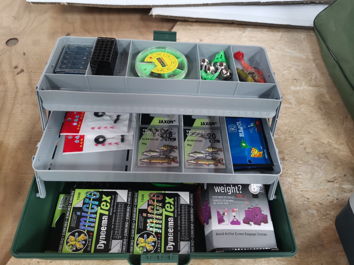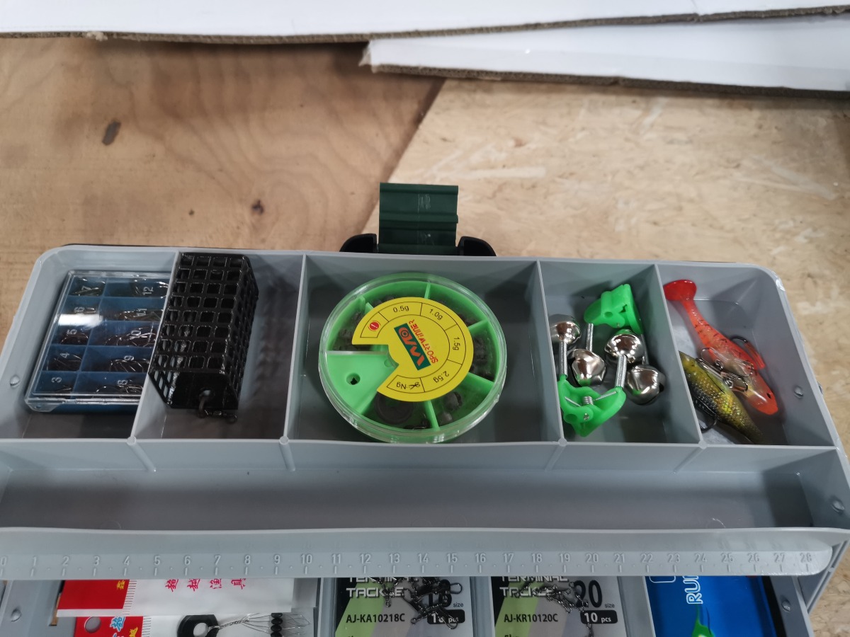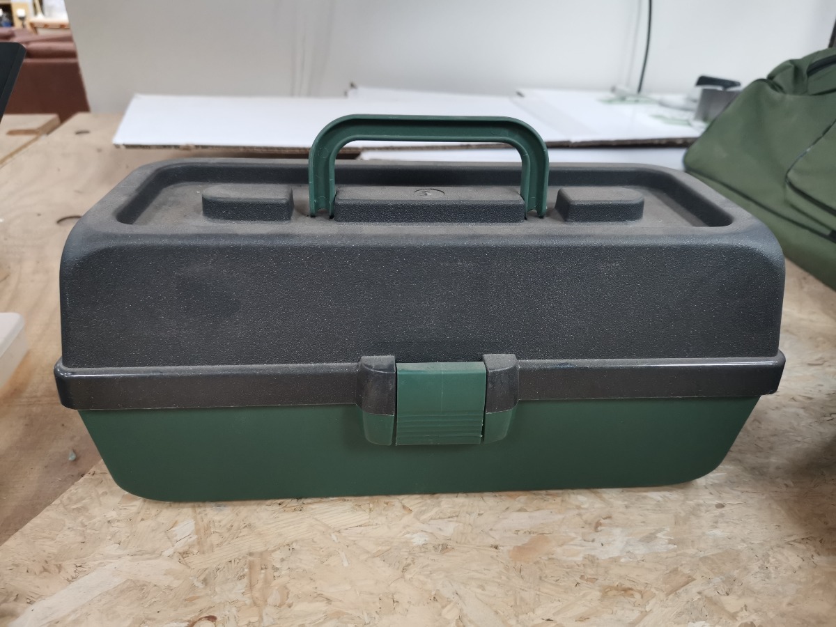 Sortimentskasse  med ca. 60 dele fiskeudstyr - indeholder kroge, blink mm. Smart fiskegrej til mange forskellige typer fiskeri. Super startboks til juniorfiskeren og begynderen. Ubrugt.  + MOMS