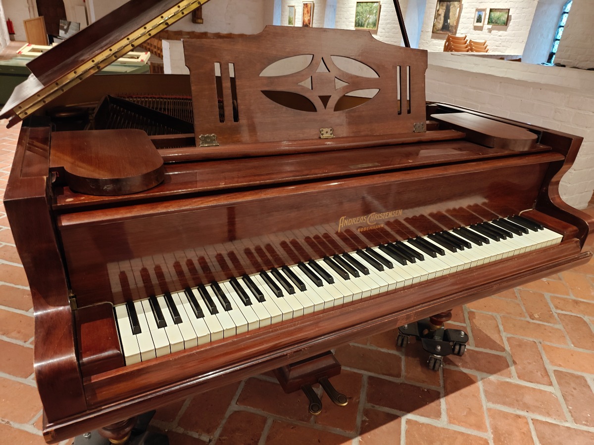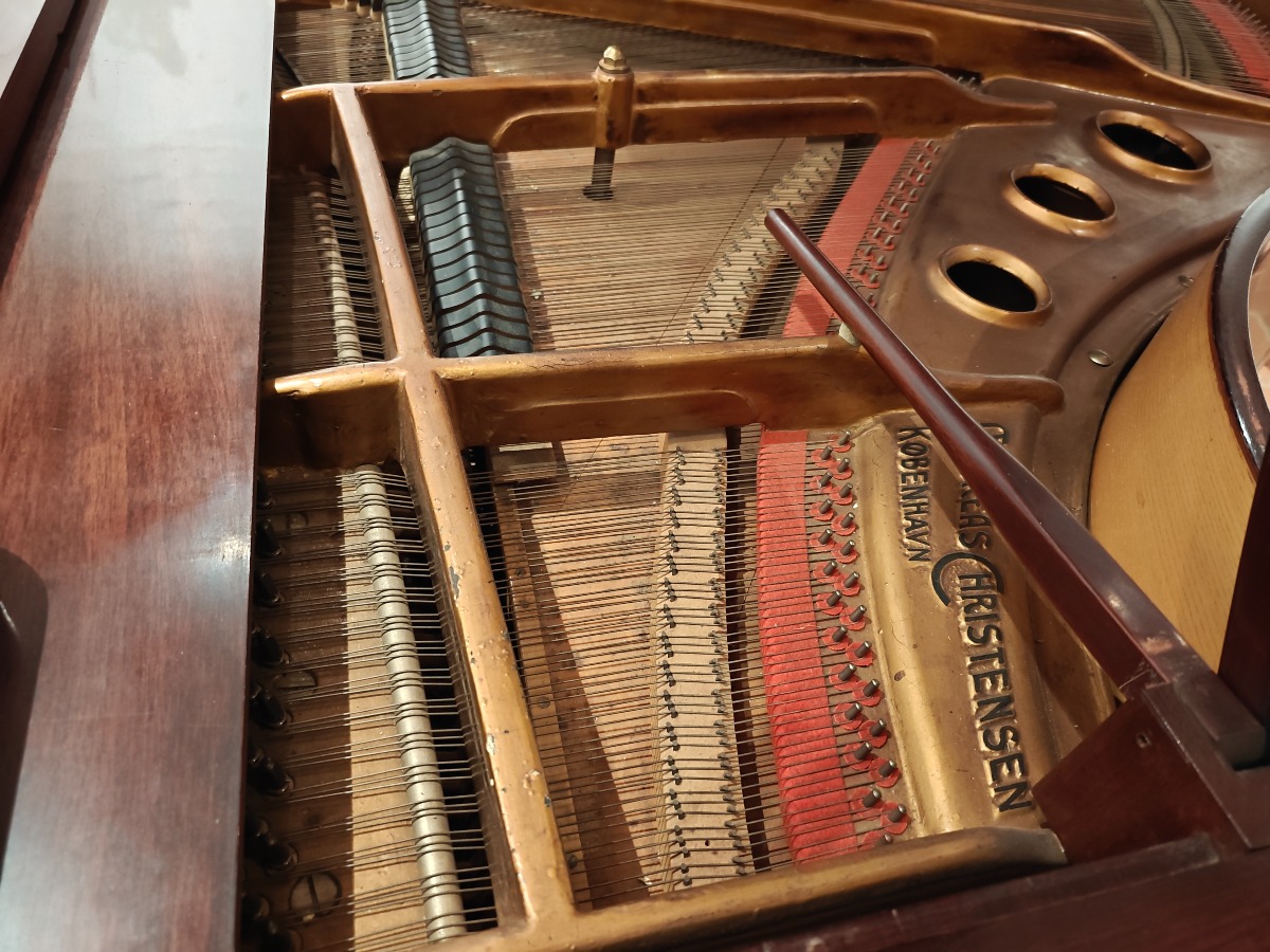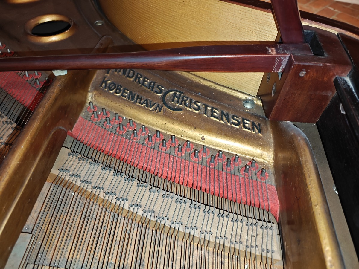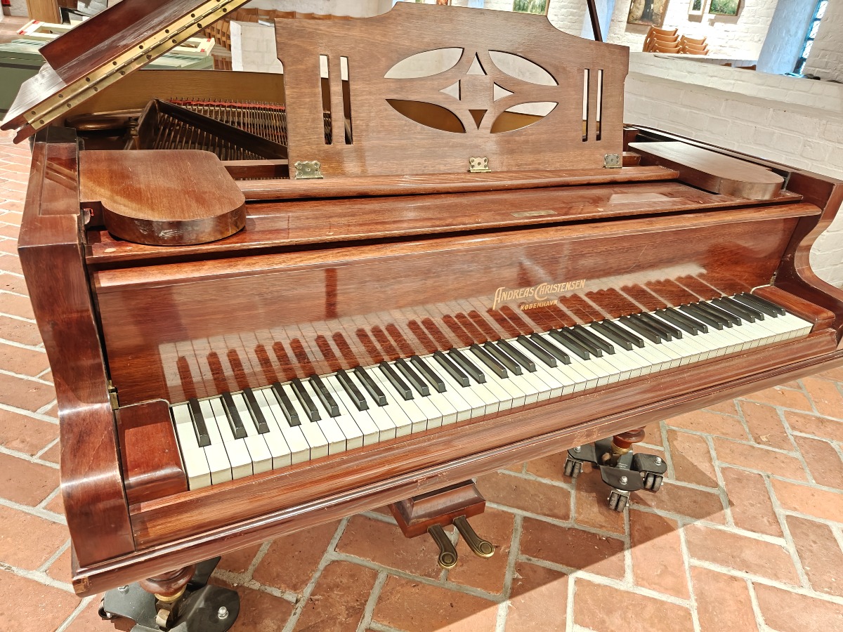 Brunt flygel.af Andreas Christensen, København. Fuld funktionsdygtig og smuk klang. Med nr 1013 stemplet i. Den er flot i lakken og har brugsspor. Har en revne i bundstykket. Smukt og elegant flygel til det private og til institutionen. Brugt. Står på 1. sal med trapper. Benene kan afmonteres og den kan flyttes af flere stærke personer.