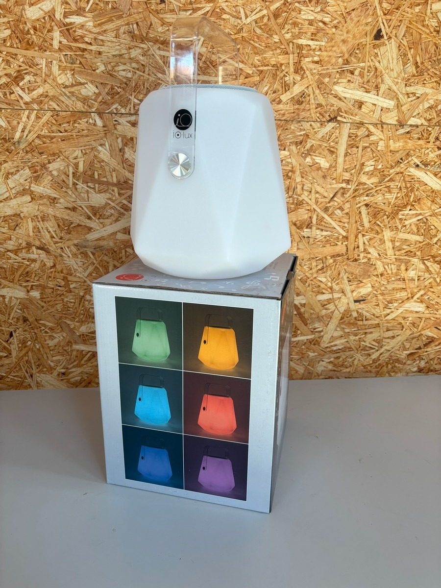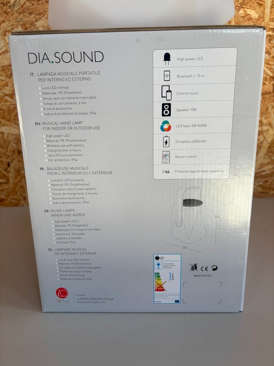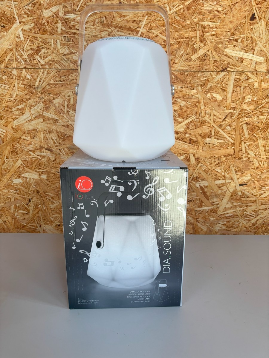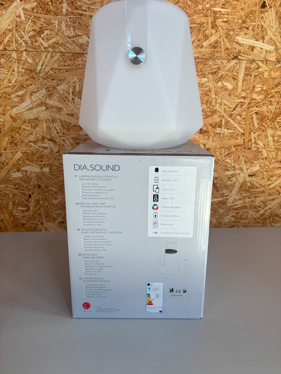 DIA.SOUND diamant højtaler / lampe m fjernbetjening. Lampen kan indstilles i forskellige farver med den medfølgende fjernbetjening og farverne kan følge rytmen af musikken, som bliver afspillet via bluetooth. Den kan både bruges inde- og udendørs. Kan spille og lyse op til 8 timer. Oplader medfølger. Den måler 22 x 30 cm. Nypris 1.095, - kr.