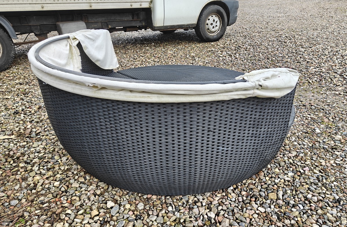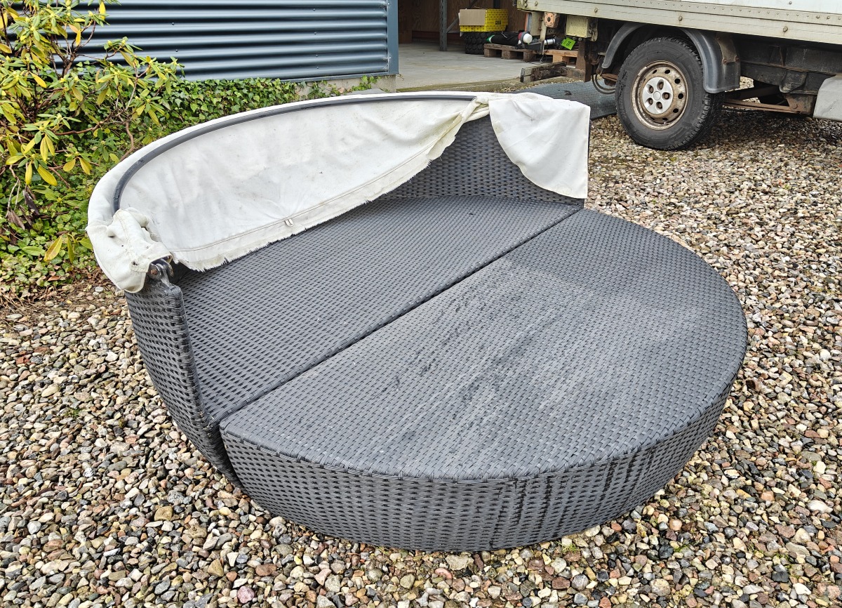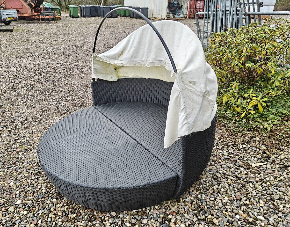 Solseng af polyrattan. 2-delt. Baldakin mørnet og skal udskiftes.