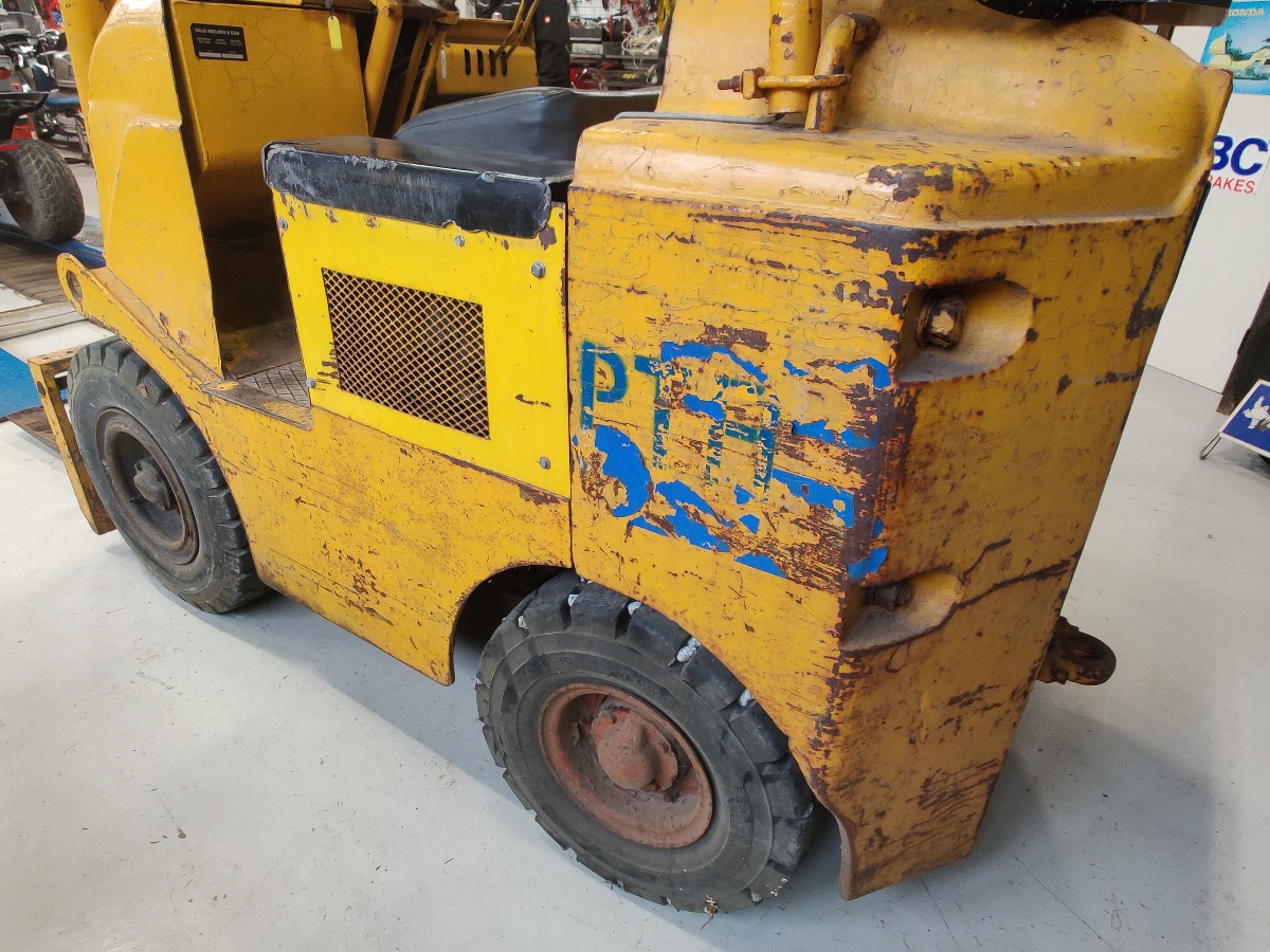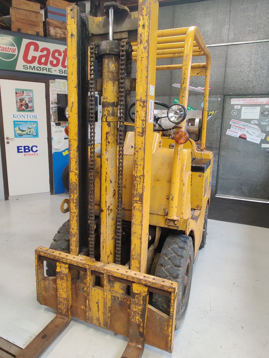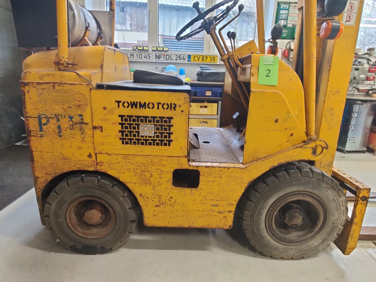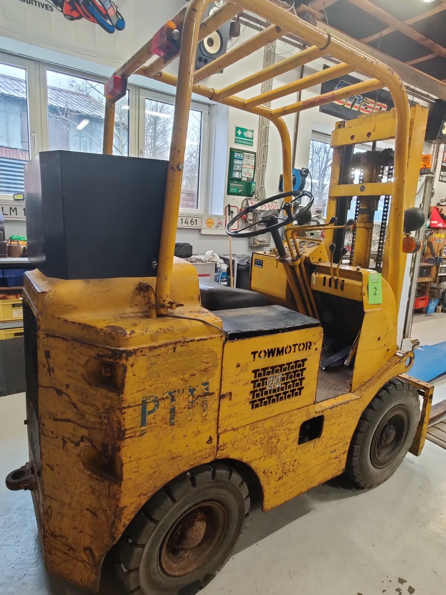 Towmotor gas gaffeltruck model: 502PG4024 oplyst løftekapacitet på ca. 1800 kg 2-trins tårn med en løftehøjde på ca 3,3 m maskinen, har kørt 6353 timer starter og kører upåklageligt står uden buler eller store skrammer kun lidt patina af tidens tand. Årgang er ukendt men maskinen er produceret i slutning af 60erne og 70erne