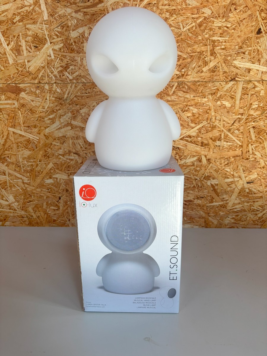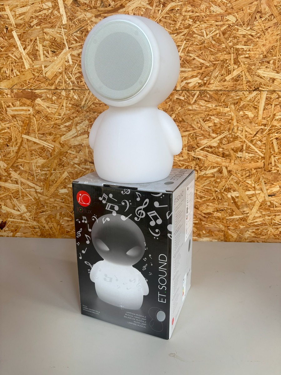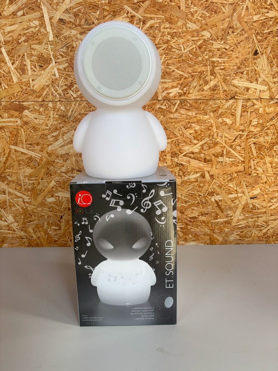 ET / rumvæsen højtaler & lampe fra Italienske Io-Lux DIA.SOUND. Lampen kan indstilles i forskellige farver med den medfølgende fjernbetjening og farverne kan følge rytmen af musikken, som bliver afspillet via bluetooth. Den kan både bruges inde- og udendørs. Kan spille og lyse op til 8 timer. Oplader medfølger. Den måler 22 x 30 cm. Nypris 1.095,- kr. Ubrugt og i original emballage