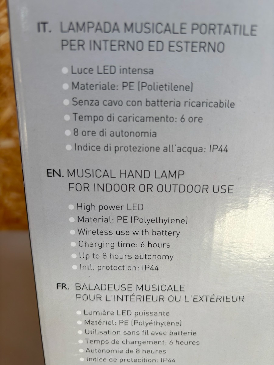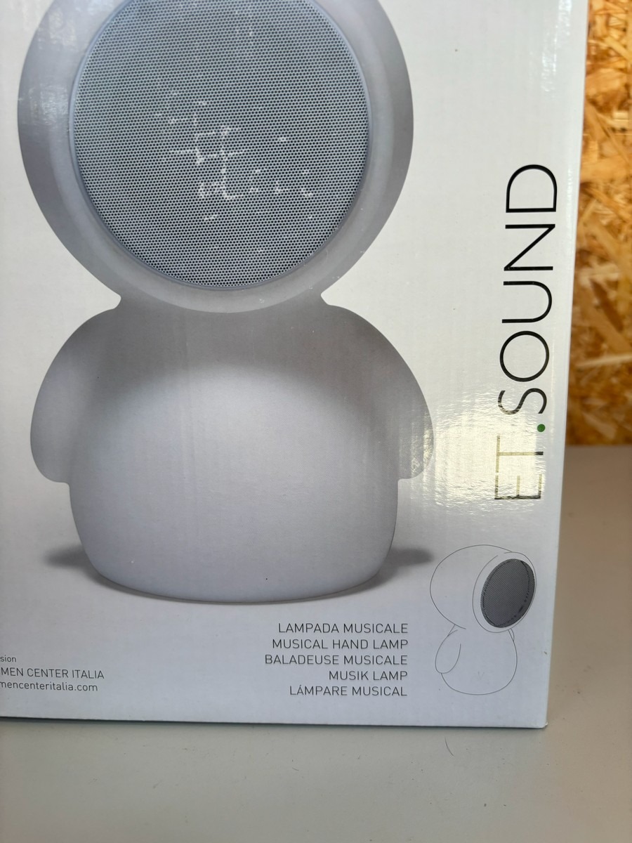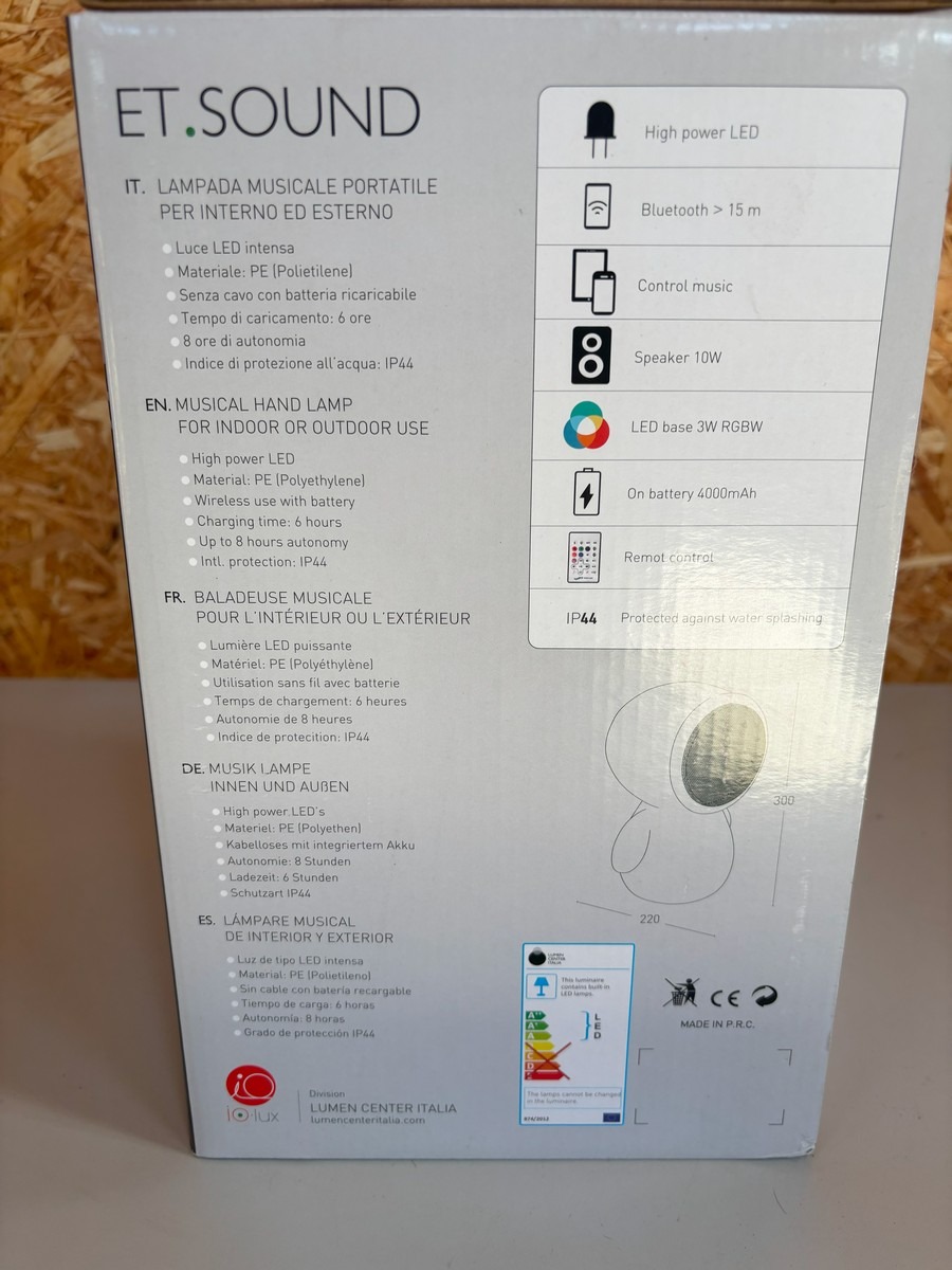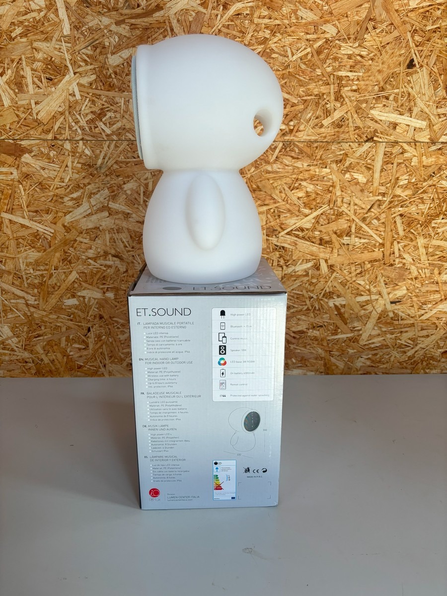 ET / rumvæsen højtaler & lampe fra Italienske Io-Lux DIA.SOUND. Lampen kan indstilles i forskellige farver med den medfølgende fjernbetjening og farverne kan følge rytmen af musikken, som bliver afspillet via bluetooth. Den kan både bruges inde- og udendørs. Kan spille og lyse op til 8 timer. Oplader medfølger. Den måler 22 x 30 cm. Nypris 1.095,- kr. Ubrugt og i original emballage