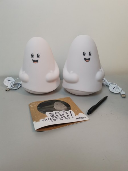 MyBoo Ghosthunter er en sød lampe og spøgelsesjæger i én. Tryk én gang, så bliver den bliver rød og begynder at søge efter spøgelser på dit værelse. Tryk en gang til, så bliver den blå og scanner rummet. Tryk igen, så bliver den grøn – dit værelse er sikkert. Lampen måler Ø14,7 x H20 cm. Samlet nypris ca. 1.400,- kr. Ubrugt og i original emballage