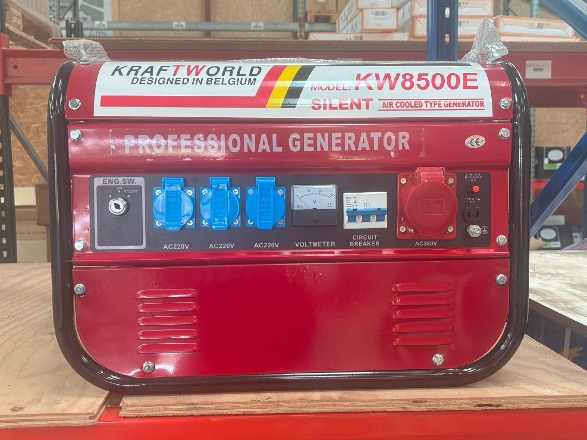 Kraftworld Benzin generator - KW8500. 1,8 KW. 50HZ. Vejer 40 kg. Silent model. Med 4 stk. stik (3 stk. AC220V og 1 stk. AC380V.) Voltmeter måler og sikring. Den er ubrugt og i original emballage.