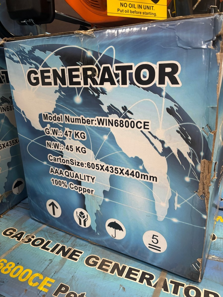 Benzin generator, 3.2 / 2.8 KVA. 220V. Vægt : 45kg. Model WIN6800CE. Ubrugt og i original emballage.