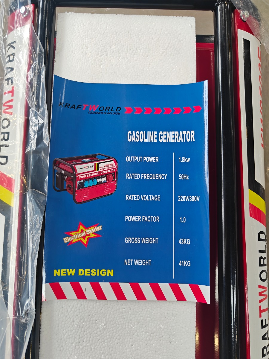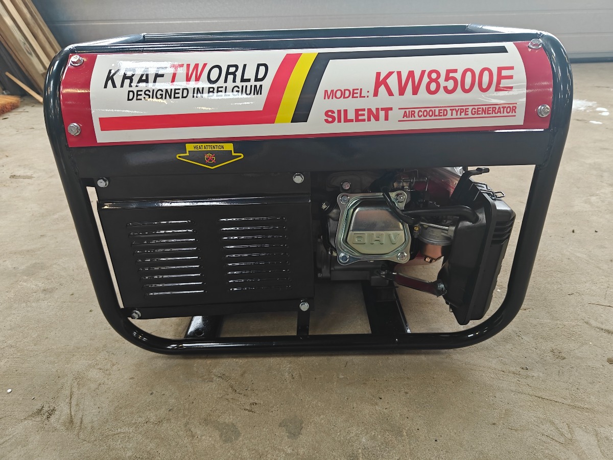 Kraftworld Benzin generator - KW8500E. 1,8 KW. 50HZ. Vejer 43 kg. Silent model. Med 4 stk. (3 stk. AC220V og 1 stk. AC380V.) Den er ubrugt og i original emballage.