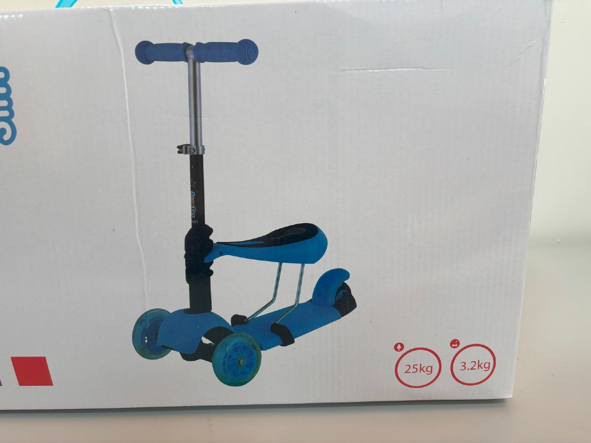 3 i 1 mini scooter i blå. Til maks 25kg. Ubrugt