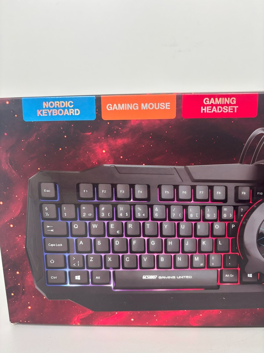 Gaming Combo Set GCS1807 med keyboard, mus og headset. NORDISK keyboard (DK/SE/NO/FI). Keyboardet og musen kan lave forskellige mønstre med flotte farver. Keyboardet er lavet på en måde, som reducerer stress i armen og håndleddet, når man spiller. Fra United. Ubrugt og i original emballage