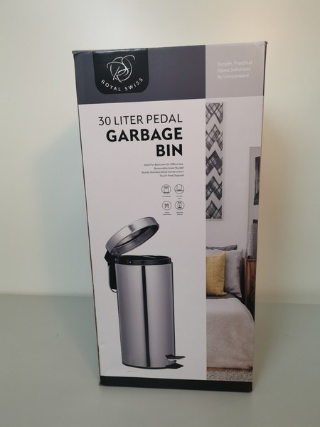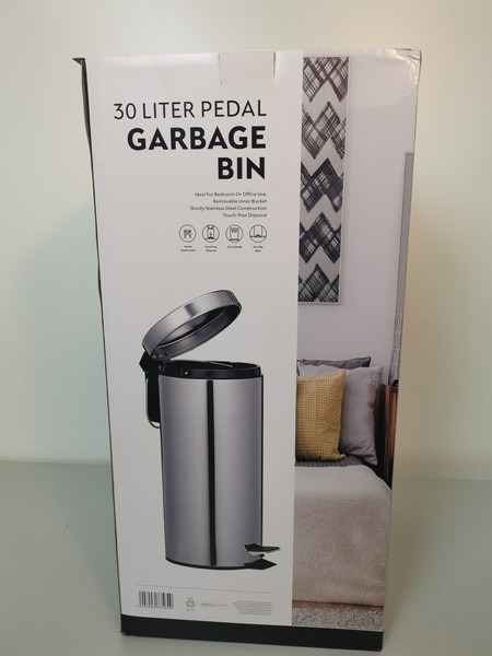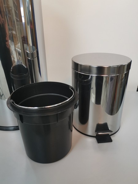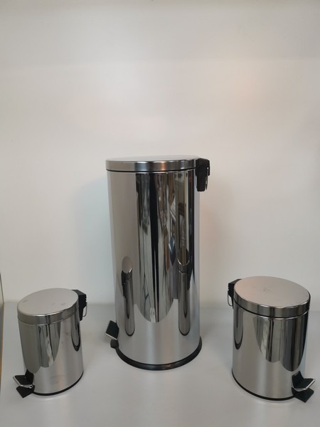 Pedalspande sæt med 3 spande i blank stål look. 3 ltr. 5 ltr. og 30 ltr. Spandene har alle spande indsats der kan løftes ud ved tømning. Ubrugt