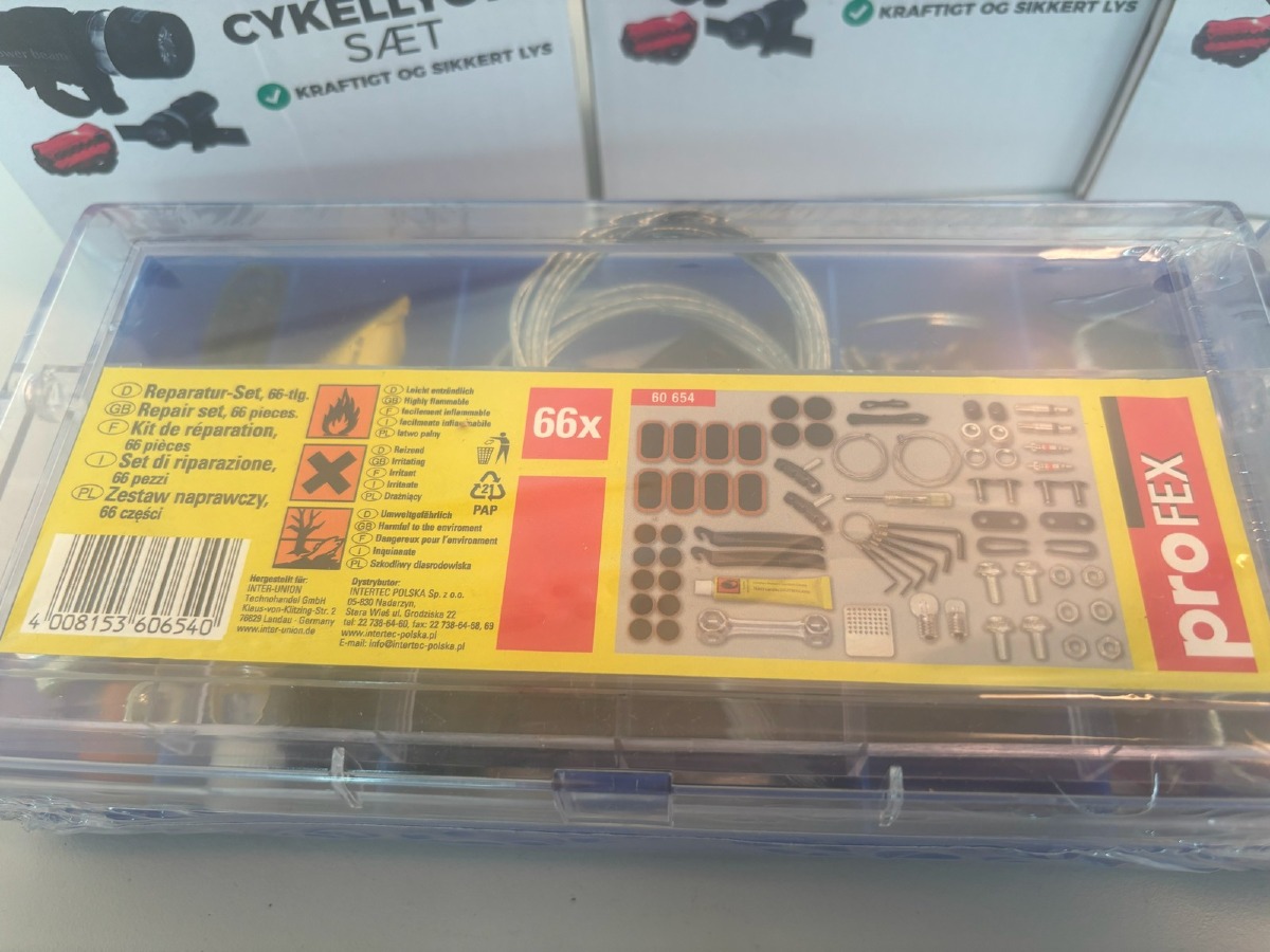 Profex cykelværktøj kasse med 66 dele, 2 stk & 4 stk. cykellygte sæt