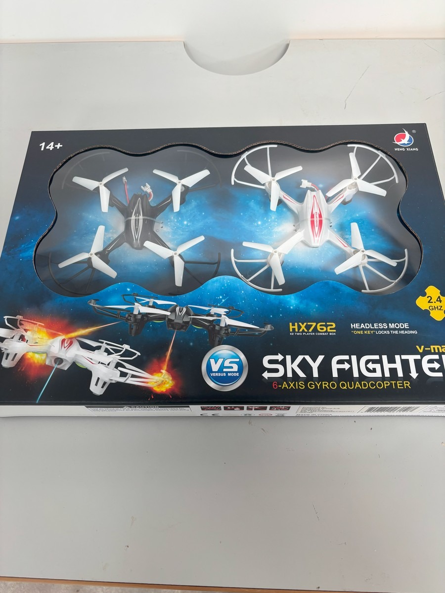 V-max Sky Fighter sæt med 2 stk. 6.Axis Gyro Quadcopter droner. HX762 X2 Player Combat Box. En sort og en hvid. 2.4 GHz. Vind- og modstandsdygtig. Holdbart materiale. Ubrugt og i original emballage