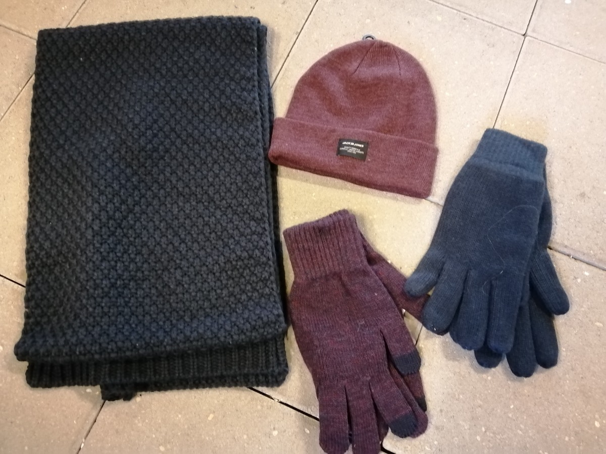Bordeaux hue (Jack&Jones), bordeaux Jack&Jones handsker med touch, blå Only and sons handsker og blå halstørklæde (Only and sons).Ubrugte, stadig med mærker