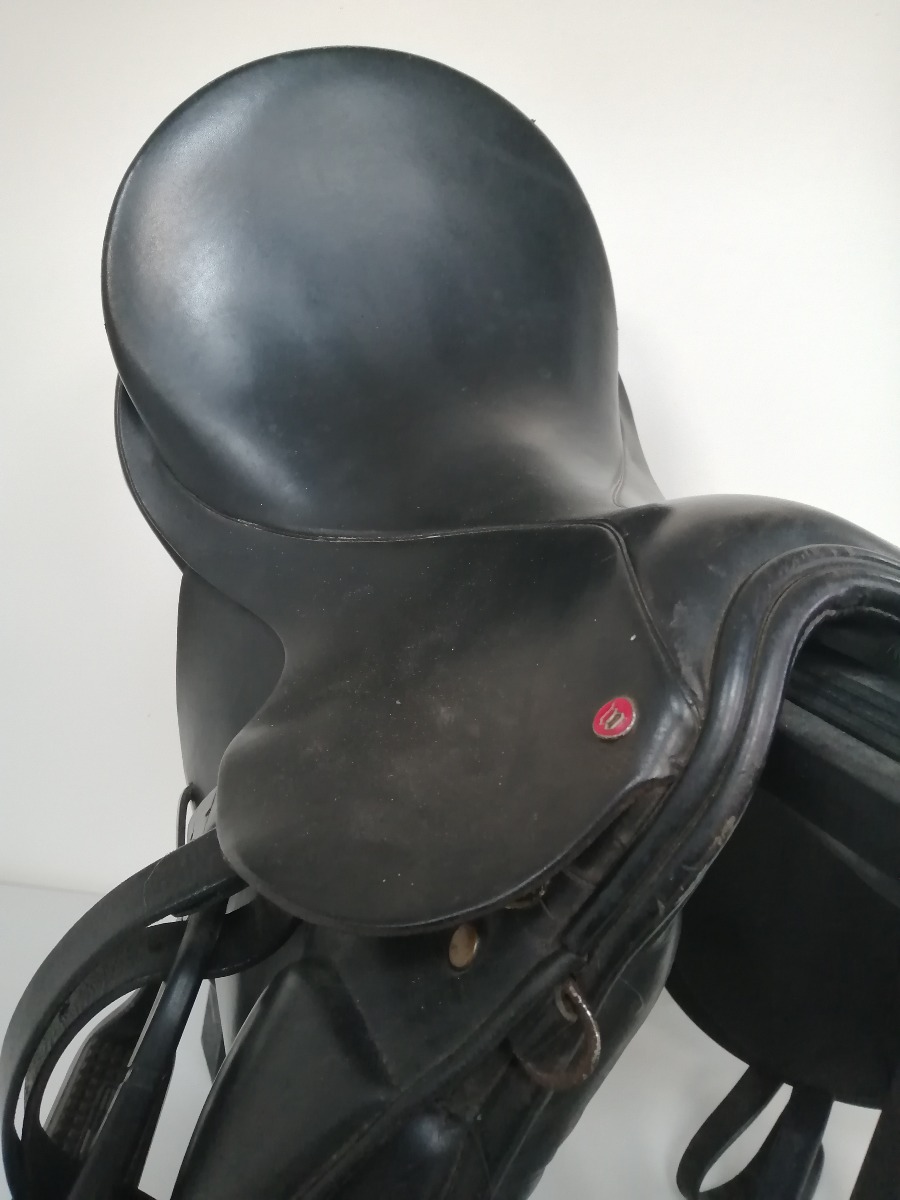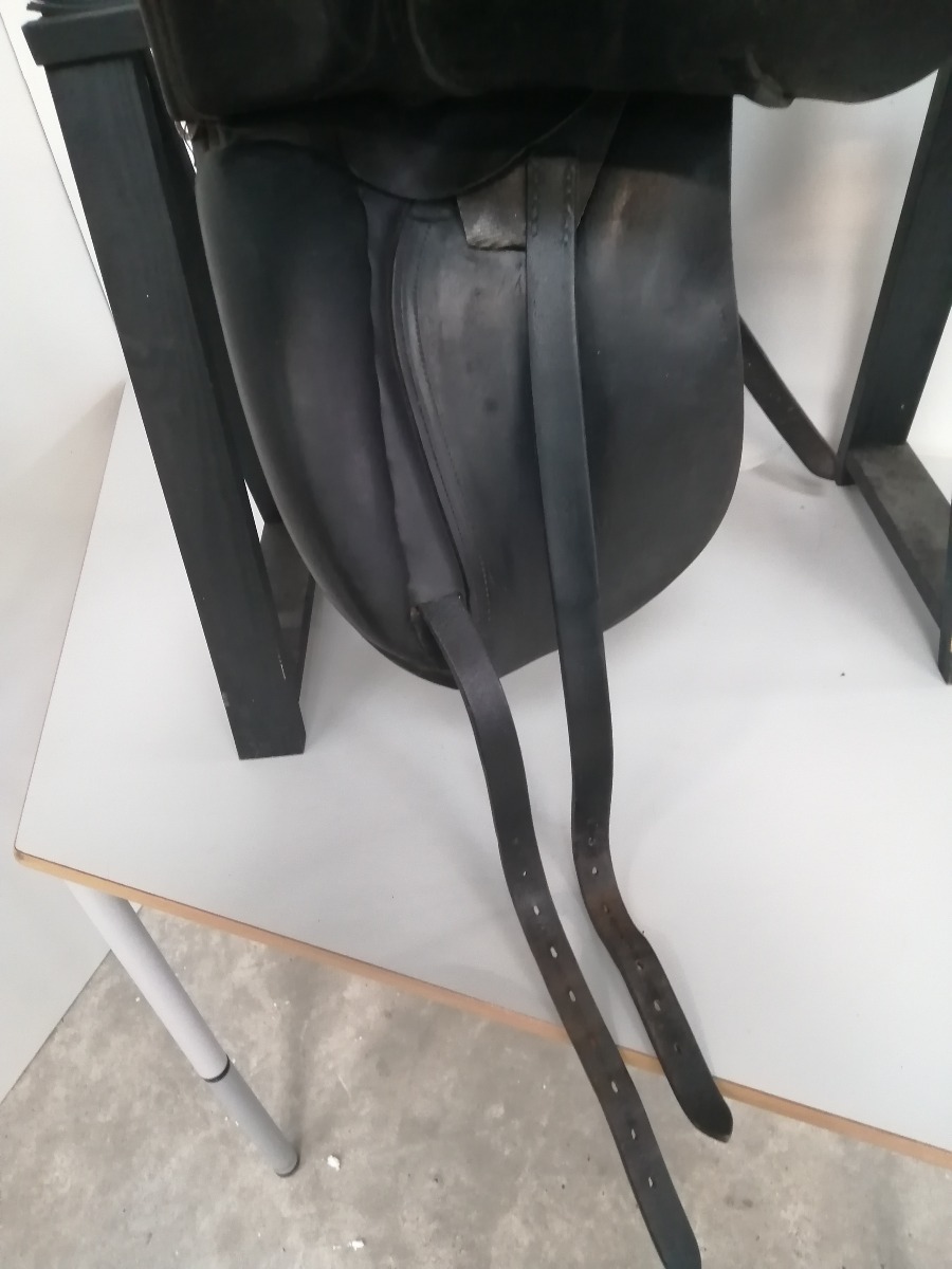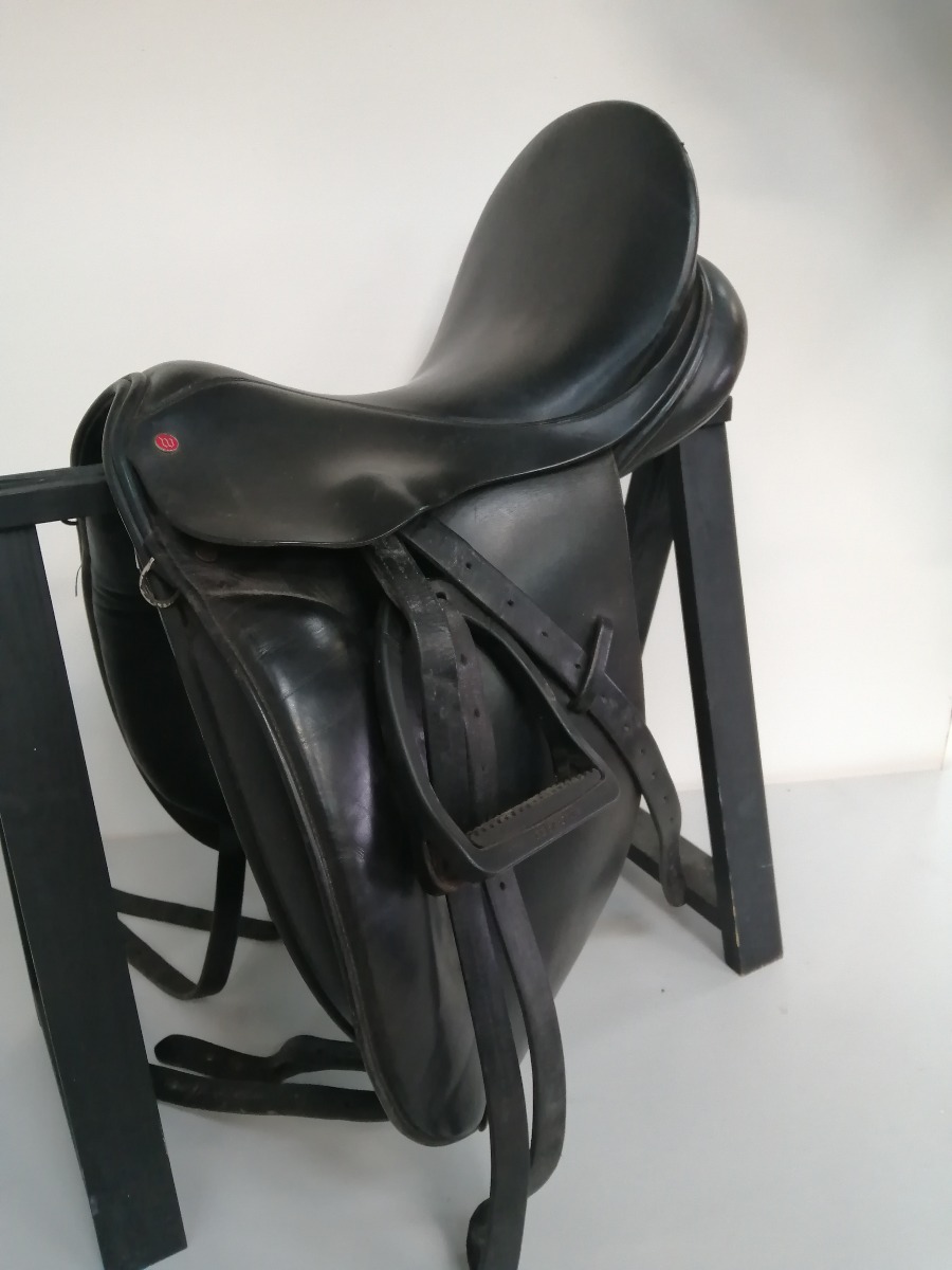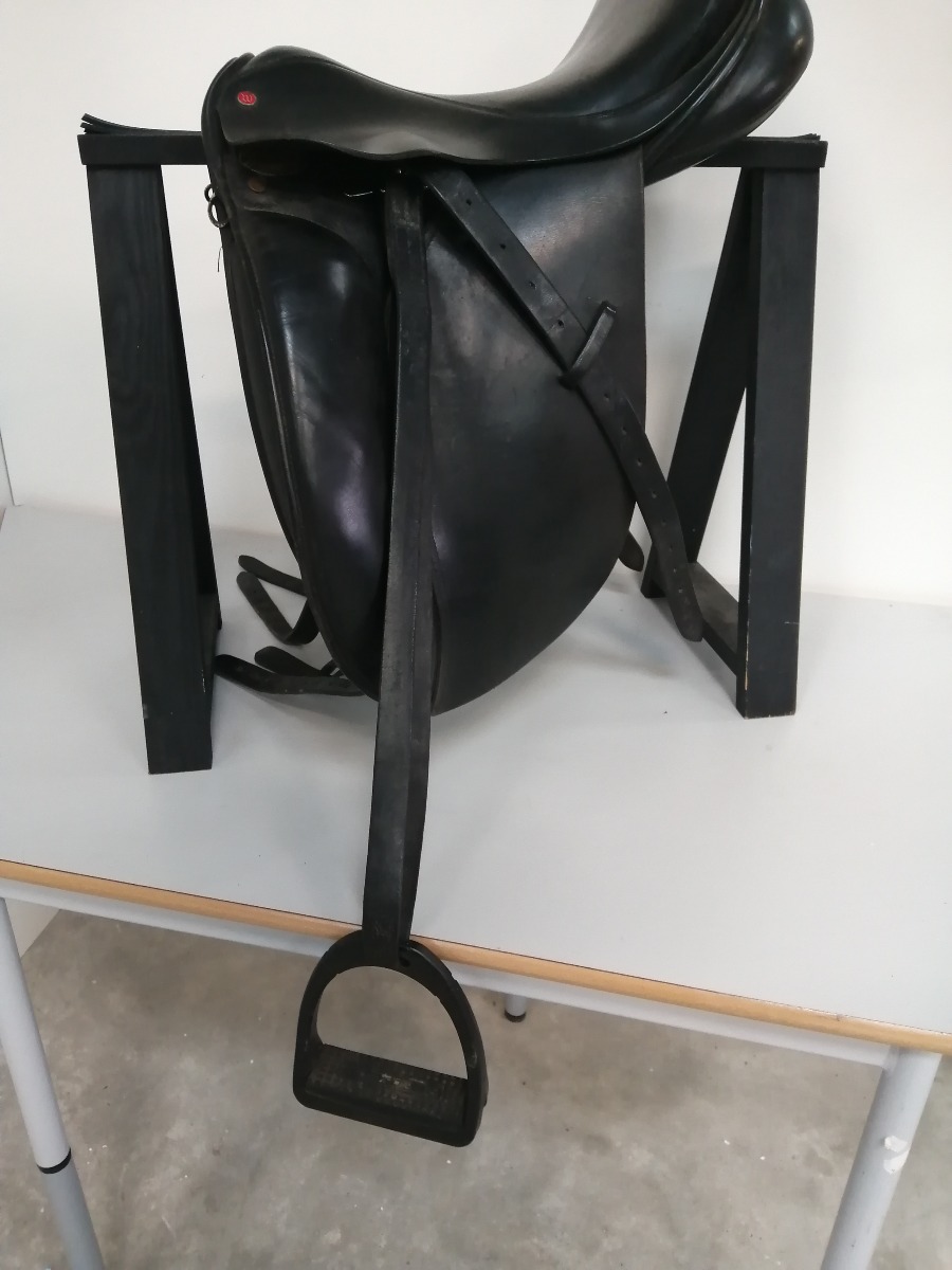 Windsor dressursadel med stigbøgler af mærket Flex-on Green Composite - de har skridsikker trædeflade. Sadlen er brugt og har diverse brugsspor.