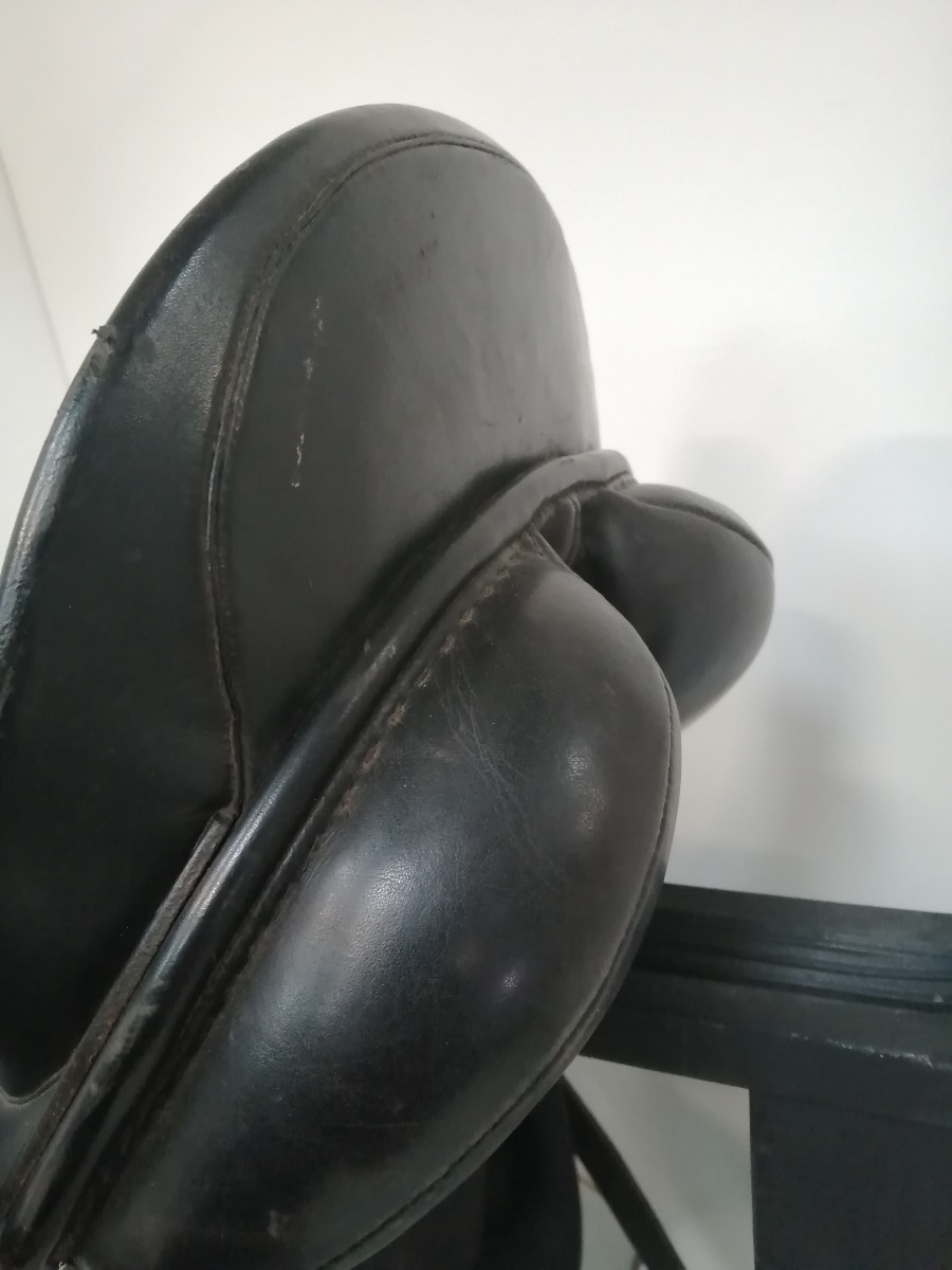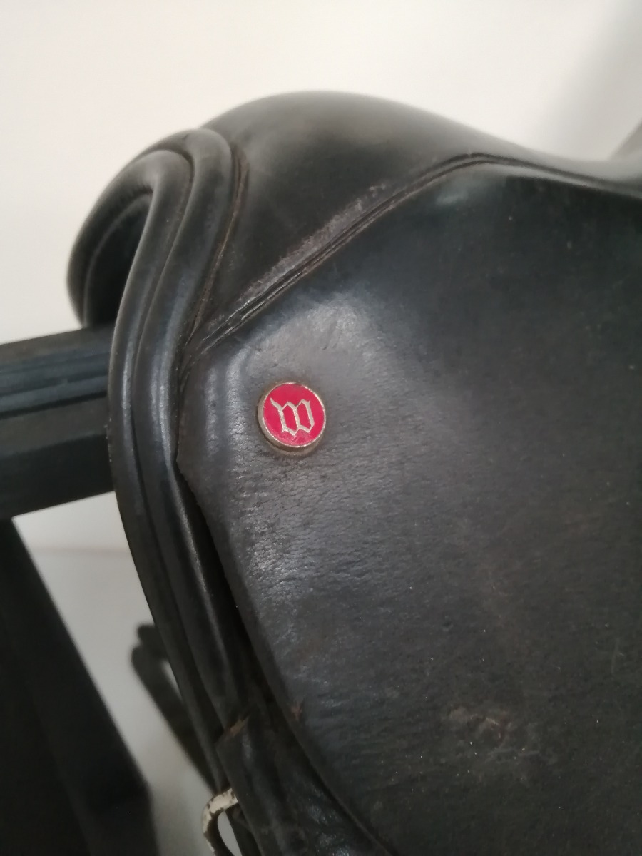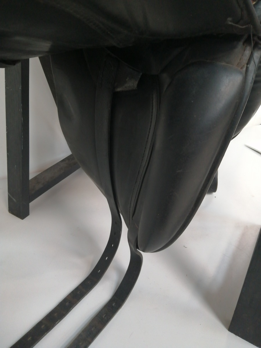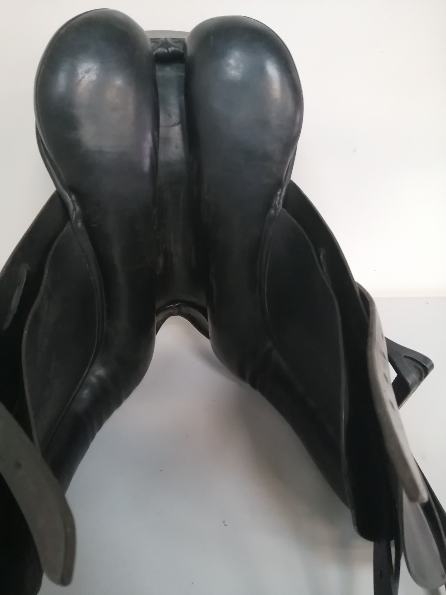 Windsor dressursadel med stigbøgler af mærket Flex-on Green Composite - de har skridsikker trædeflade. Sadlen er brugt og har diverse brugsspor.